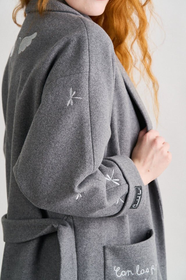 El verdadero protagonismo lo tienen sus bordados de mariposas en tonos rosados y malva, cuidadosamente trabajados en la manga, que aportan un aire delicado, femenino y artístico. Un detalle especial que convierte este abrigo en una pieza única, ideal para mujeres que buscan diferenciarse con elegancia.