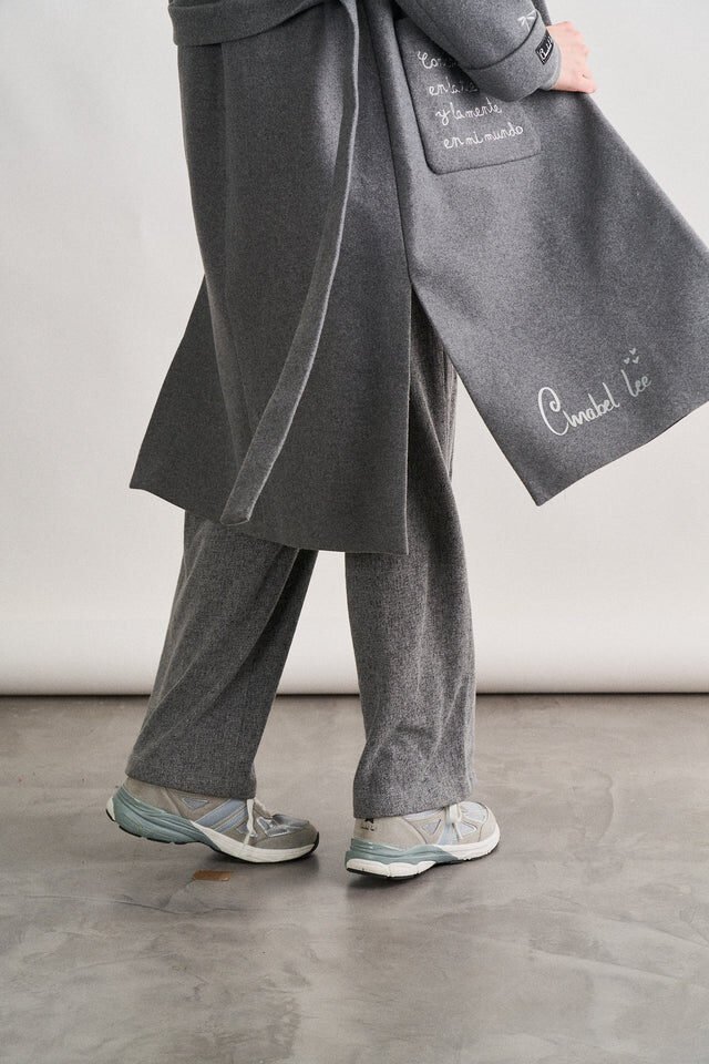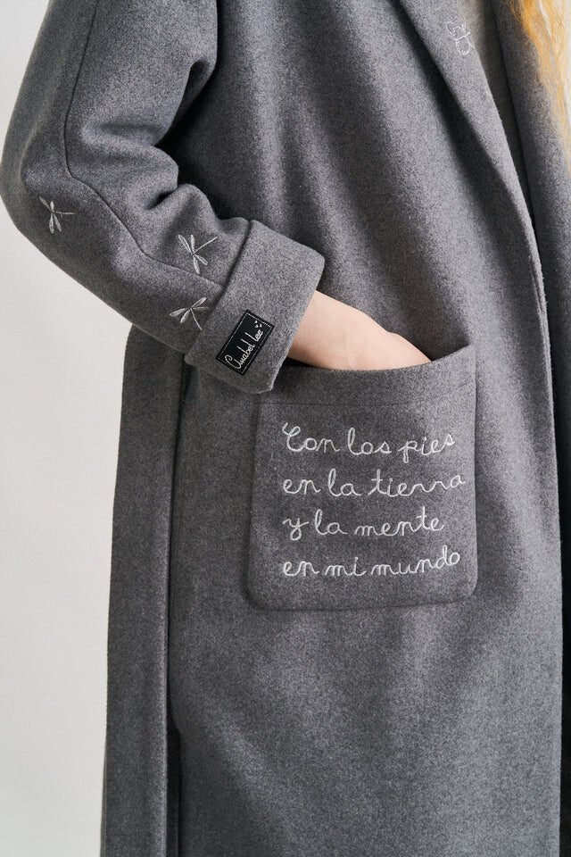 •Abrigo largo de corte recto, manga larga con vuelta y cuello de solapa. Aberturas laterales y cierre delantero con cordón. Bolsillos delanteros con frase bordada en el lado derecho. Forro interior personalizado con logo Anabel Lee y mariposas. Etiquetas de Edición Limitada en hilo plateado. Ilustración bordada en la parte de atrás, en manga izquierda y en la solapa derecha. Con la frase “Con los píes en la tierra y la mente en mi mundo”.