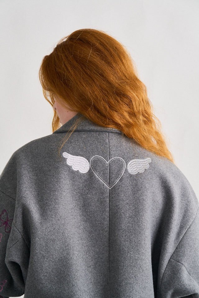 Fácil de combinar con pantalones amplios, looks casuales o conjuntos más urbanos, este abrigo gris bordado es ideal tanto para el día a día como para ocasiones en las que quieres aportar un toque sofisticado sin renunciar a la comodidad.