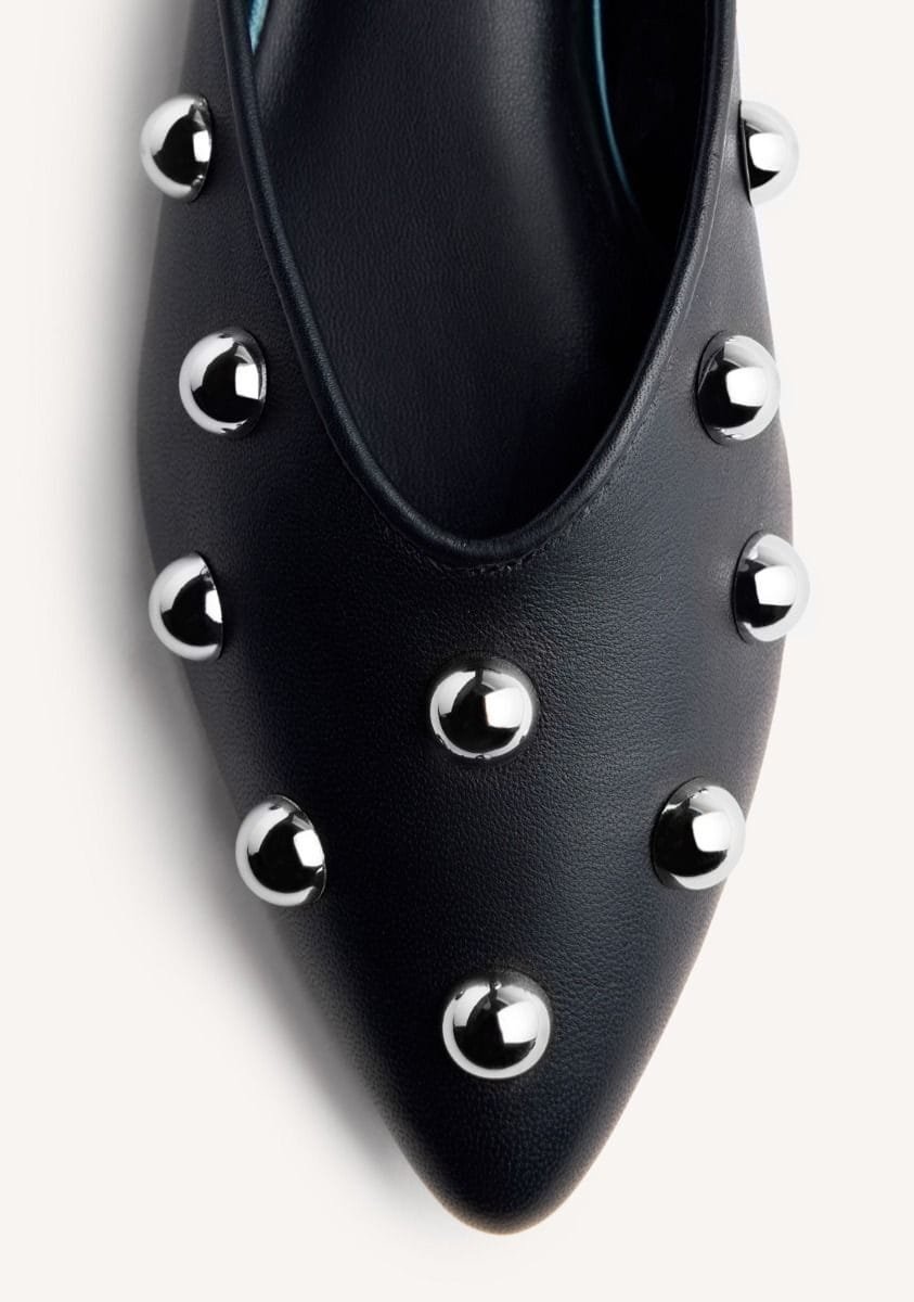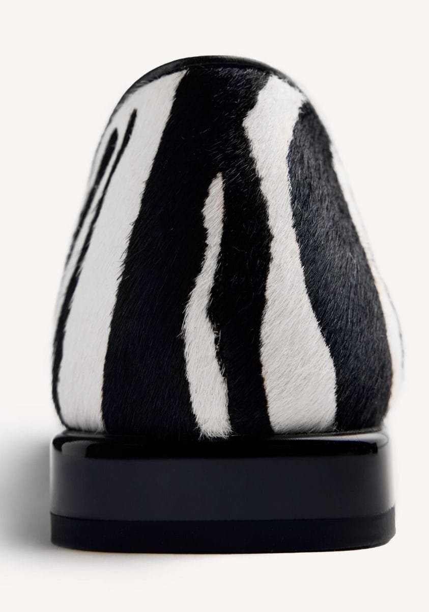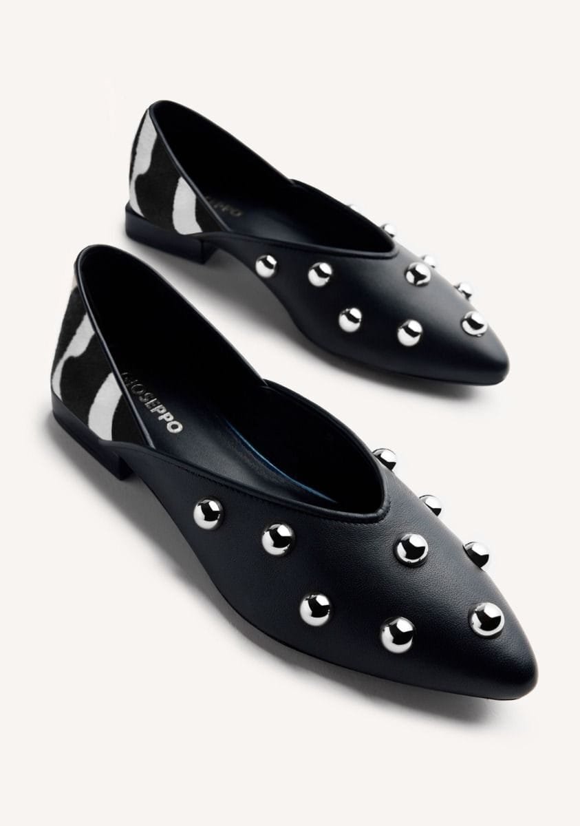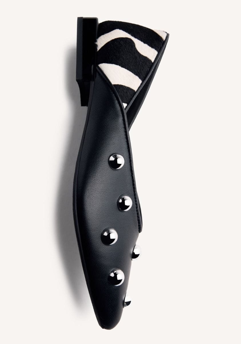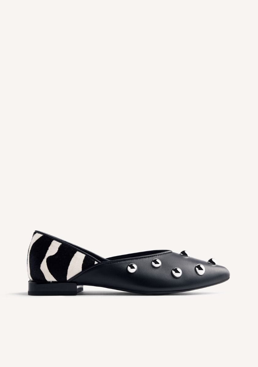 Bailarinas de piel con tachas plateadas y estampado de cebra tipo pelo. Punta afilada. Cuentan con planta acolchada. Altura tacón: 1,5 cm.