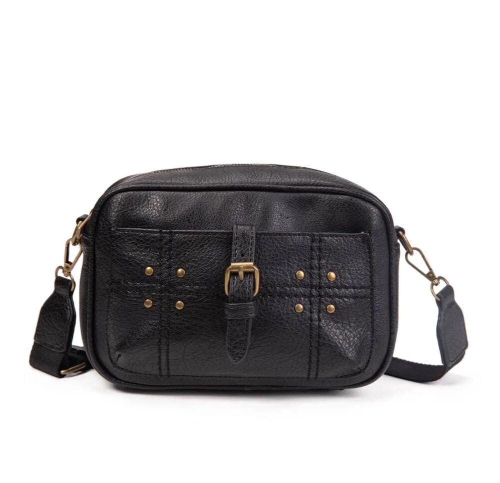 🔸 Bolsillo delantero con hebilla decorativa y tachuelas metálicas.