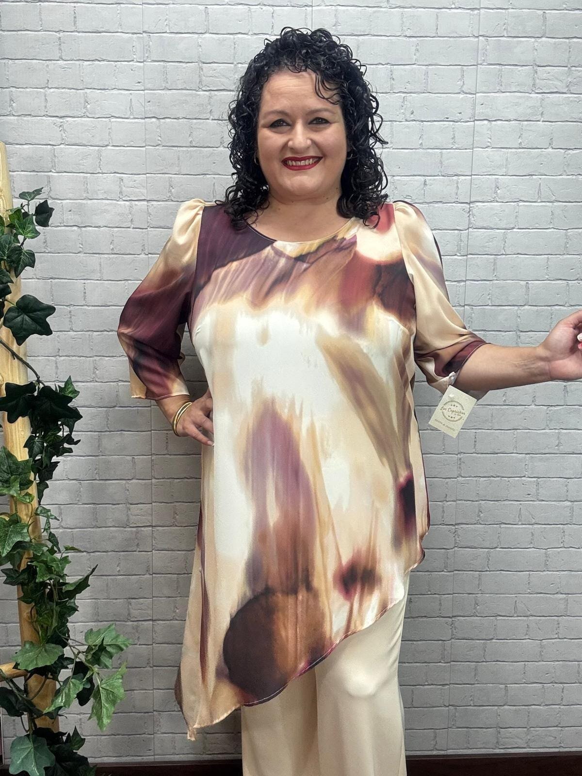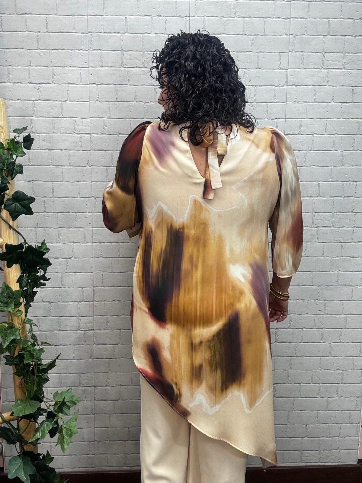 Esta blusa asimétrica con estampado artístico en tonos tierra es ideal para realzar tu estilo con un toque sofisticado y original. Su corte diagonal estiliza la silueta y aporta movimiento, mientras que las mangas 3/4 con ligero volumen equilibran la figura de forma favorecedora. Confeccionada en una tela ligera de caída suave, es perfecta tanto para eventos como para un look elegante de oficina. El detalle en la espalda le da un acabado femenino y moderno. Te encantará por su diseño único, su comodidad y la forma en que realza tu seguridad al vestir. ¡Y además está disponible en tallas inclusivas!