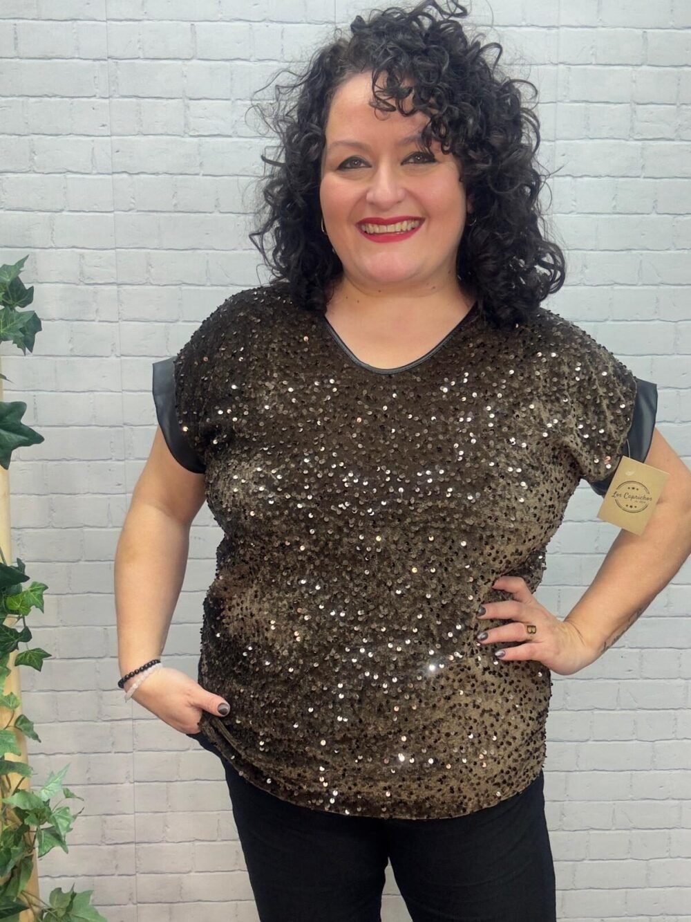 Esta camiseta de lentejuelas curvy es la prenda perfecta para brillar con confianza en cualquier ocasión especial. Diseñada pensando en mujeres reales, su corte favorecedor se adapta al cuerpo sin marcar, realzando la silueta con comodidad y estilo.