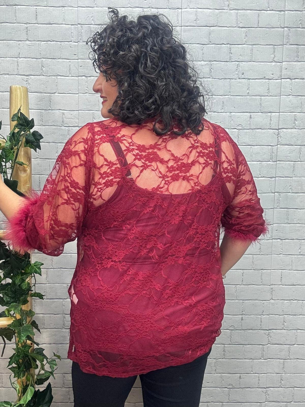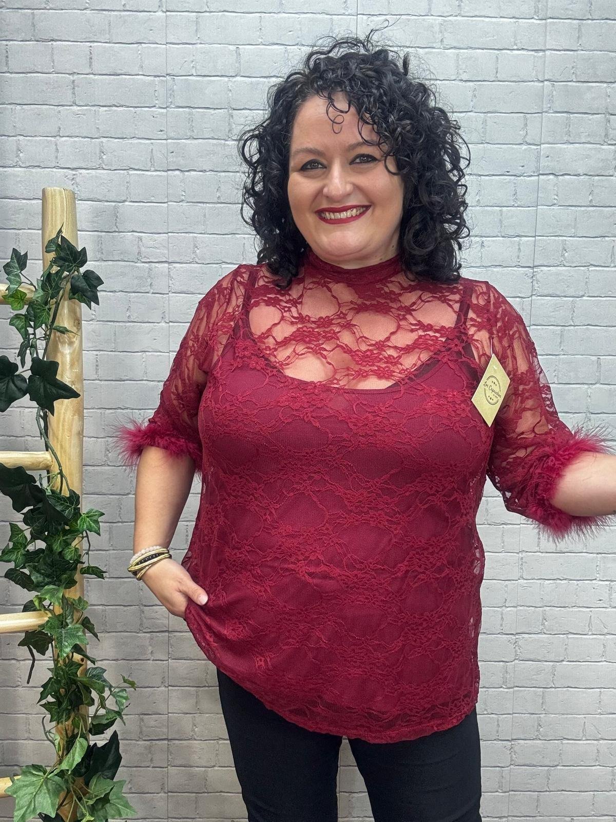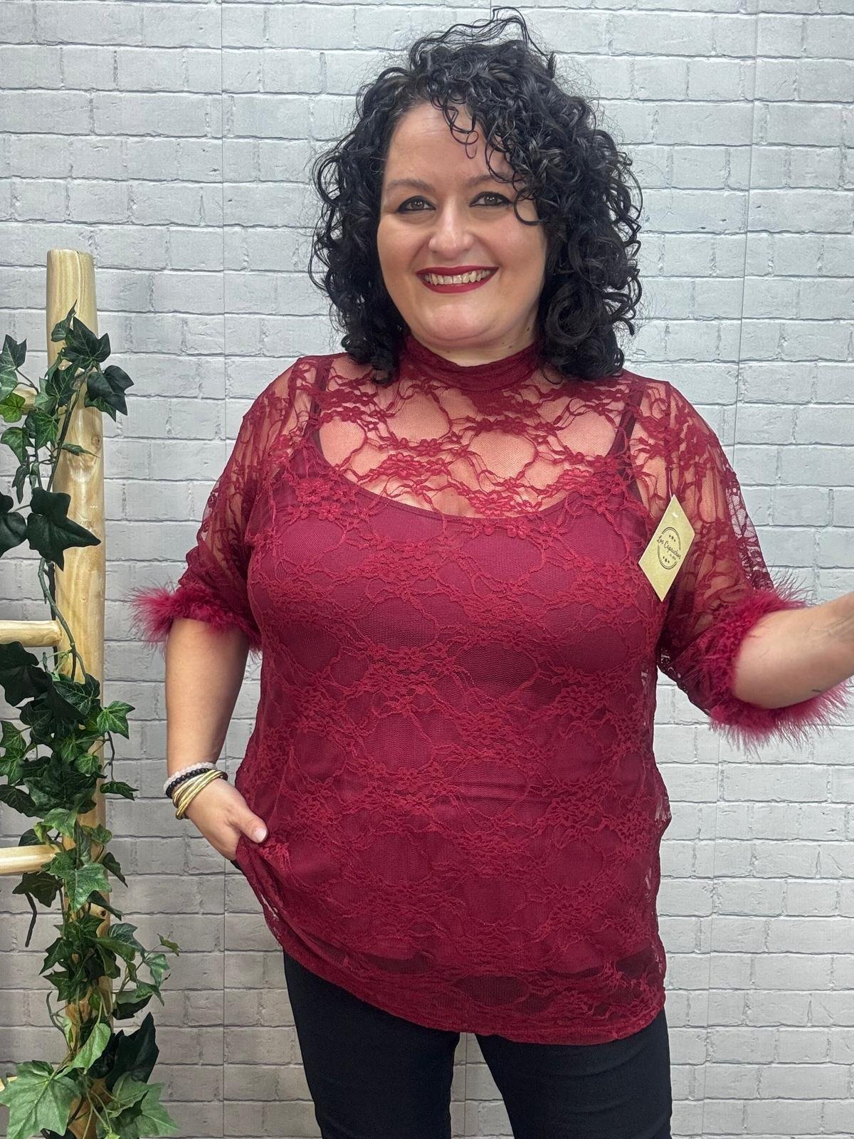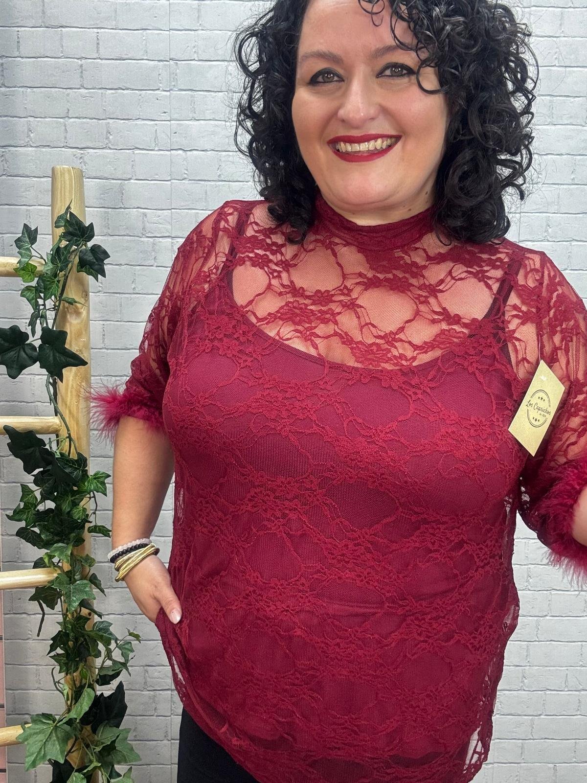 Luce espectacular con esta blusa de encaje negro o burdeos con plumas en los puños, una prenda pensada para realzar la belleza curvy con estilo y comodidad. Su tejido de encaje transparente aporta un toque sofisticado y sensual, mientras que los detalles de pluma en las mangas añaden un aire glamuroso y actual. Perfecta para combinar con un top liso debajo o un bralette, y crear looks tanto de noche como de fiesta.