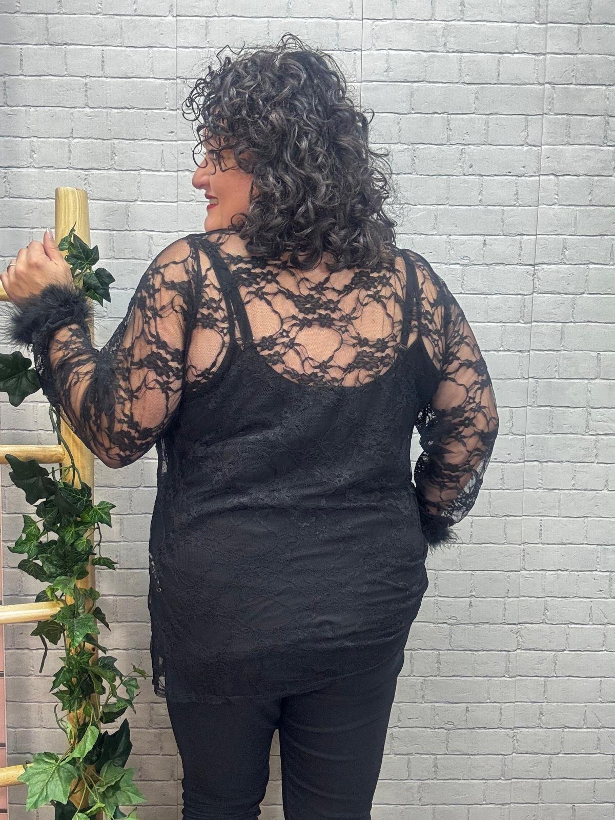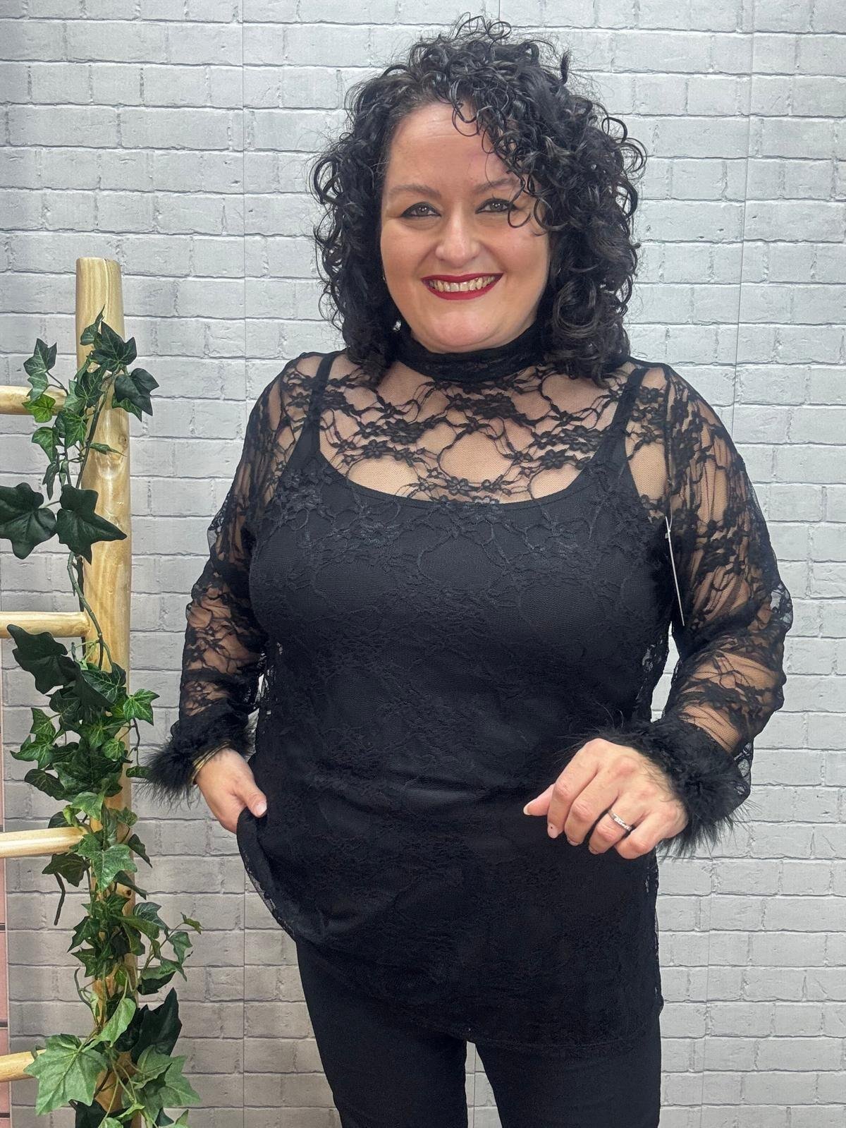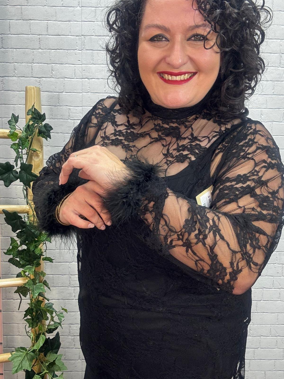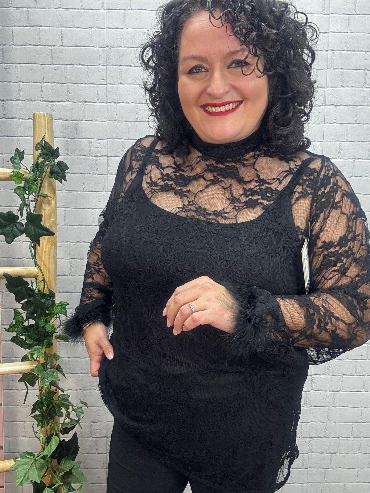 Luce espectacular con esta blusa de encaje negro o burdeos con plumas en los puños, una prenda pensada para realzar la belleza curvy con estilo y comodidad. Su tejido de encaje transparente aporta un toque sofisticado y sensual, mientras que los detalles de pluma en las mangas añaden un aire glamuroso y actual. Perfecta para combinar con un top liso debajo o un bralette, y crear looks tanto de noche como de fiesta.