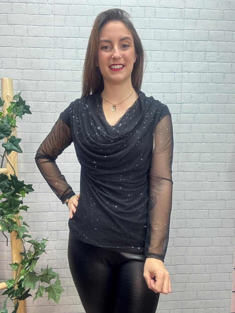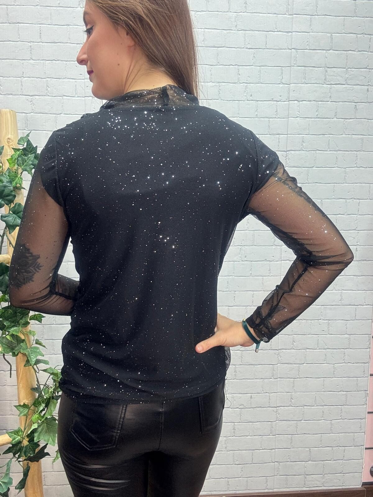 Esta blusa negra con brillo discreto es ese fondo de armario especial que transforma cualquier conjunto en un look sofisticado sin esfuerzo. Su escote drapeado tipo cascada aporta movimiento y estiliza la zona del pecho, mientras que las mangas largas de tul semitransparente con destellos añaden un toque femenino y elegante irresistible.