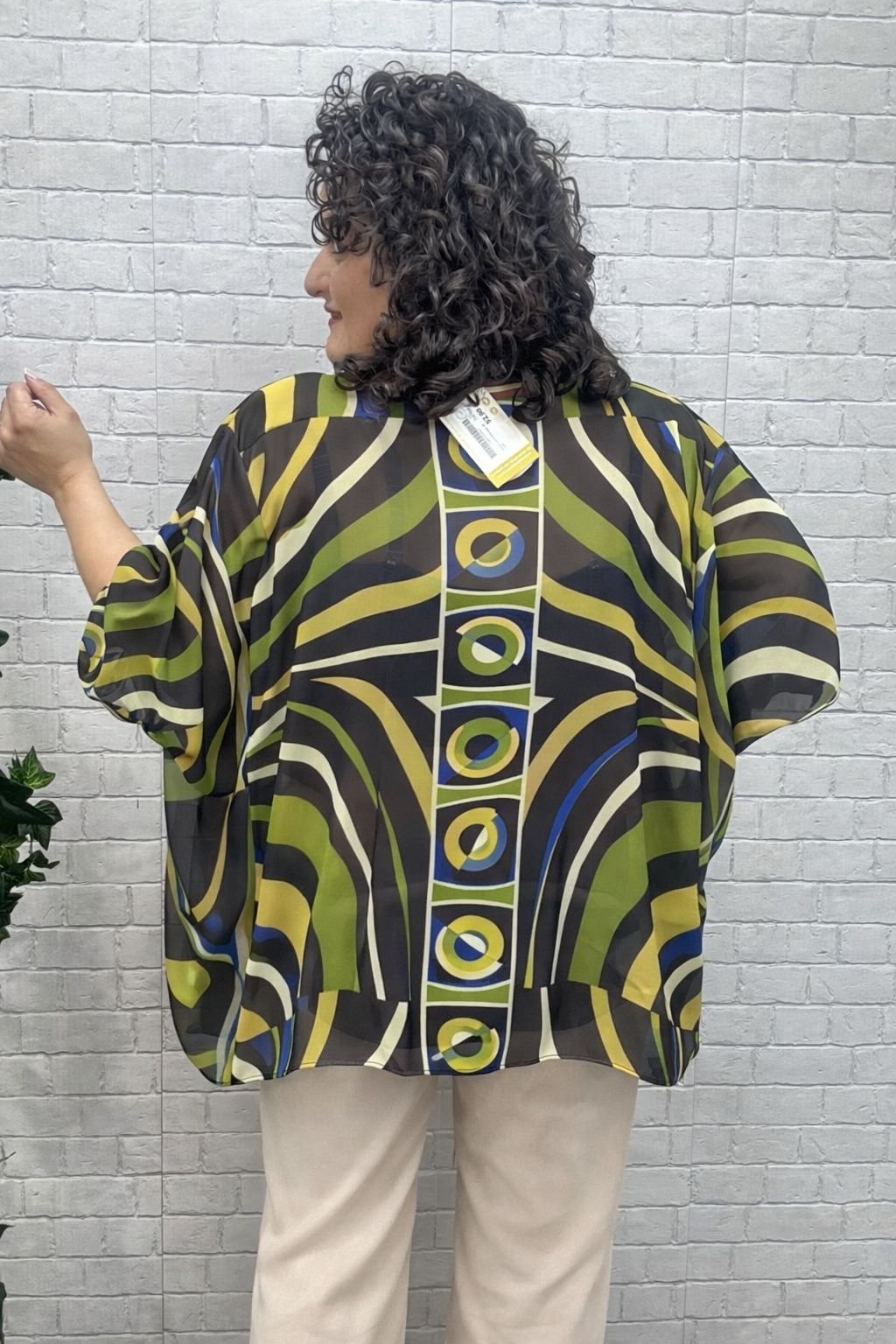 Su estampado geométrico en tonos verdes, azul profundo y beige crea un efecto visual estilizador que alarga la figura y aporta equilibrio. El detalle vertical central aporta un efecto óptico que estiliza el torso, mientras que su corte amplio y manga tipo murciélago proporcionan libertad de movimiento y una caída elegante que no marca y favorece todas las curvas.