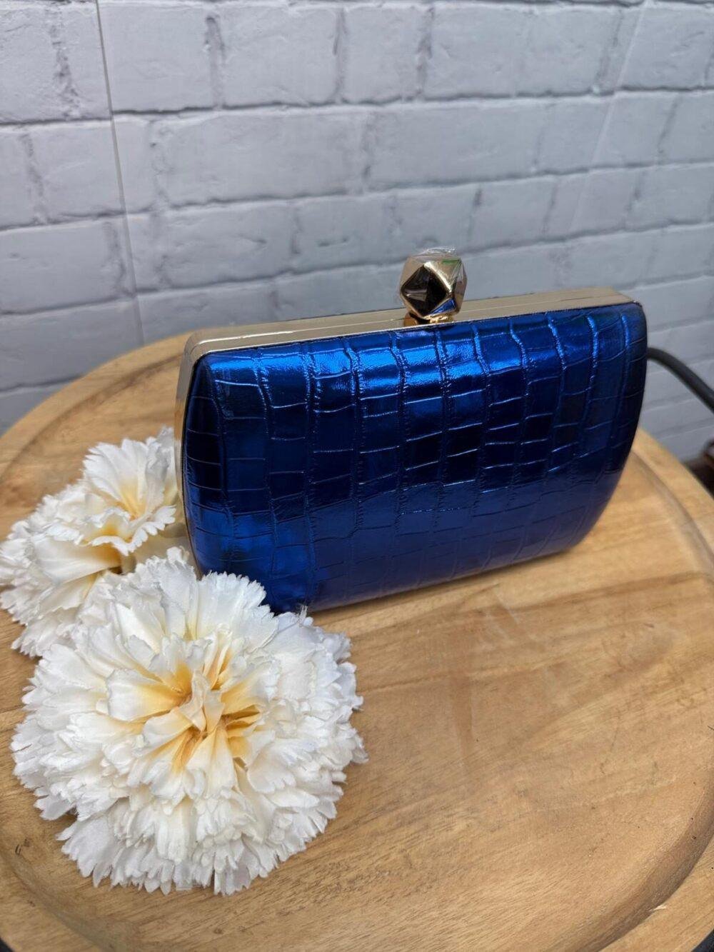 Disponible en tres tonos irresistibles —azul eléctrico vibrante, dorado glamuroso y plata elegante—, combina a la perfección con tus estilismos más atrevidos o los más clásicos. Su cierre joya geométrico añade un toque chic y exclusivo que no pasará desapercibido.