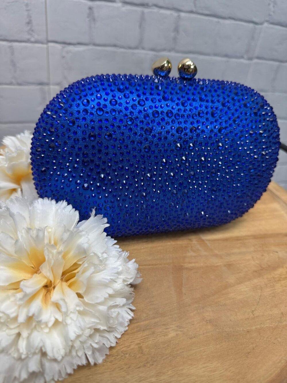 Este bolso de fiesta en azul royal, cubierto de cristales brillantes, es una auténtica joya visual. Su diseño ovalado y estructura rígida aportan un aire sofisticado y moderno que elevará cualquier outfit. El cierre metálico dorado añade un toque de elegancia y seguridad, asegurando que lleves todo contigo con estilo.