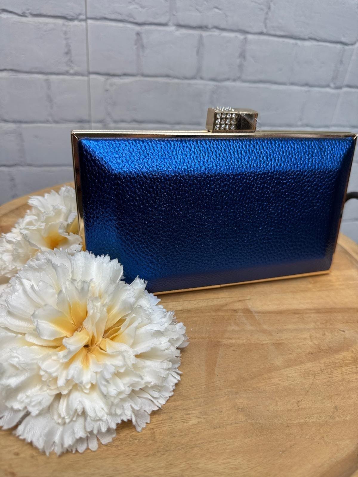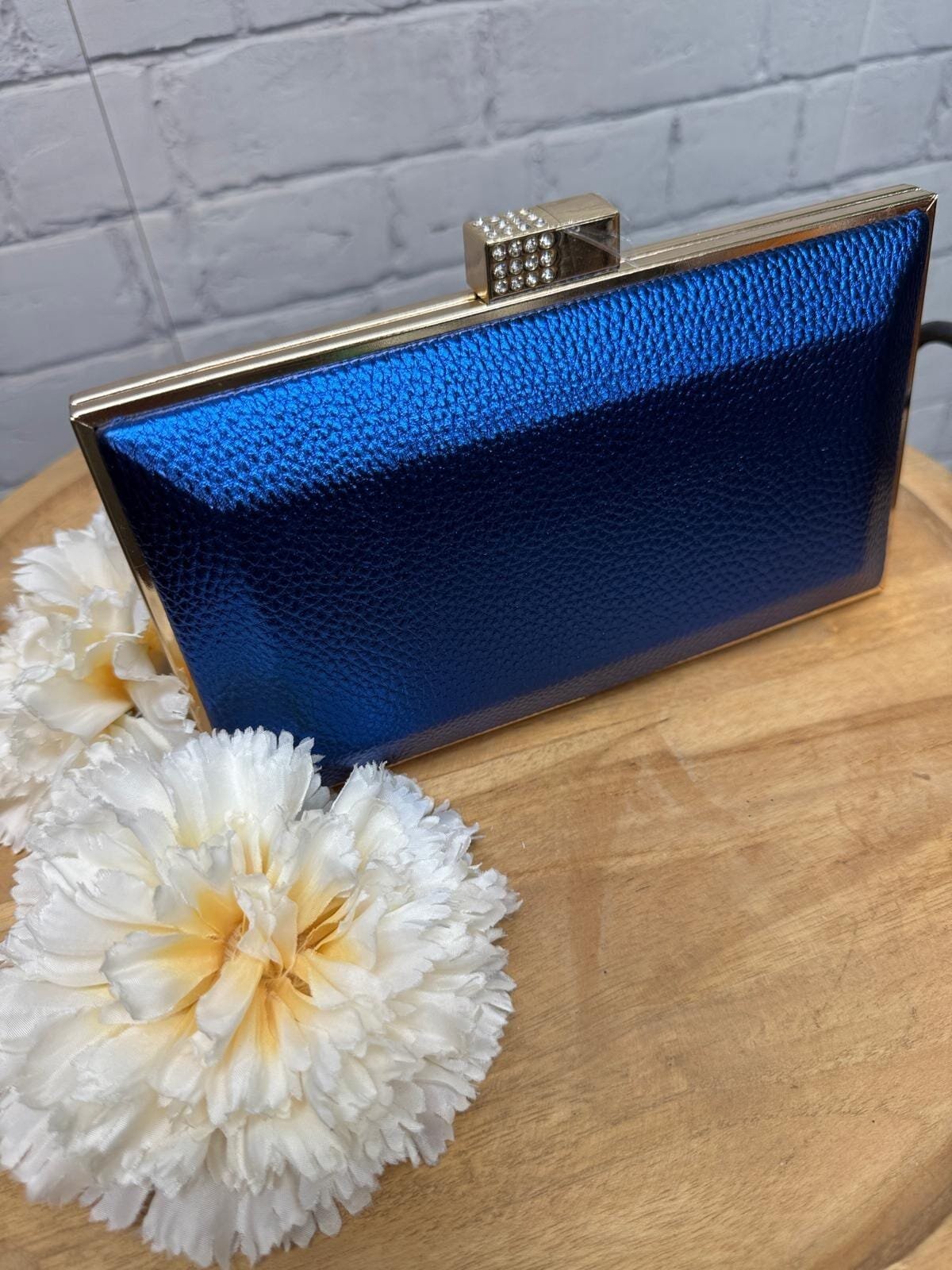 Atrévete a deslumbrar con este clutch de fiesta en azul eléctrico, un diseño que derrocha elegancia desde cualquier ángulo. Su acabado con textura ligera aporta modernidad, mientras que el marco dorado metálico lo convierte en una pieza atemporal y de lo más chic. El broche tipo joya con incrustaciones de pedrería añade ese toque final de distinción que lo hace perfecto para bodas, bautizos, comuniones y noches de celebración.