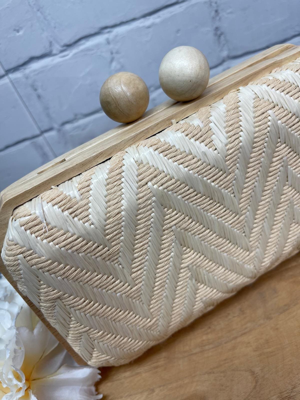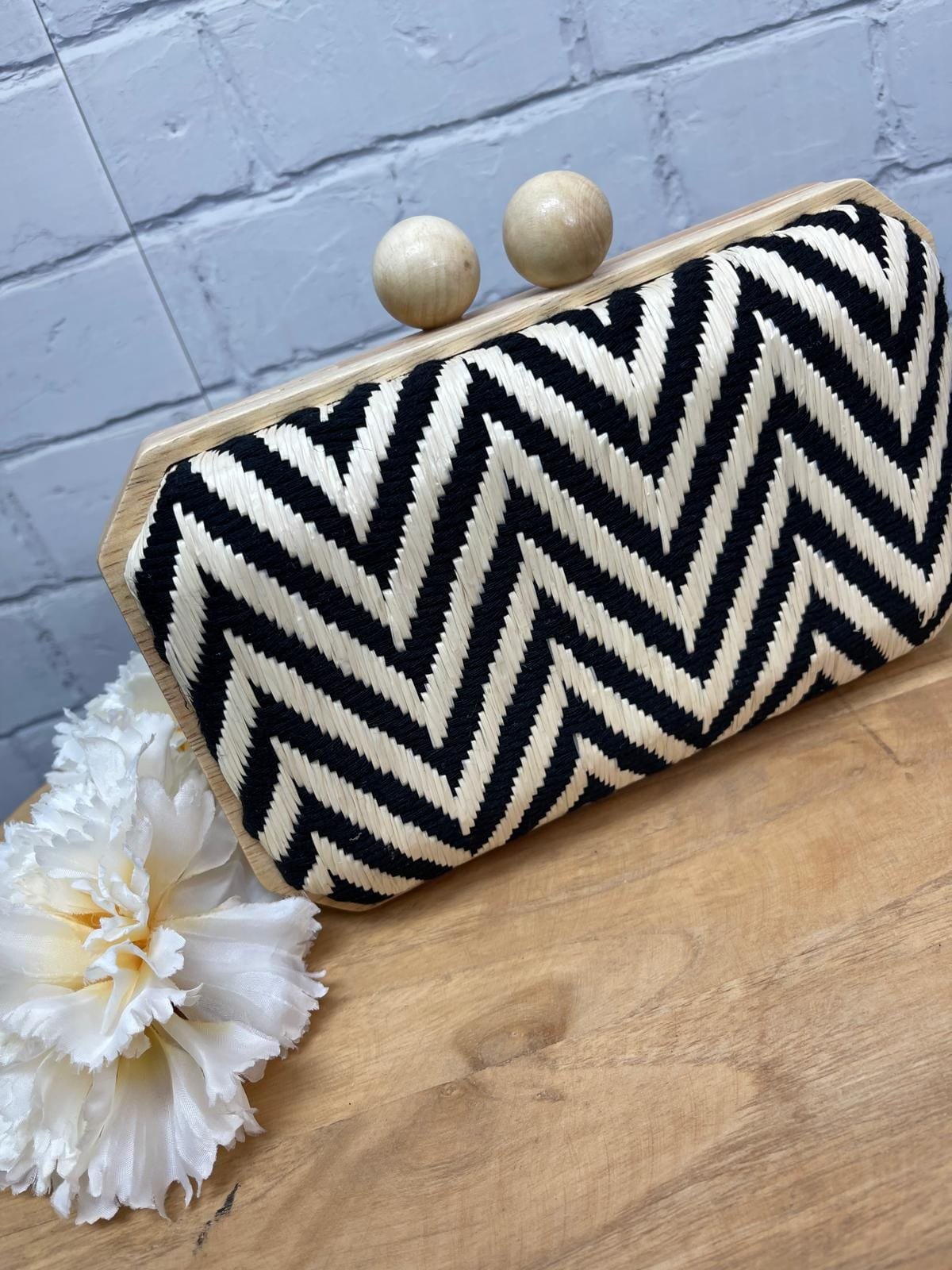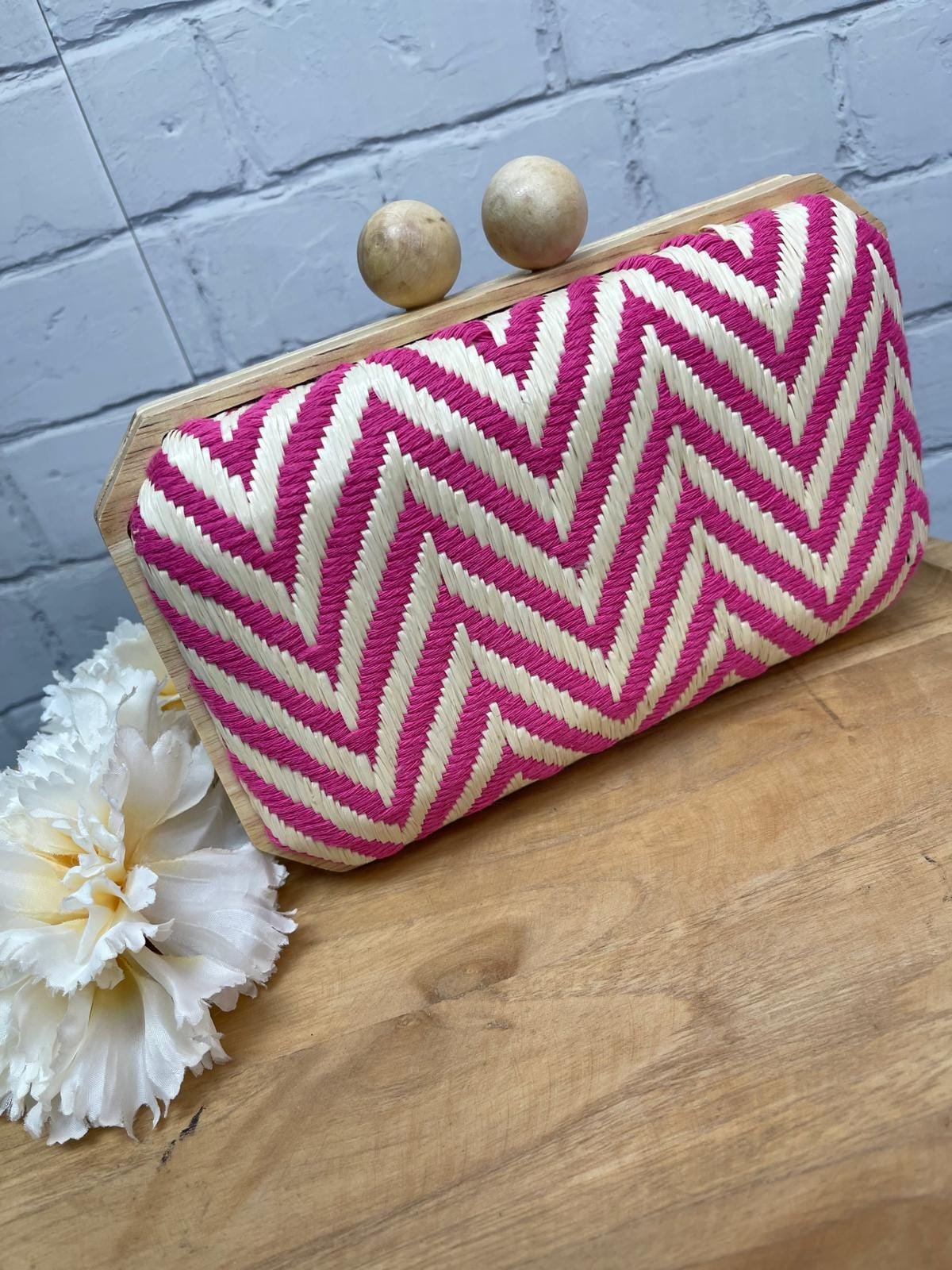 Está fabricado en rafia natural trenzada, con un patrón en zigzag en colores como fucsia, negro, lavanda o beige, todos sobre base clara. Su estructura rectangular rígida está enmarcada en madera natural y rematada con un original cierre de esferas de madera, que aporta ese toque rústico-chic que lo hace único.