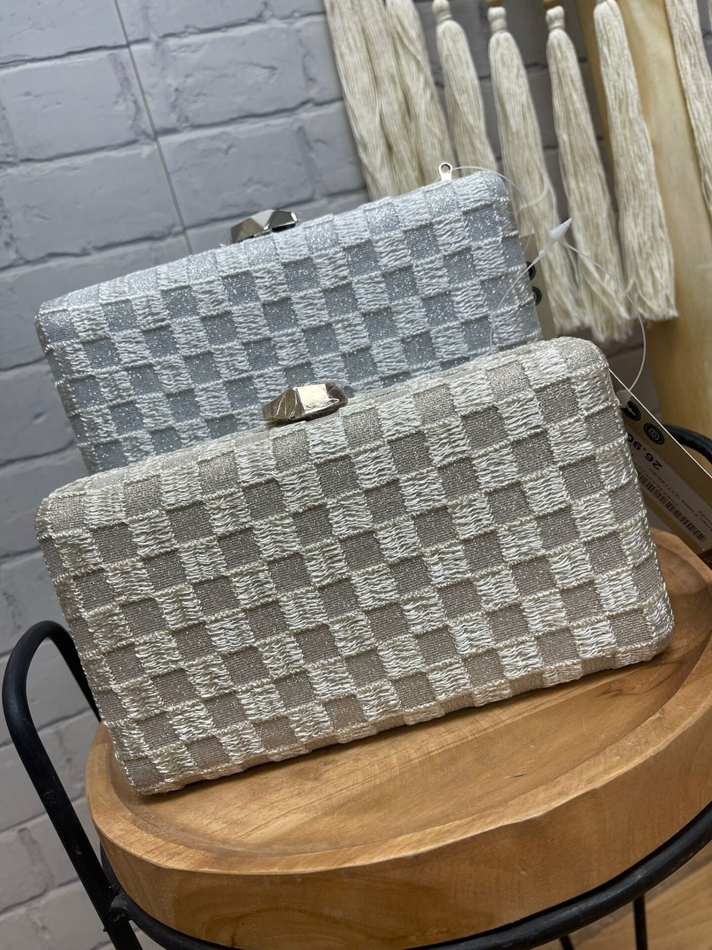 Déjate enamorar por la elegancia suave y natural de este bolso de fiesta texturizado con diseño de cuadros. Su acabado en tela tejida con relieves aporta un aire artesanal pero sofisticado, perfecto para eventos especiales, bodas, comuniones o celebraciones al aire libre.