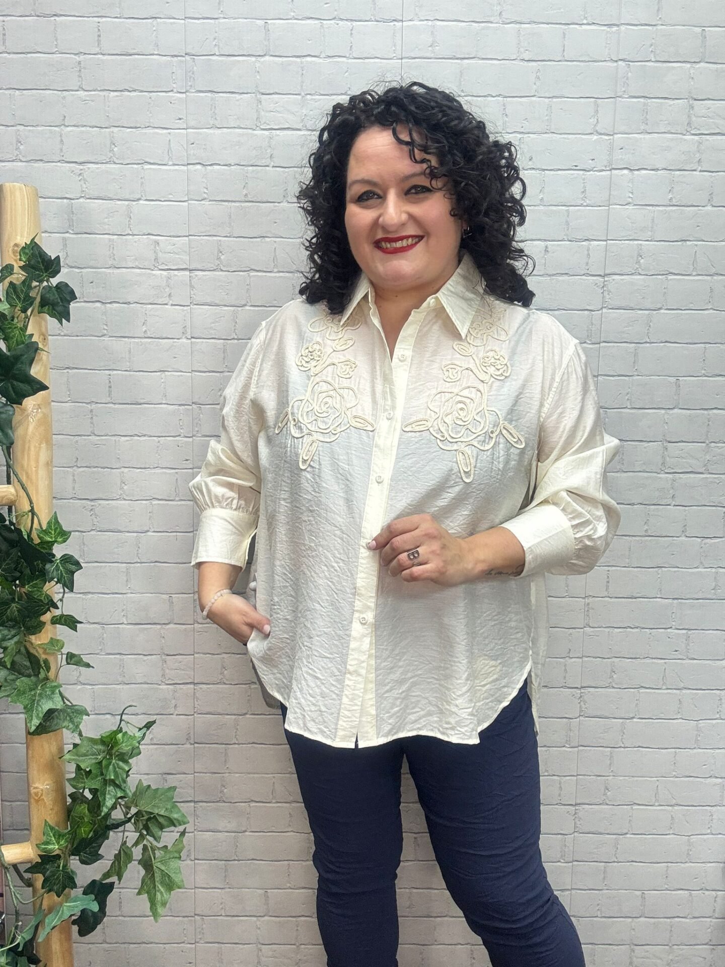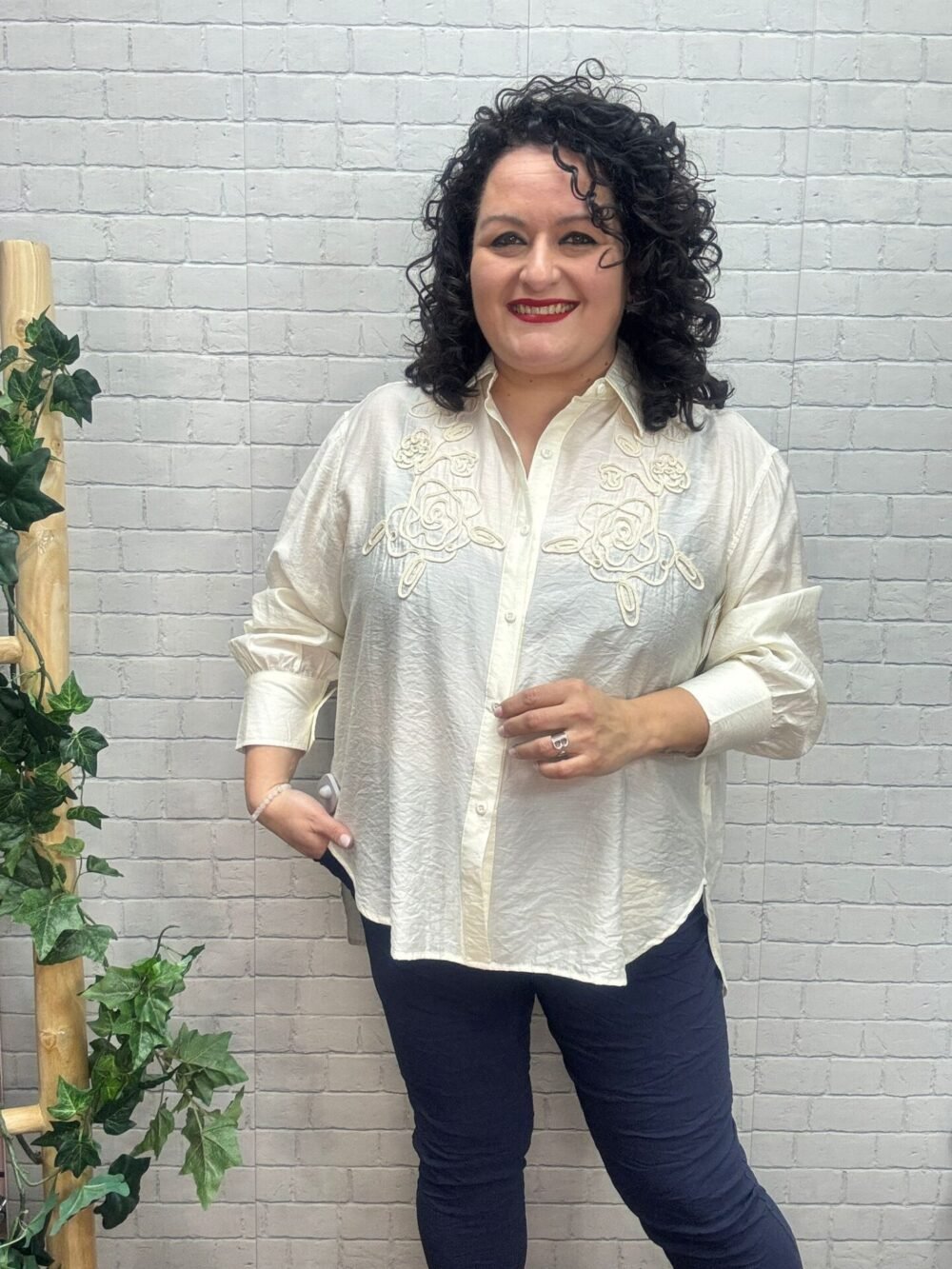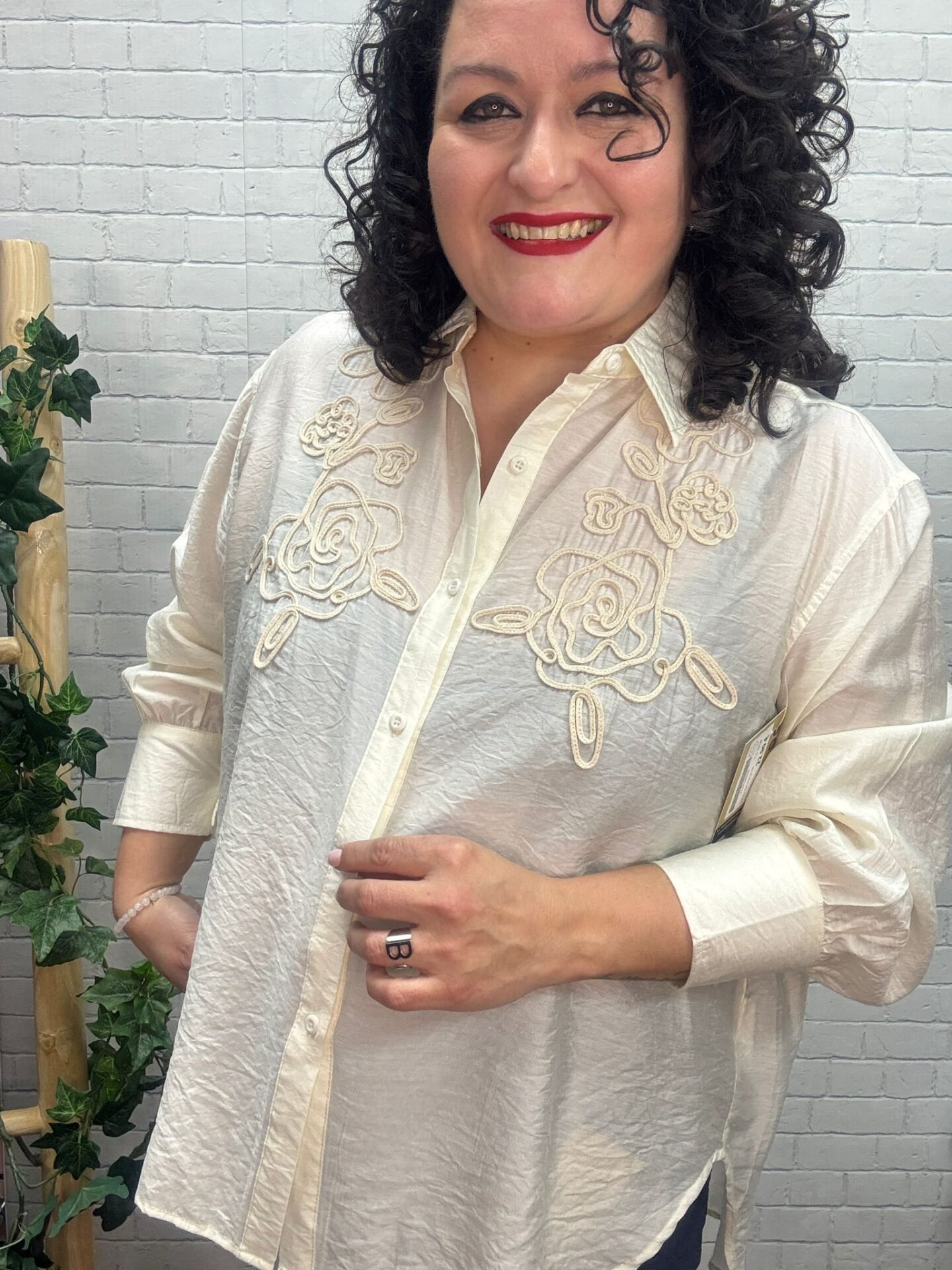 Eleva tus básicos con esta preciosa camisa beige bordada para mujer curvy, una prenda que combina delicadeza, elegancia y comodidad en cada detalle. Su diseño romántico con bordados florales en relieve en la zona del pecho aporta un toque artesanal y exclusivo que marca la diferencia.