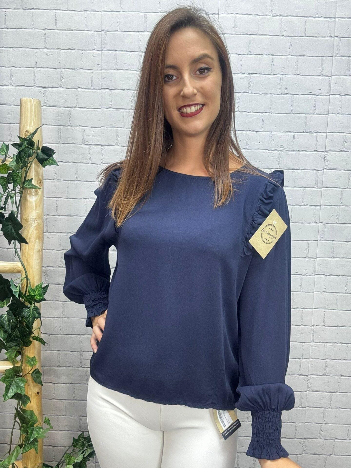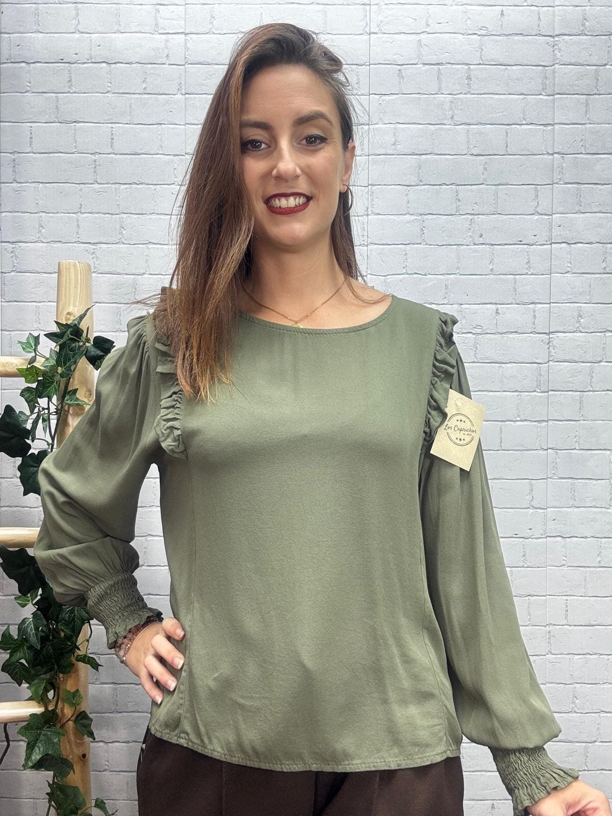 La camiseta básica de manga larga con detalle de volante en los hombros es una prenda que combina sencillez con un toque femenino y distintivo. Su diseño de cuello redondo y corte limpio la convierte en una pieza versátil y fácil de combinar, ideal tanto para looks diarios como para estilismos más cuidados. El volante en los hombros añade un aire delicado y original, realzando la silueta y aportando movimiento sin perder la esencia minimalista.