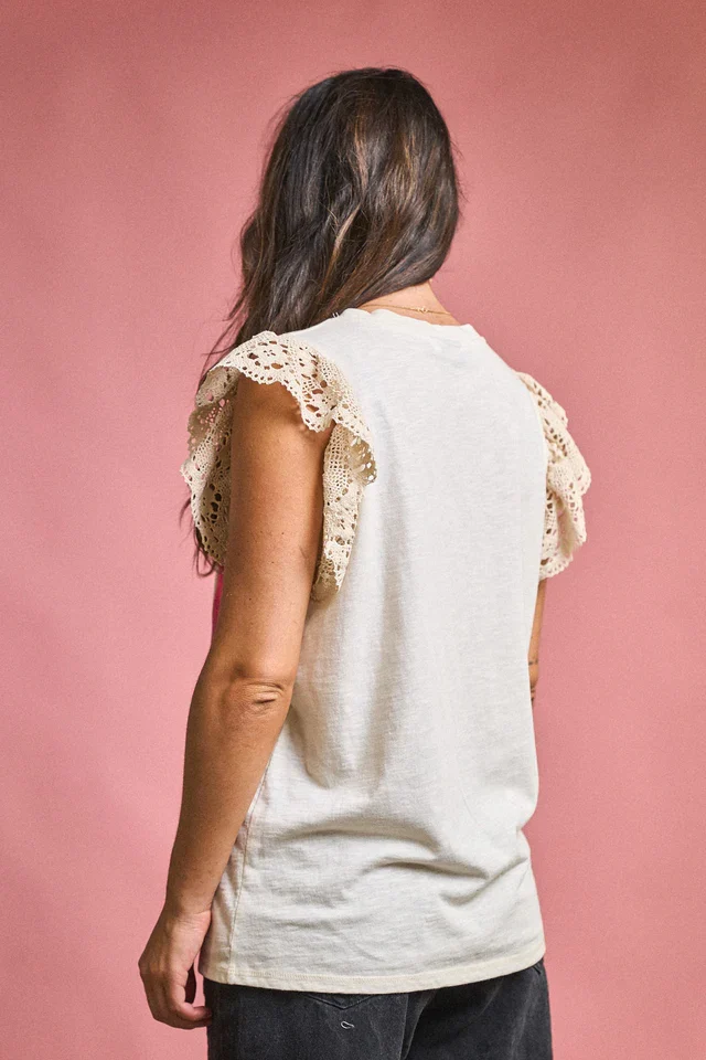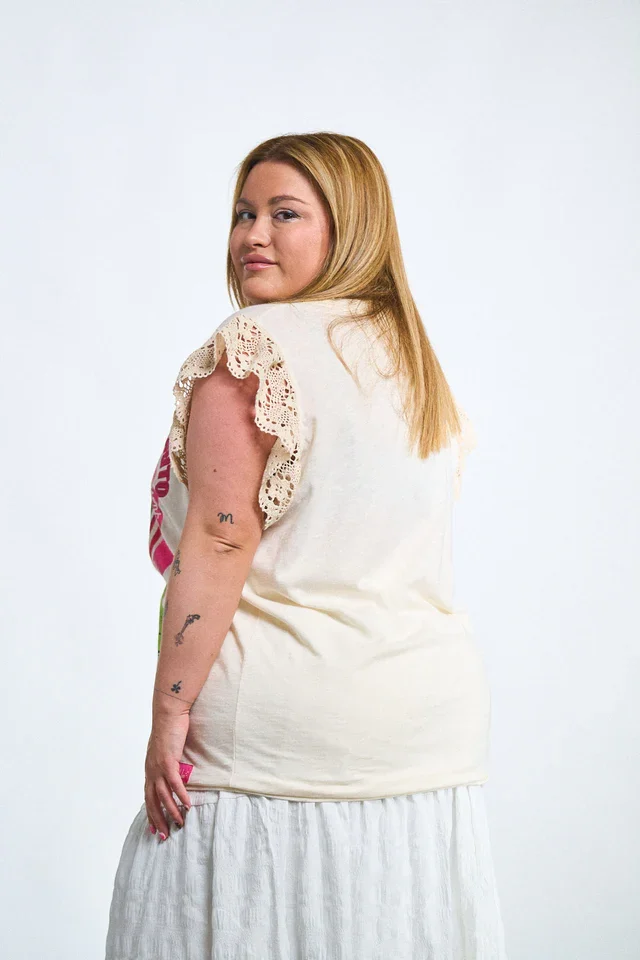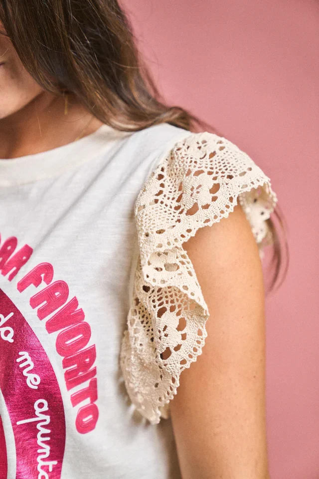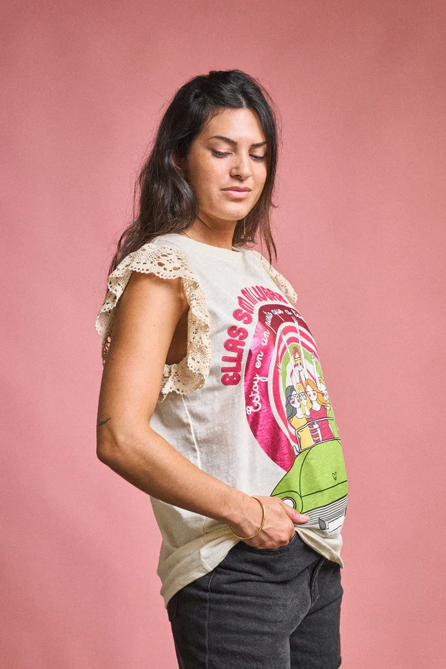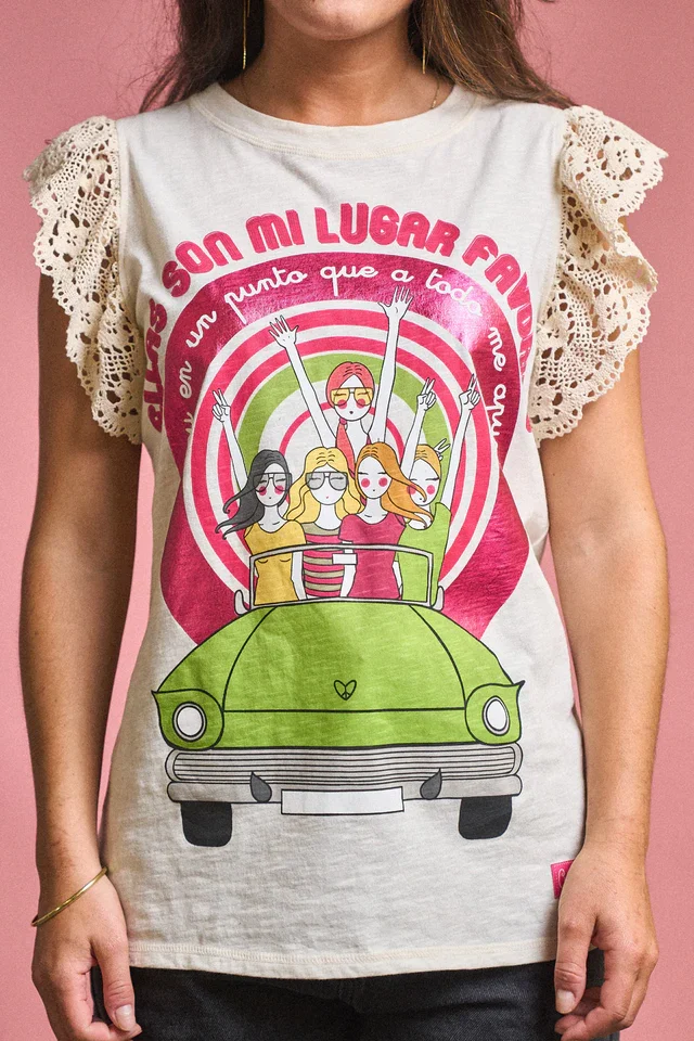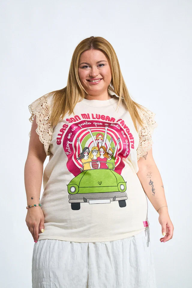 Esta camiseta es un homenaje a la fuerza de la amistad femenina: alegre, cómoda y con mucho estilo. El estampado colorido con mensaje positivo se combina con delicadas mangas de encaje calado que aportan un toque romántico y original. Su corte fluido y tejido suave se adapta con libertad a todo tipo de cuerpos, haciendo que te sientas cómoda y segura. Ideal para combinar con jeans, faldas o shorts en looks relajados y llenos de actitud. Tallas inclusivas y envío rápido para que disfrutes de moda con mensaje.