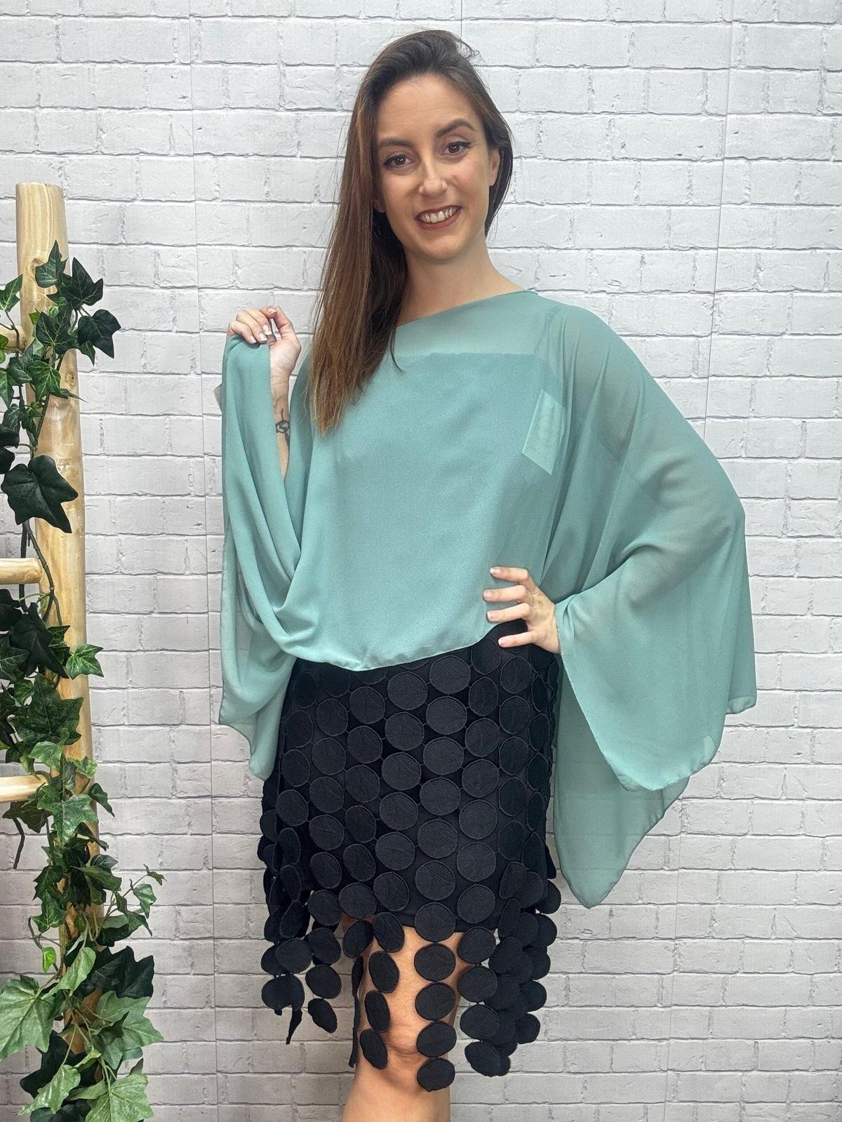 Dale un toque de elegancia y versatilidad a tu armario con esta capa de gasa, una prenda imprescindible que añade un toque de sofisticación a cualquier atuendo. Confeccionada en un delicado y traslúcido tejido, esta capa permite mostrar con sutileza lo que llevas en la parte inferior, creando un look elegante y etéreo.