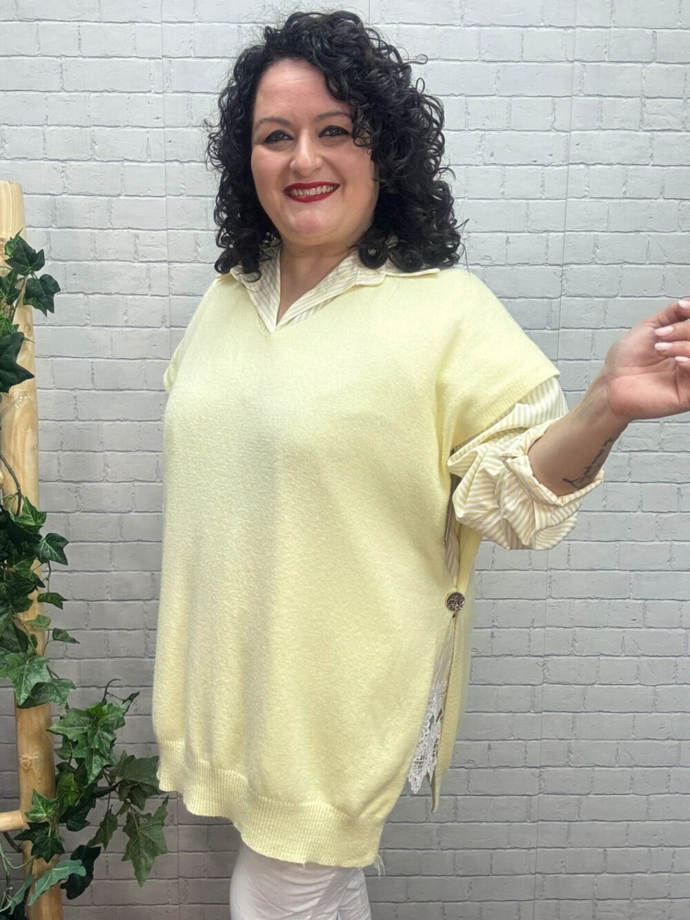 Ilumina tus outfits con este chaleco de punto amarillo pastel para mujer curvy, una prenda versátil y ultra favorecedora diseñada para realzar tus curvas con estilo y comodidad.