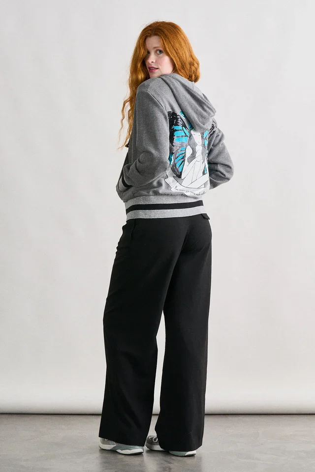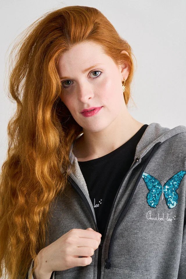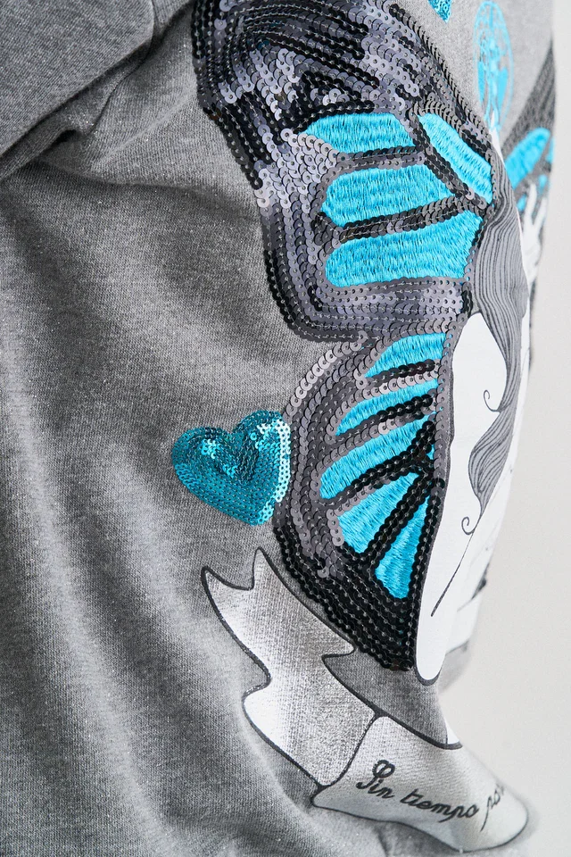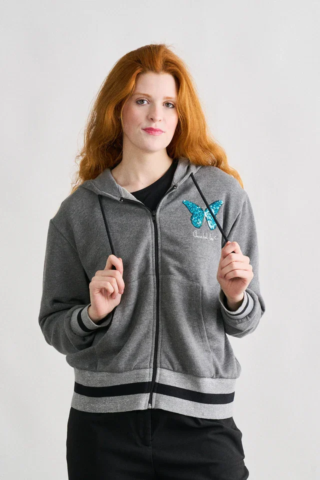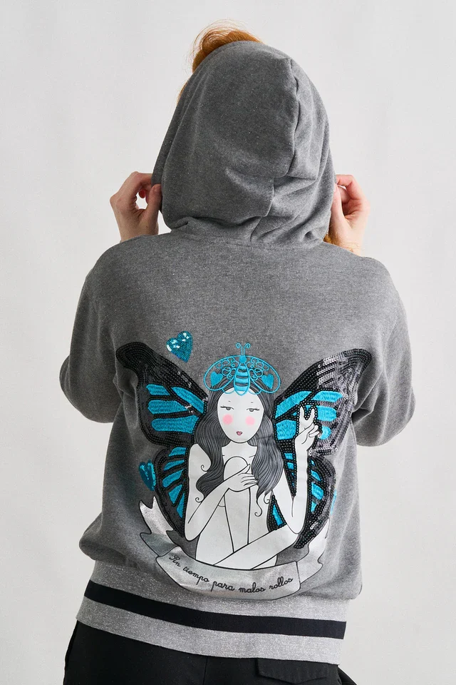 Descubre esta chaqueta con capucha que combina comodidad absoluta y un estilo femenino lleno de personalidad. Confeccionada en un suave tejido gris de tacto agradable, esta prenda se convierte en un básico imprescindible para tus días de relax, estudio o escapadas urbanas. Su diseño destaca por una mariposa brillante bordada en el pecho y una ilustración trasera de inspiración artística, donde los tonos turquesa y negros aportan un contraste visual irresistible. Un detalle que convierte un clásico en una pieza única.