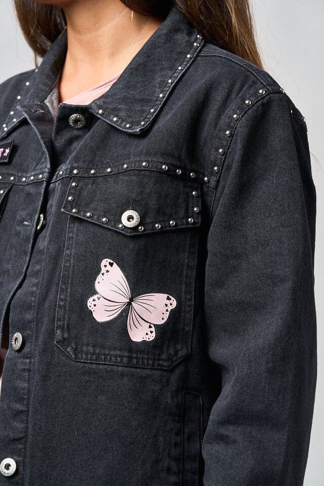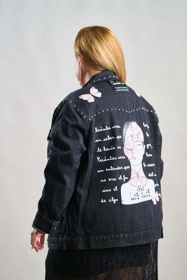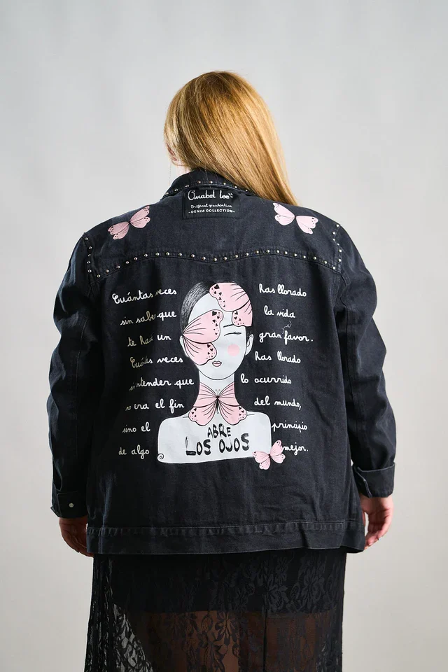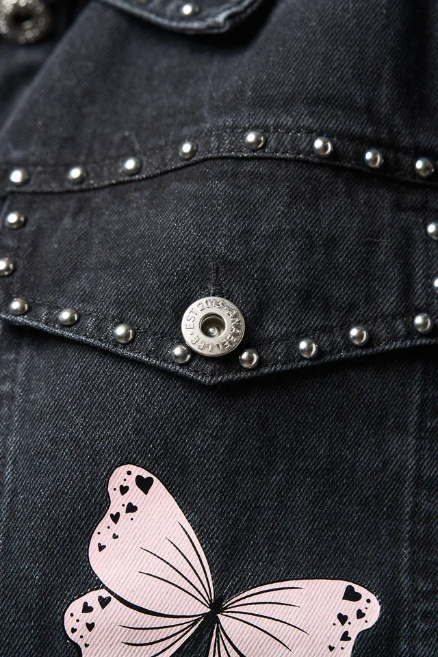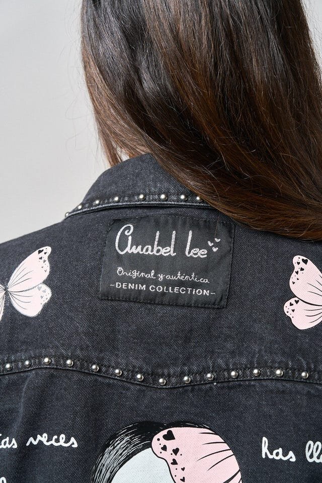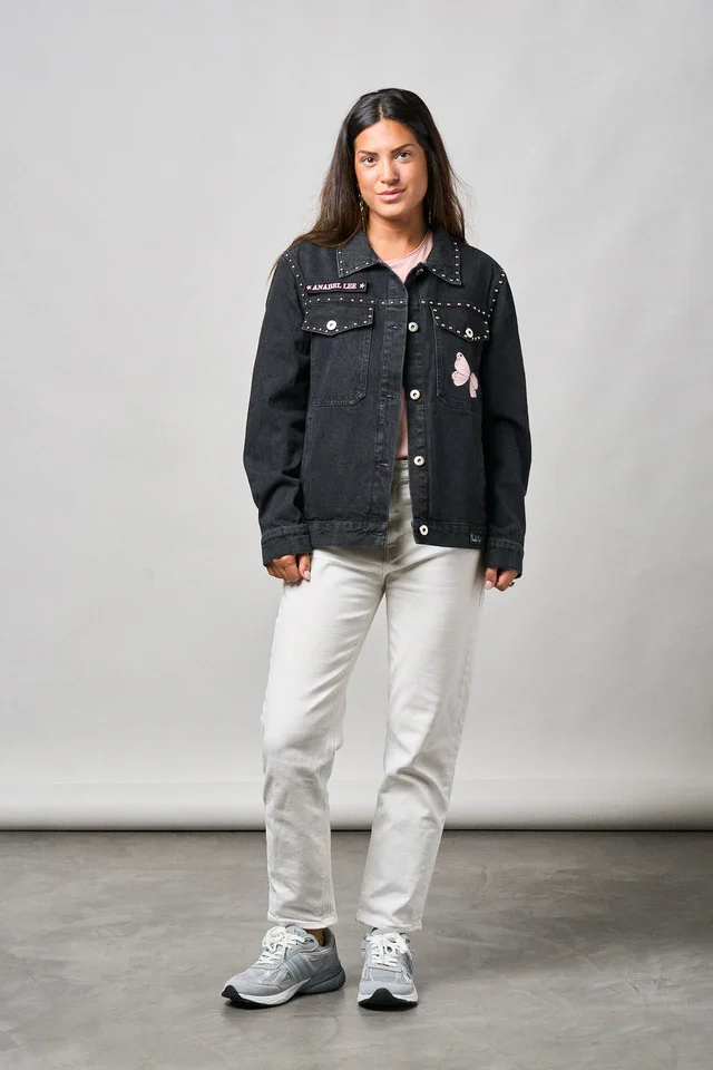 La Chaqueta Denim Negra Abre los Ojos de Anabel Lee es una prenda llena de fuerza, estilo y personalidad. Confeccionada en denim negro lavado, destaca por los detalles de tachuelas metálicas en el cuello y los bolsillos, y los motivos de mariposas rosas que aportan un aire delicado y femenino.