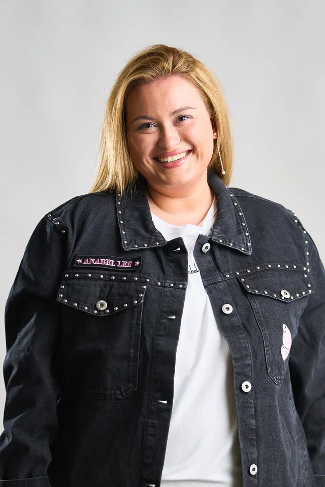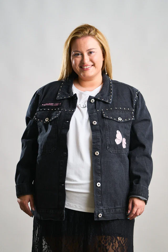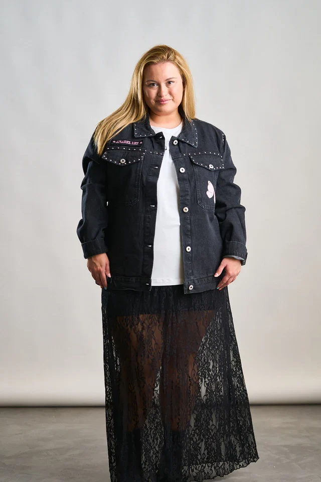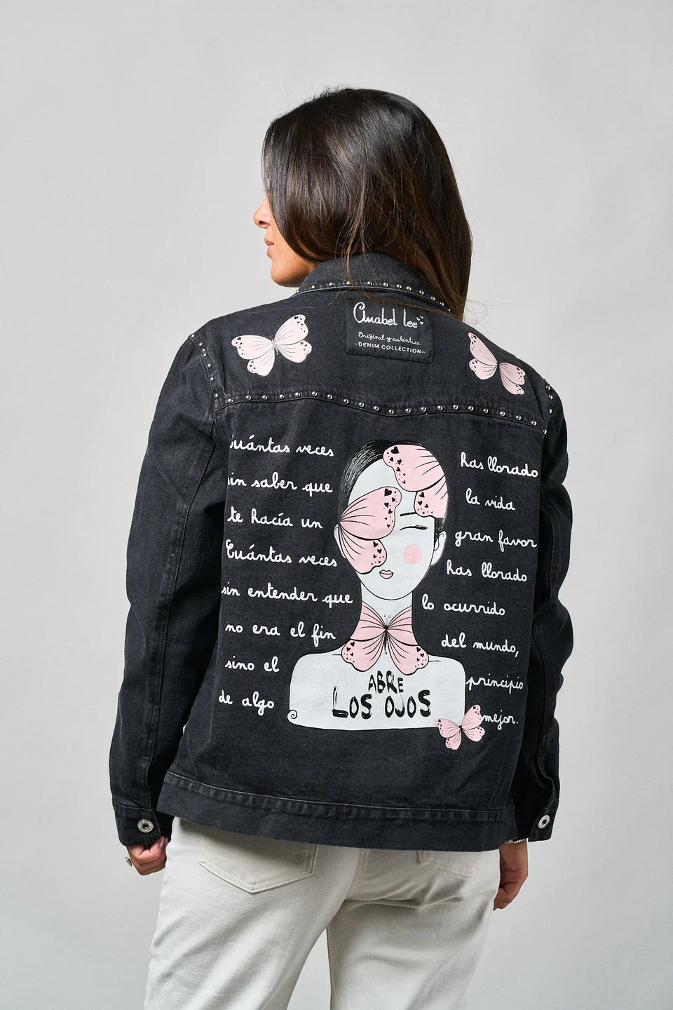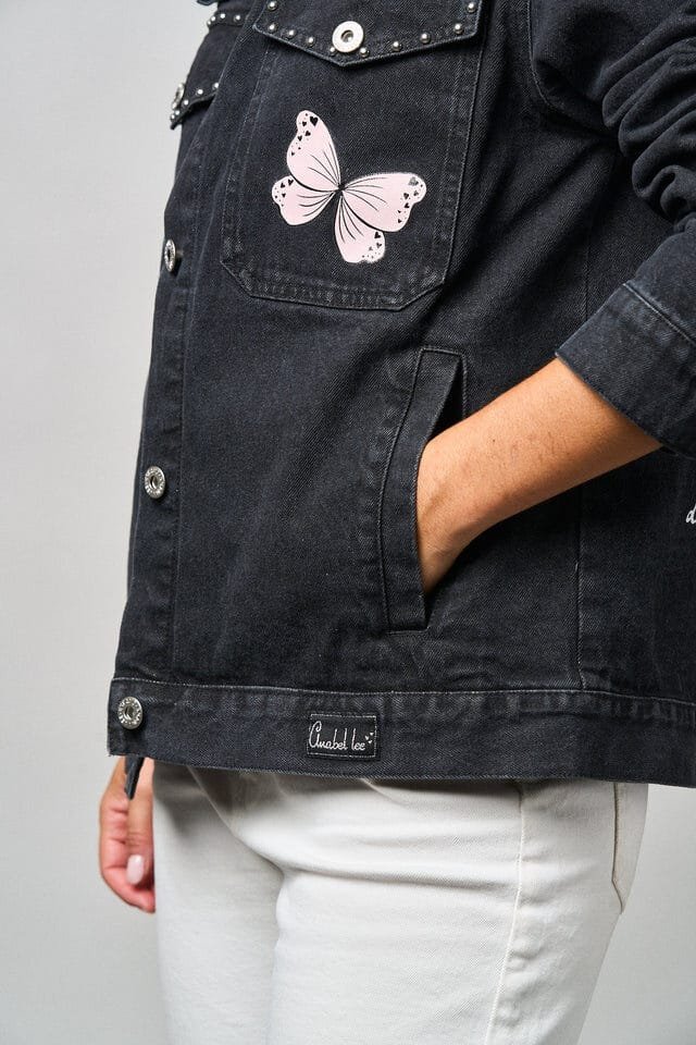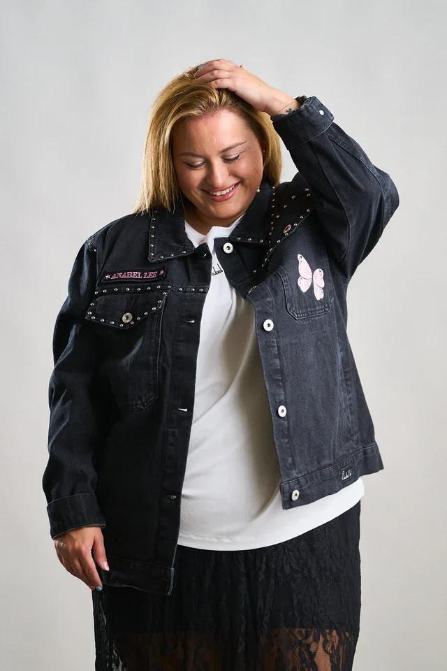 La Chaqueta Denim Negra Abre los Ojos de Anabel Lee es una prenda llena de fuerza, estilo y personalidad. Confeccionada en denim negro lavado, destaca por los detalles de tachuelas metálicas en el cuello y los bolsillos, y los motivos de mariposas rosas que aportan un aire delicado y femenino.