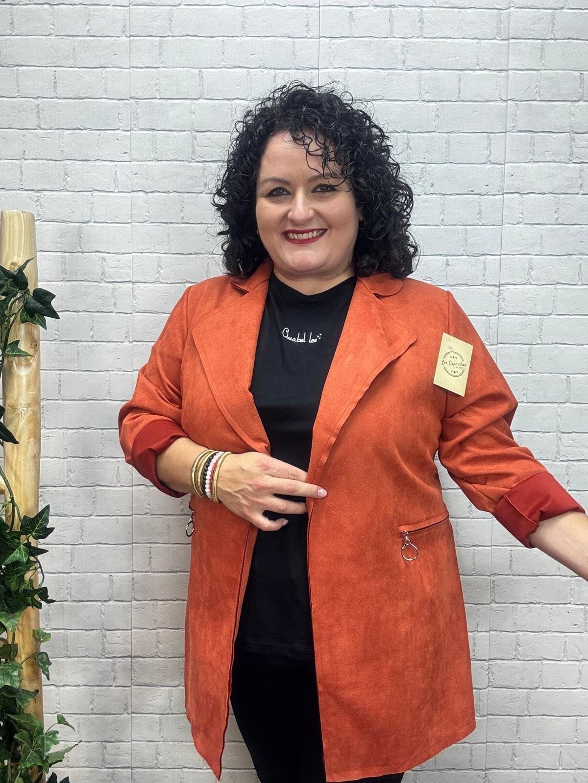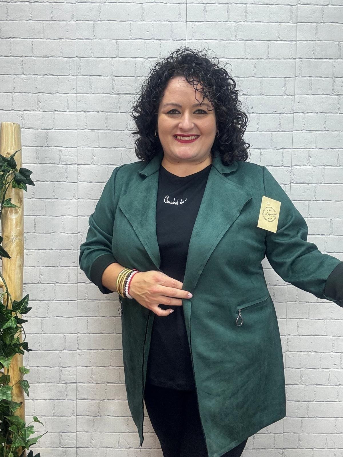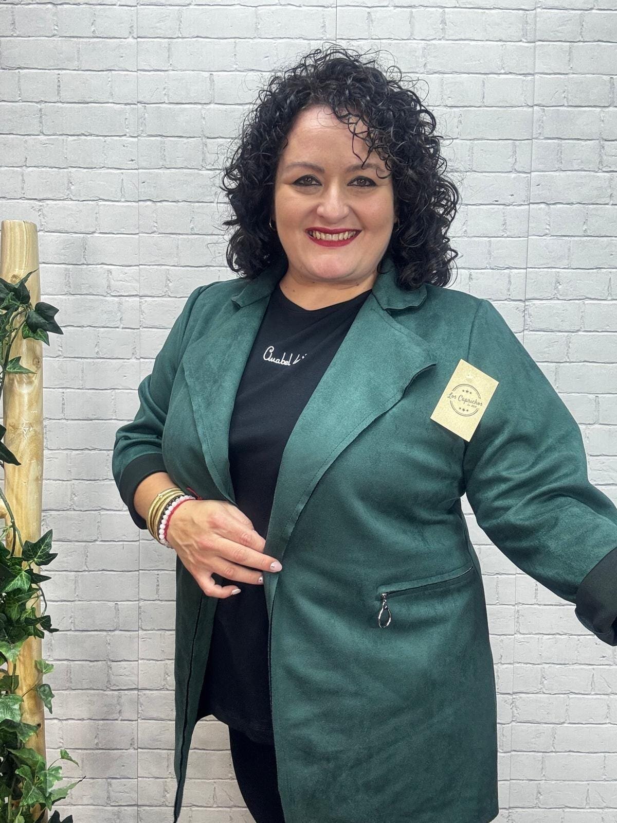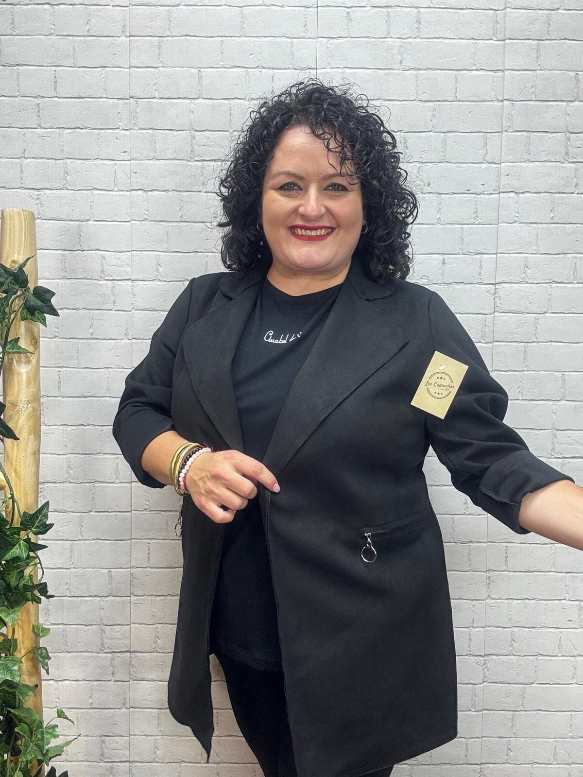Este modelo es talla única, y se adapta a mujeres que usan desde la talla 44 hasta la 50, lo que la convierte en una excelente opción para tallas medianas y grandes. En la imagen, Bea —que mide 1,64 cm y tiene 120 cm de pecho, 115 cm de cintura y 115 cm de cadera— muestra cómo la chaqueta se ajusta con caída natural, ofreciendo una silueta favorecedora y cómoda.