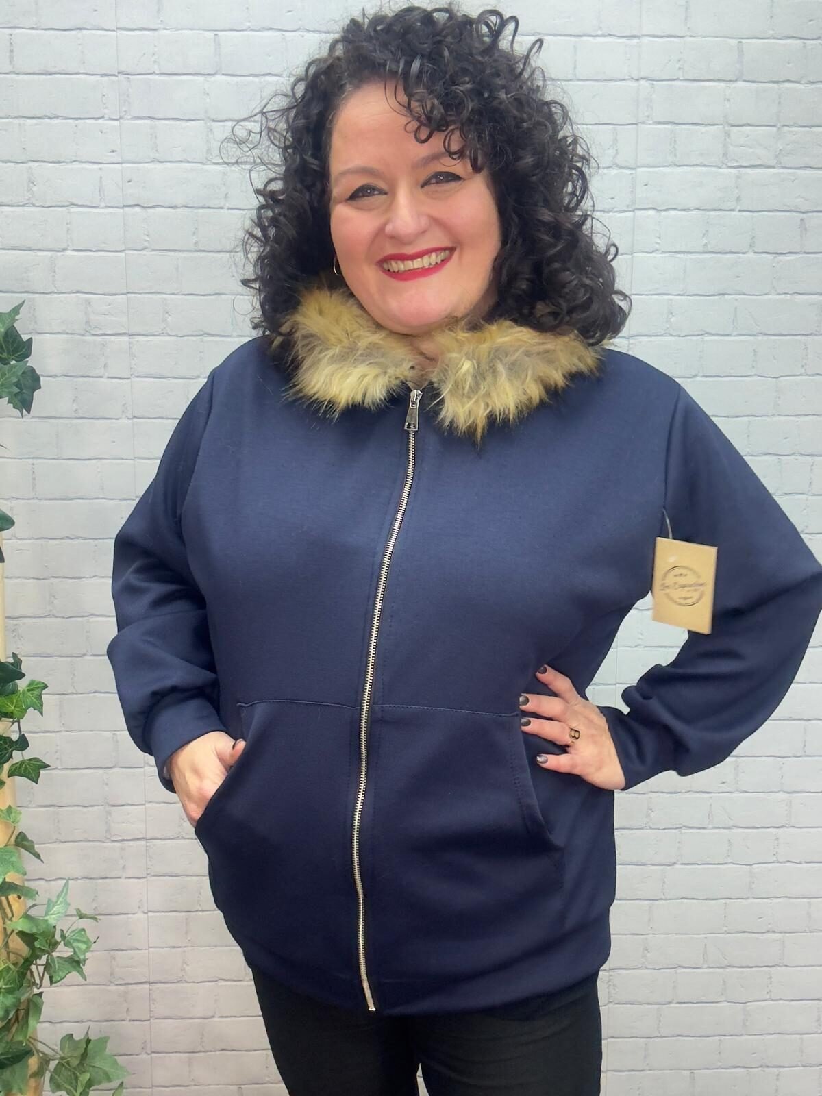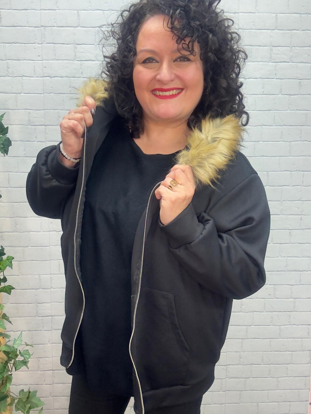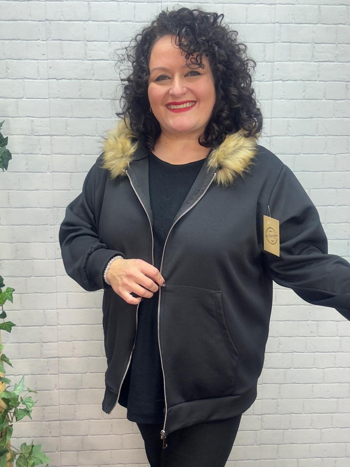 Esta chaqueta curvy con capucha de pelo es una prenda imprescindible para los meses más frescos. Diseñada especialmente para mujeres de talla grande, ofrece un ajuste cómodo que no marca y realza la silueta con naturalidad.