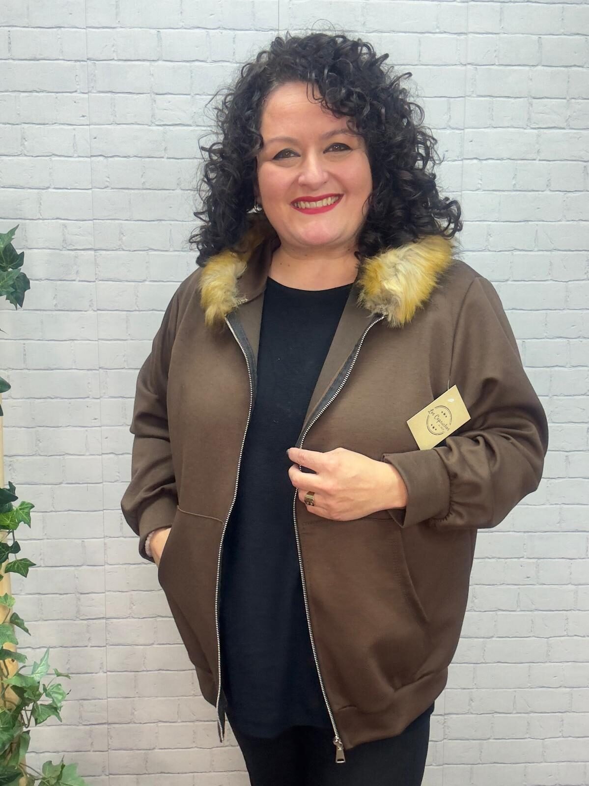 Confeccionada en un tejido suave, agradable y calentito, cuenta con cremallera frontal, bolsillos funcionales y una espectacular capucha con pelo suave que aporta un toque moderno y muy femenino. Su diseño es ideal para crear looks casuales con estilo sin renunciar al confort.