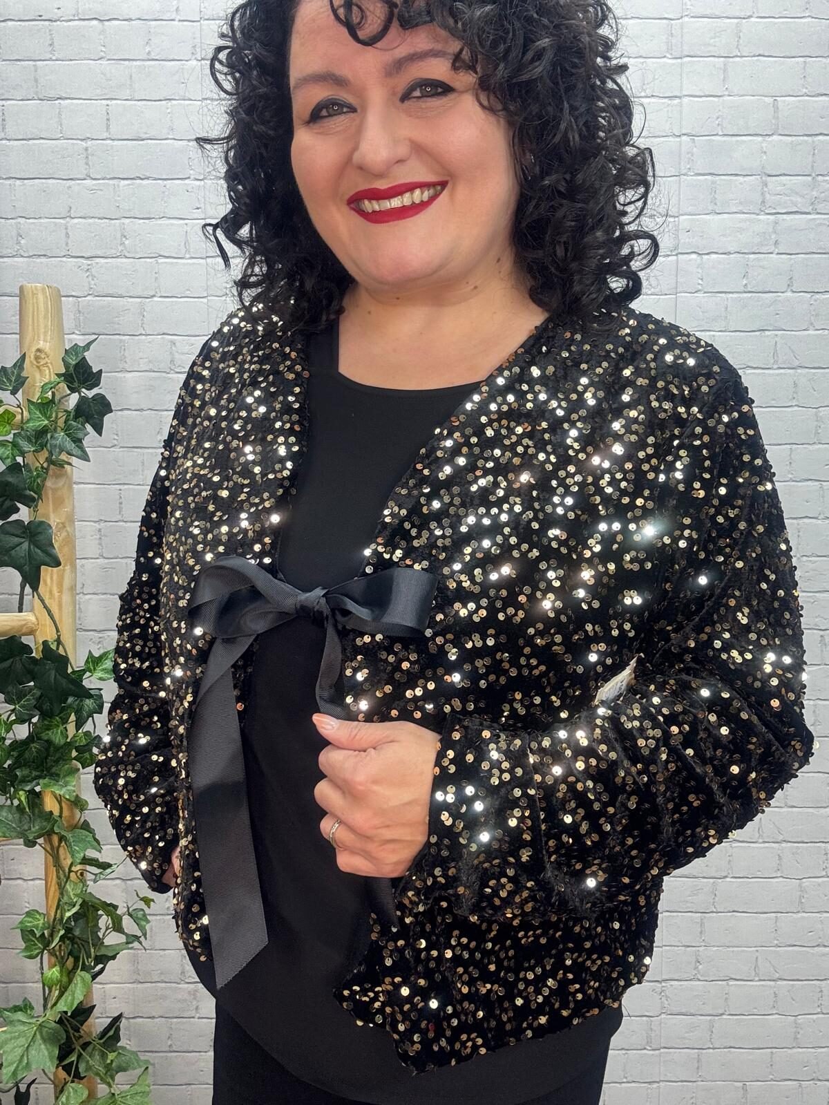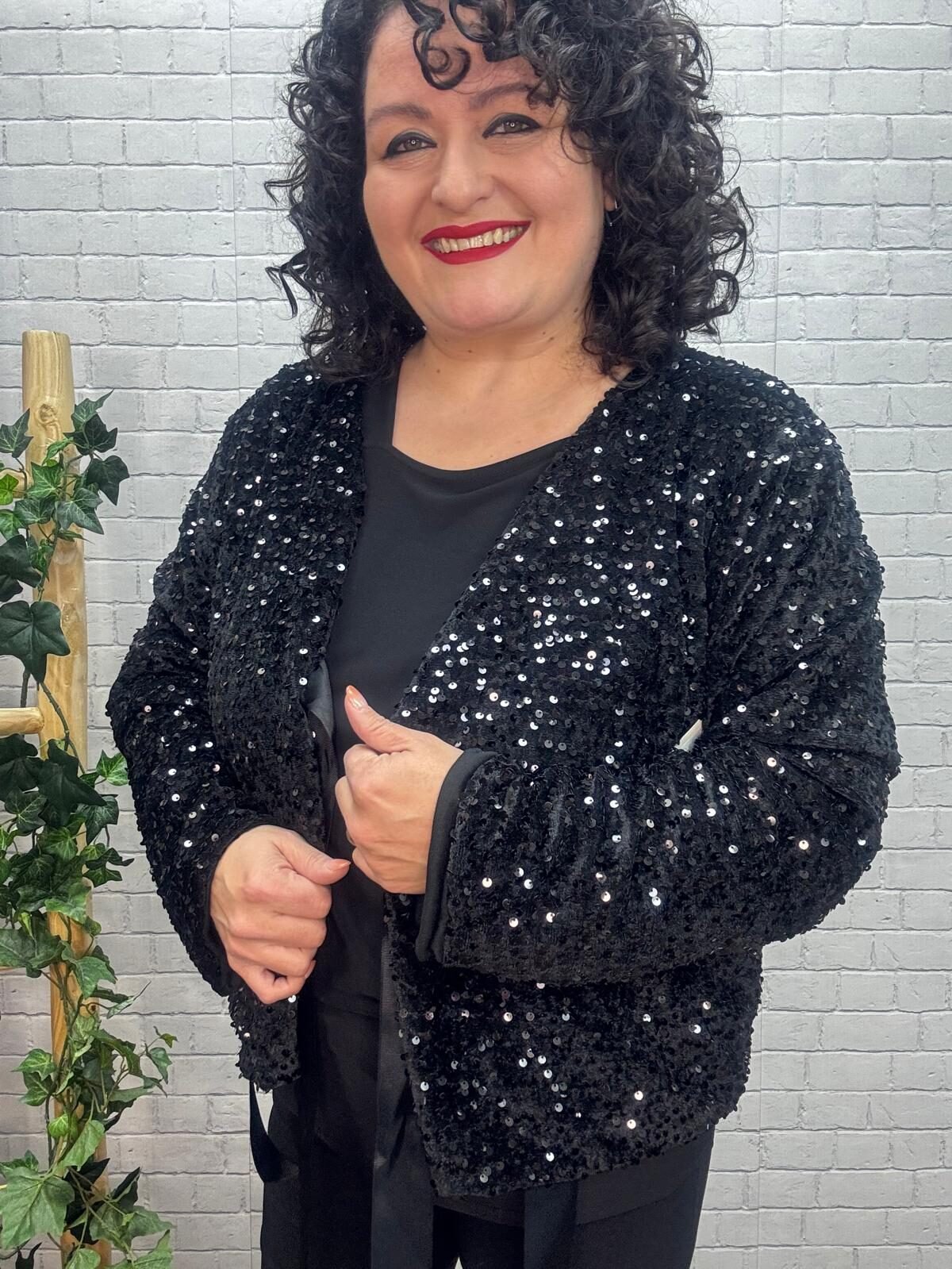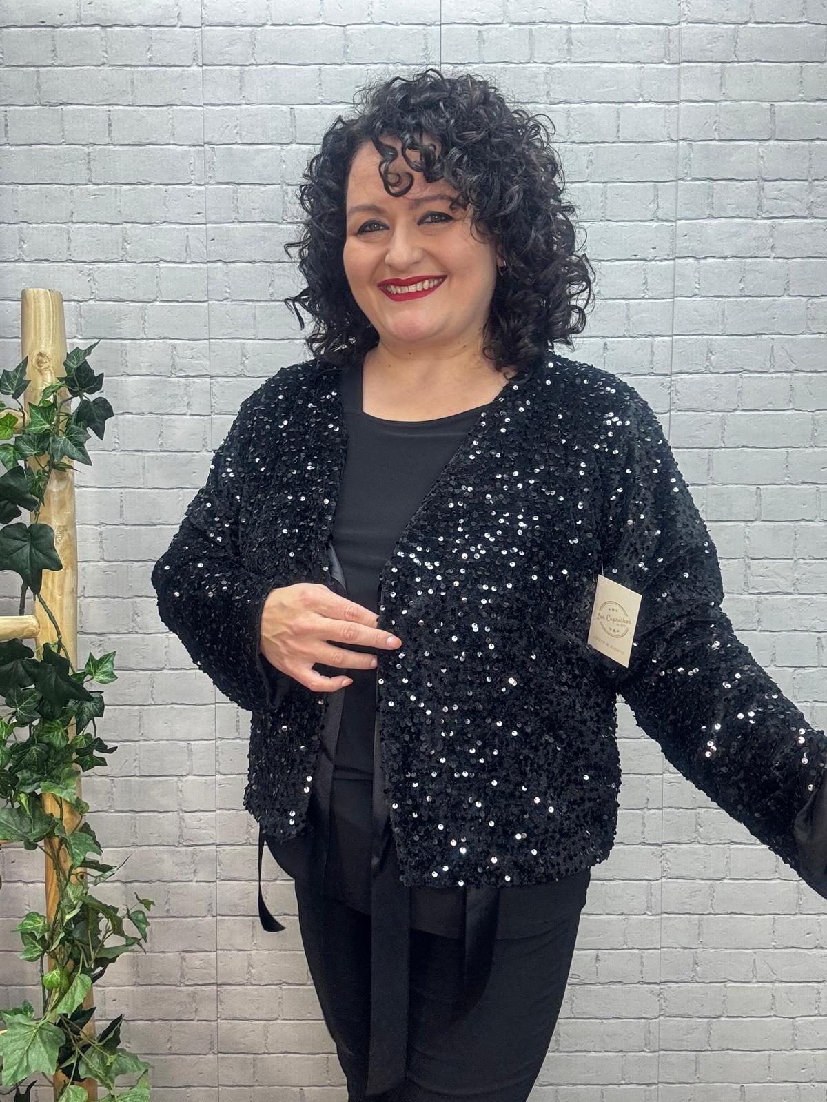 Dale un toque de brillo irresistible a tus looks con esta chaqueta de lentejuelas con lazada satinada, diseñada para mujeres curvy que buscan una prenda festiva, cómoda y con muchísimo estilo. Su tejido suave y flexible hace que, a pesar del brillo, la chaqueta sea ligera y fácil de llevar, adaptándose a tus movimientos sin marcar y manteniendo una caída favorecedora.