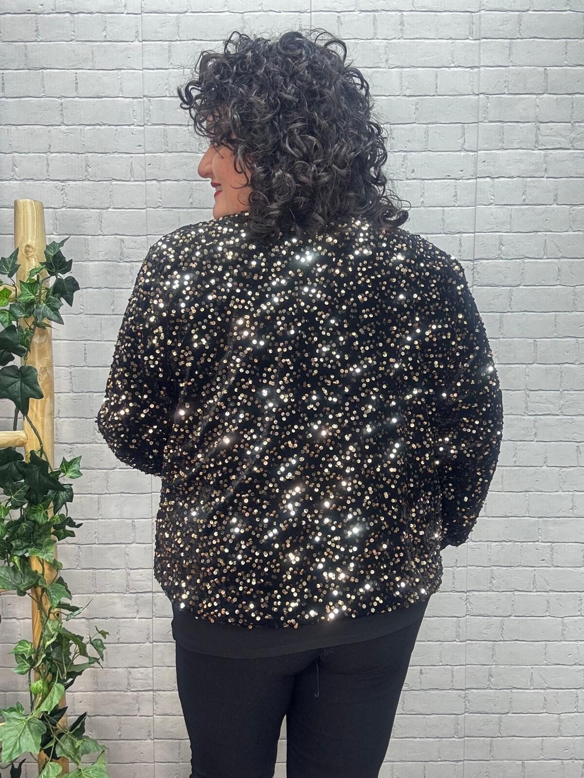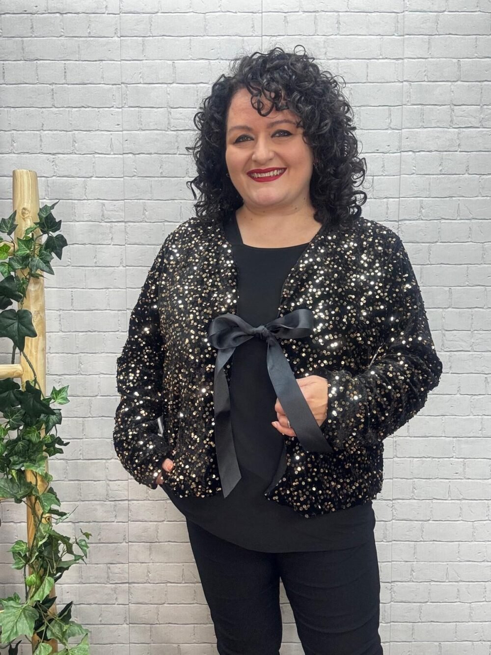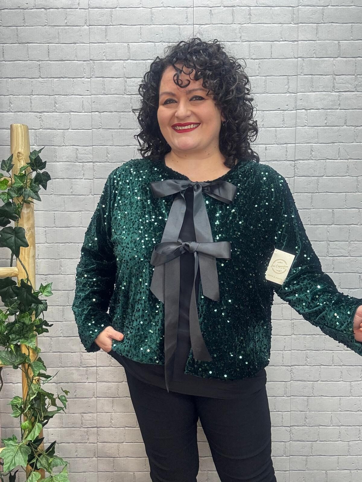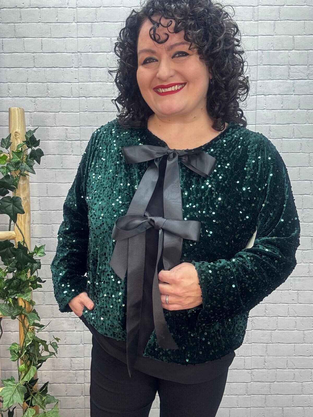 Dale un toque de brillo irresistible a tus looks con esta chaqueta de lentejuelas con lazada satinada, diseñada para mujeres curvy que buscan una prenda festiva, cómoda y con muchísimo estilo. Su tejido suave y flexible hace que, a pesar del brillo, la chaqueta sea ligera y fácil de llevar, adaptándose a tus movimientos sin marcar y manteniendo una caída favorecedora.
