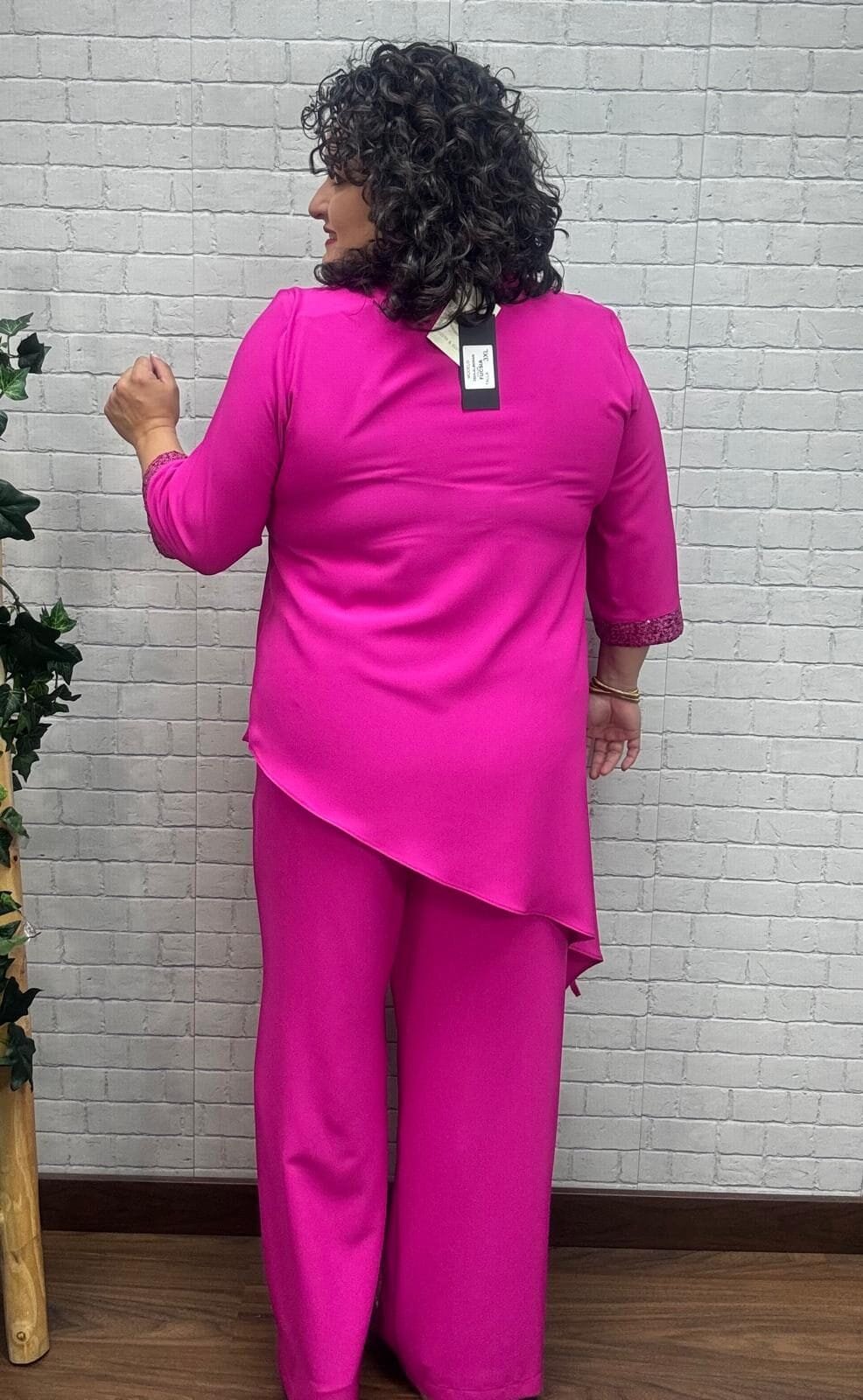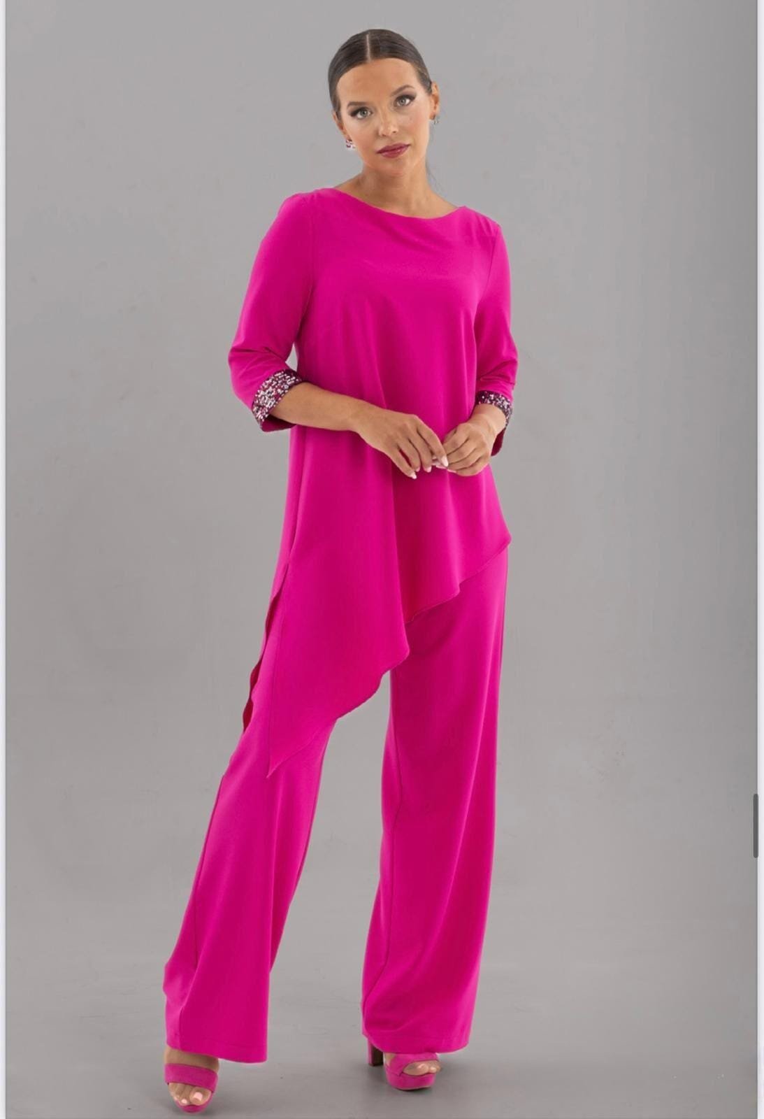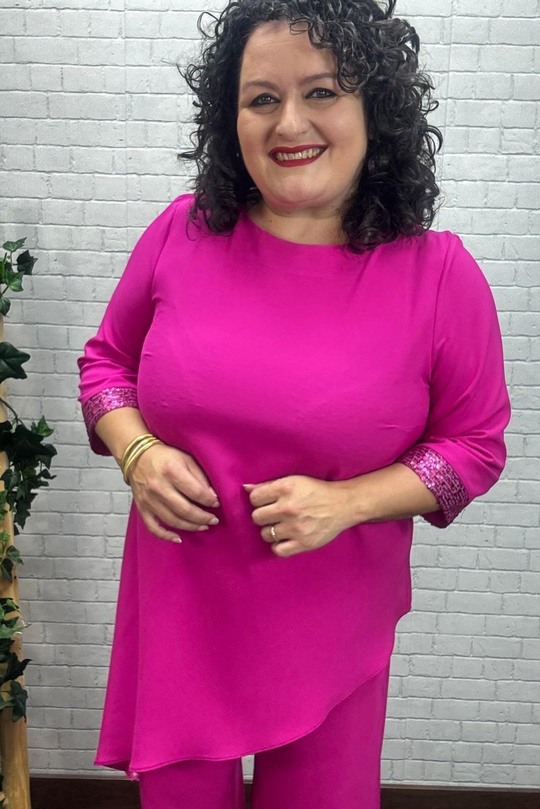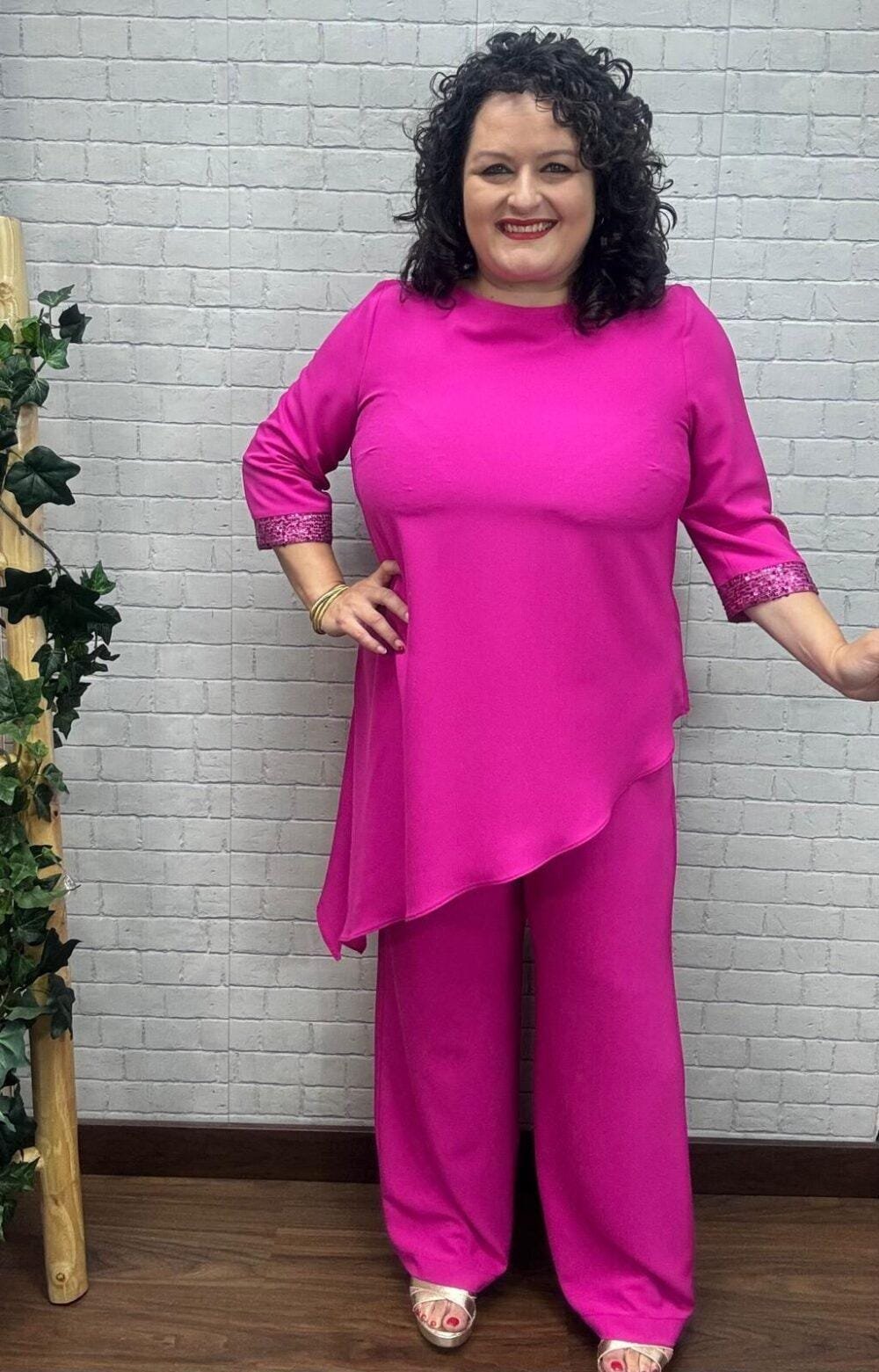 Este conjunto fucsia es ideal para destacar con personalidad y sofisticación. Su blusa de corte asimétrico alarga visualmente la figura, mientras que los puños con lentejuelas añaden un toque de brillo perfecto para eventos especiales o celebraciones. El pantalón palazzo aporta movimiento y comodidad, creando un look favorecedor y lleno de presencia. Disponible en tallas inclusivas, es una opción perfecta para mujeres que aman vestir con estilo, sentir libertad y reflejar seguridad en cada paso.