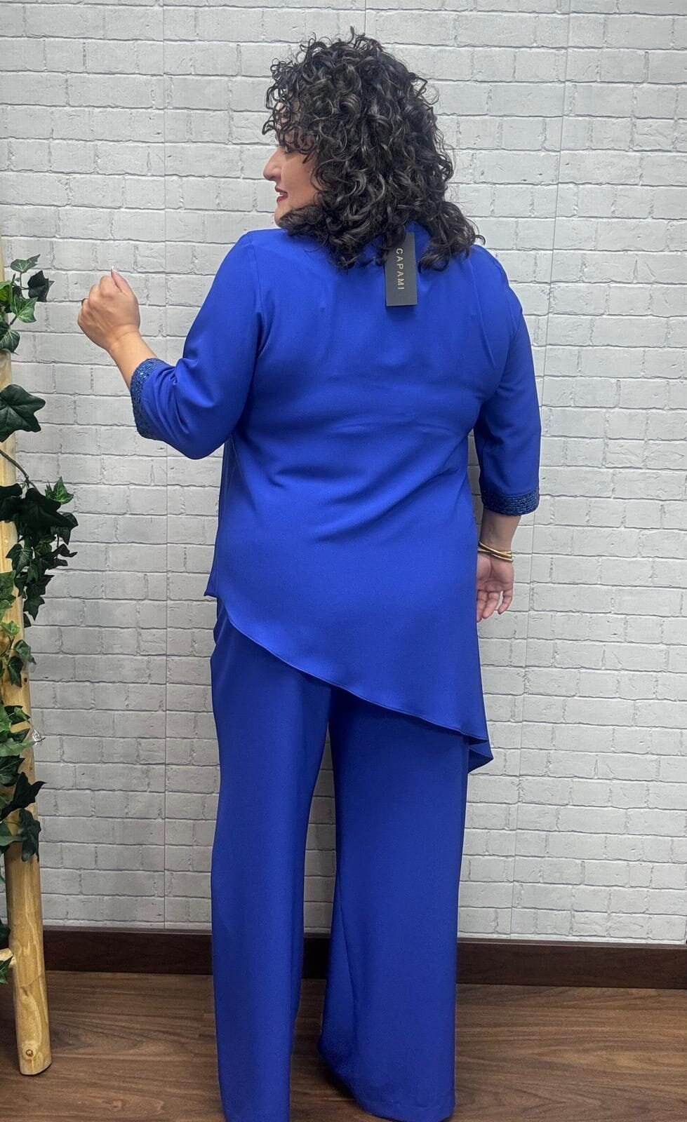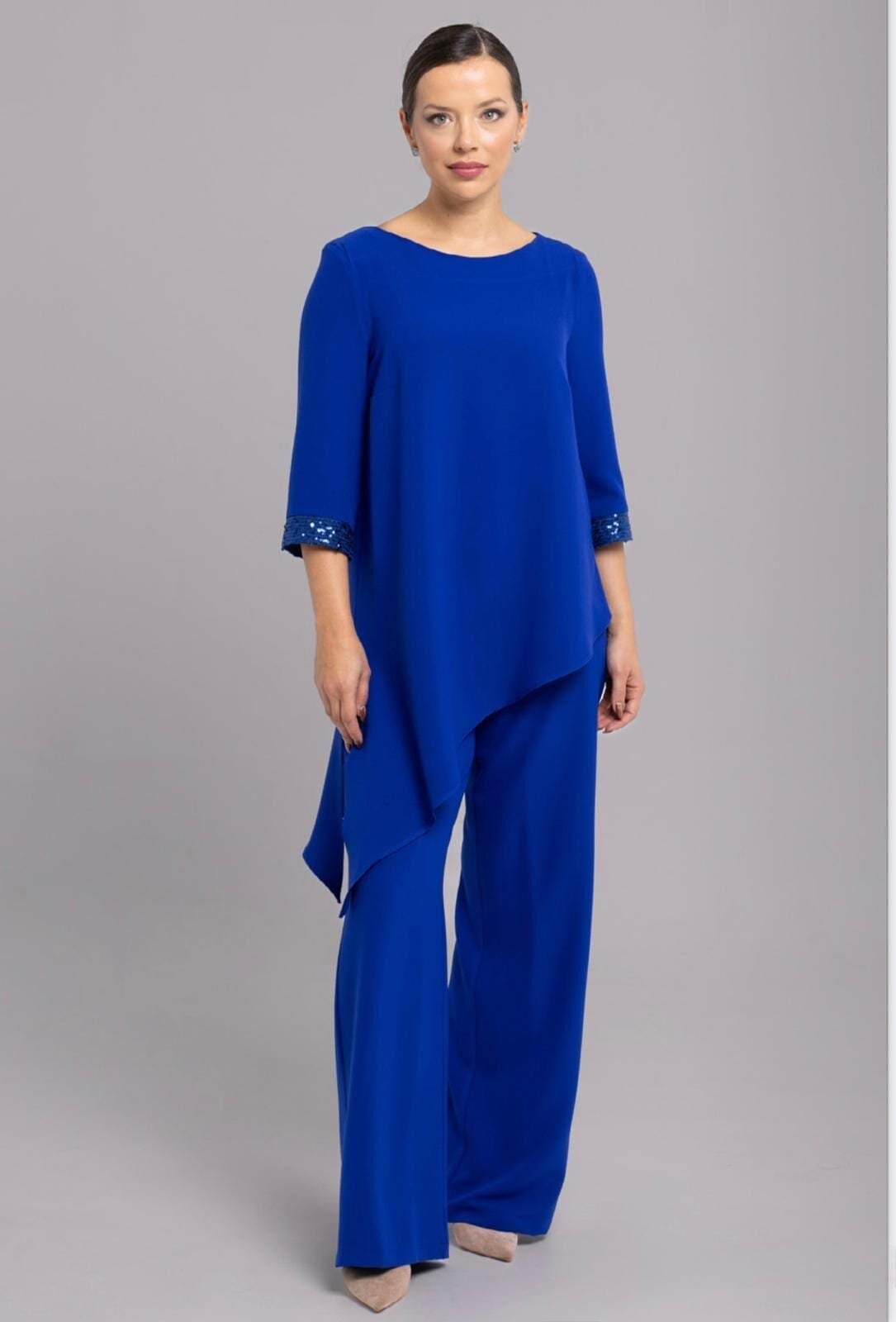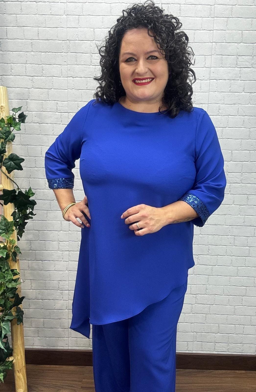 Este conjunto azul royal destaca por su diseño limpio con un toque especial: puños adornados con lentejuelas que aportan luz sin exagerar. La blusa asimétrica de corte largo estiliza visualmente y ofrece comodidad total, mientras que el pantalón fluido equilibra el look con movimiento y frescura. Ideal para eventos formales o celebraciones, es una prenda que se adapta a distintas siluetas gracias a su confección en tallas inclusivas. Una opción moderna y elegante que realza tu presencia con sutileza y confianza.