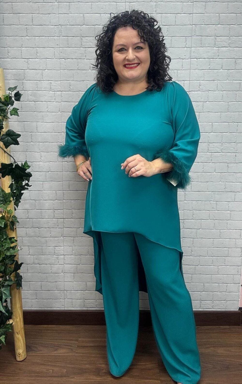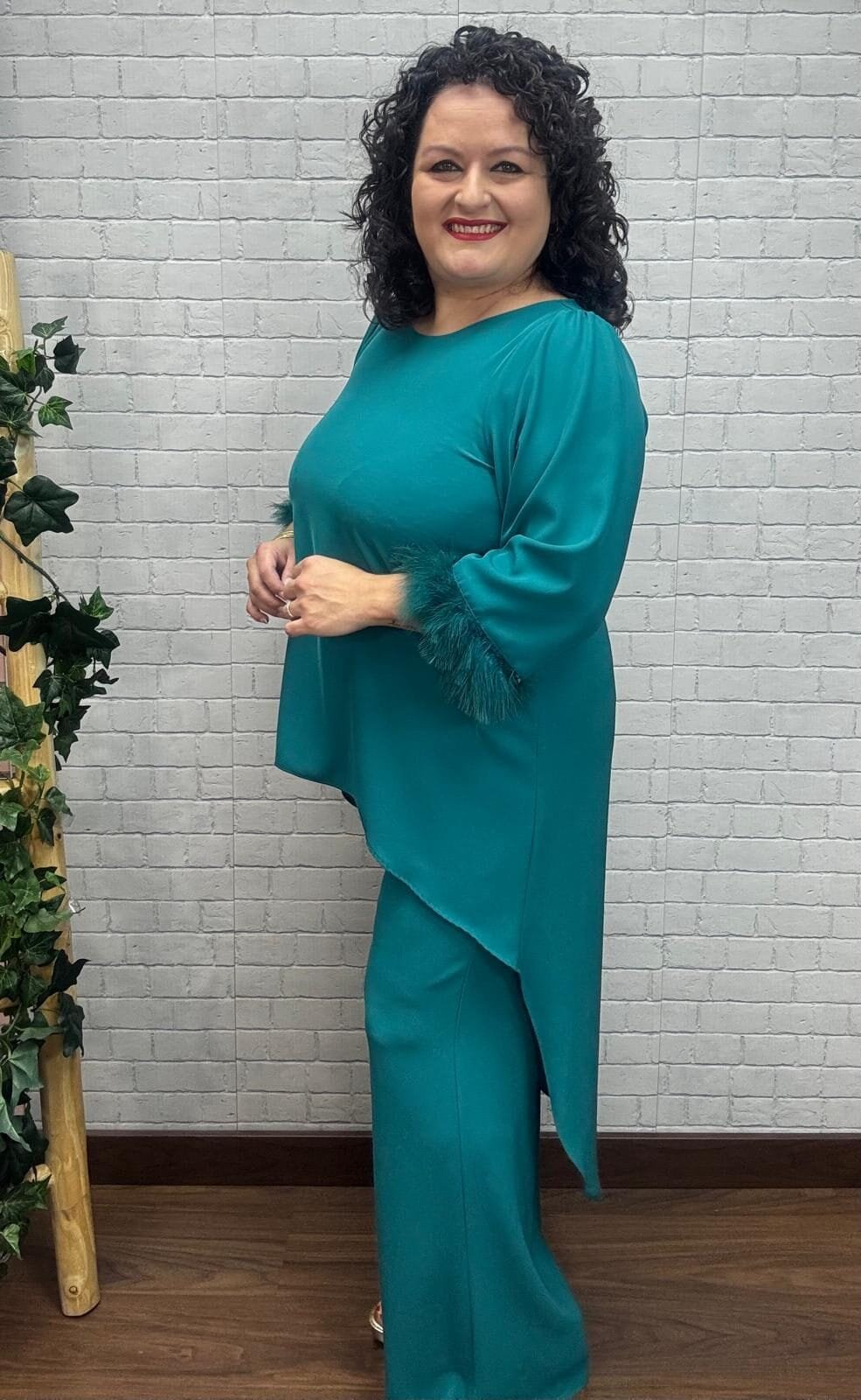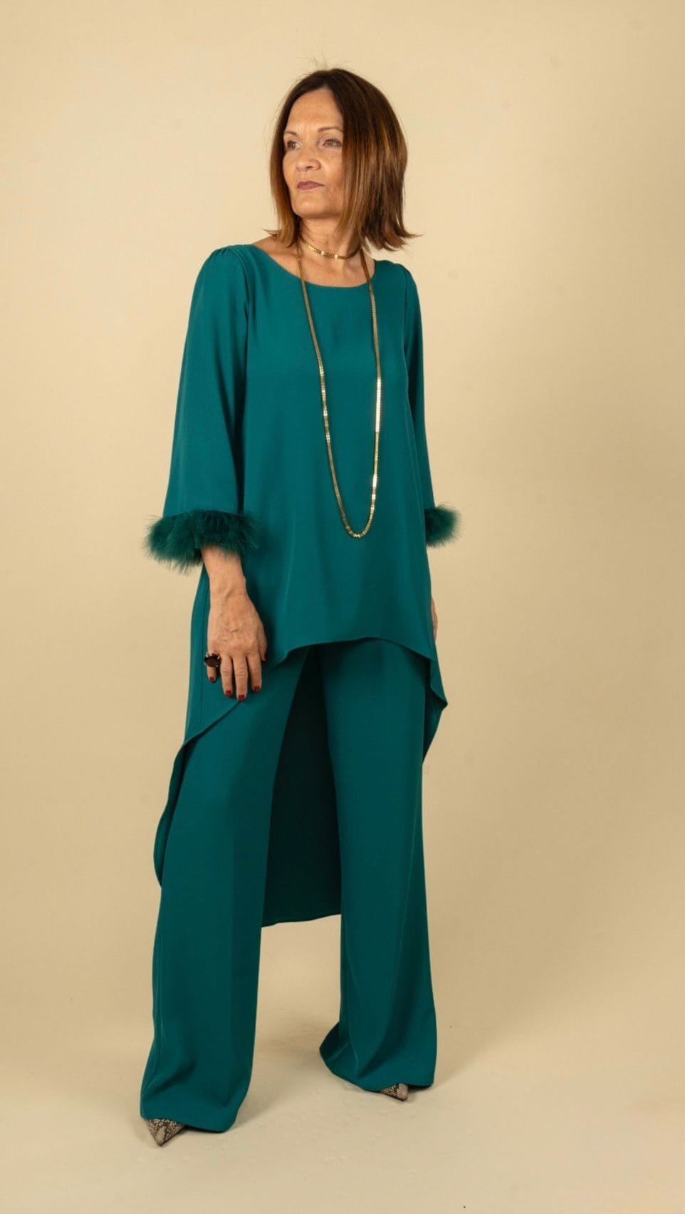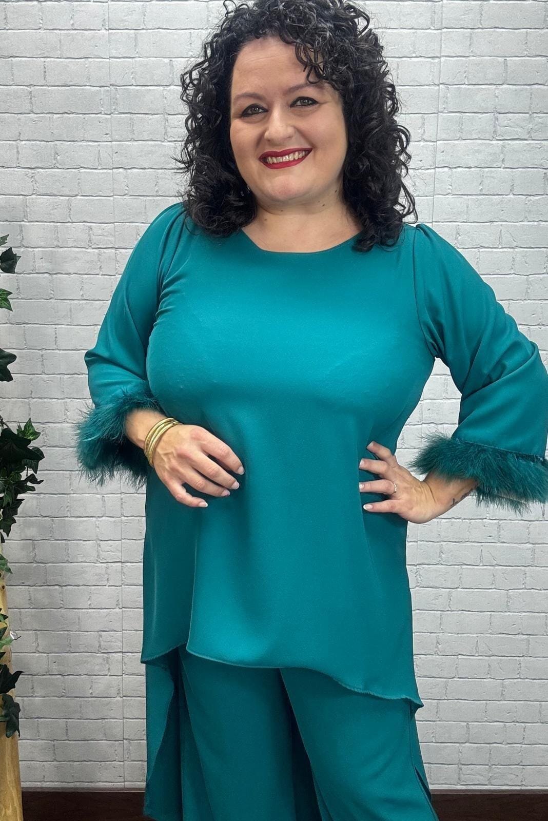 Este conjunto en tono azul océano es sinónimo de elegancia relajada con un guiño audaz. La blusa de corte asimétrico y largo generoso estiliza la silueta, mientras que los puños adornados con plumas añaden un detalle glamuroso que marca la diferencia. El pantalón fluido aporta confort y movimiento, ideal para celebraciones o eventos donde quieras lucir única y cómoda. Disponible en tallas inclusivas, su diseño está pensado para realzar tu figura con suavidad y estilo. Una opción sofisticada, original y muy favorecedora.
