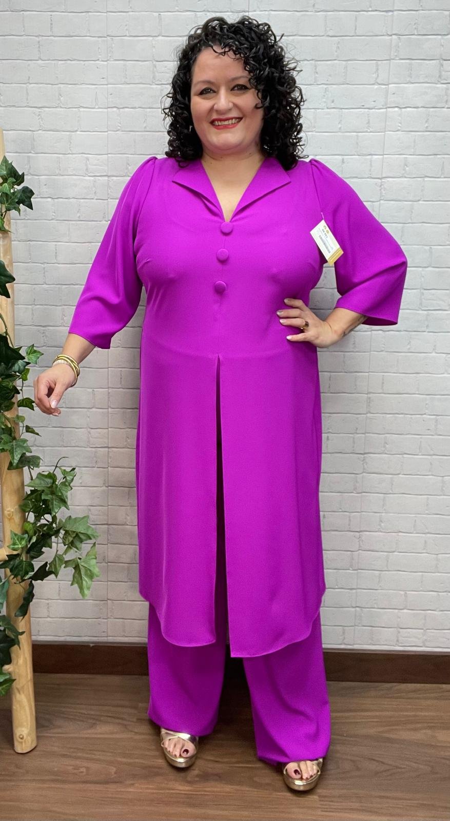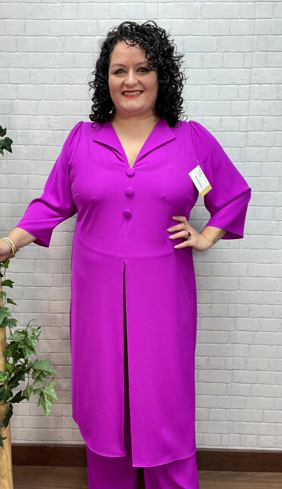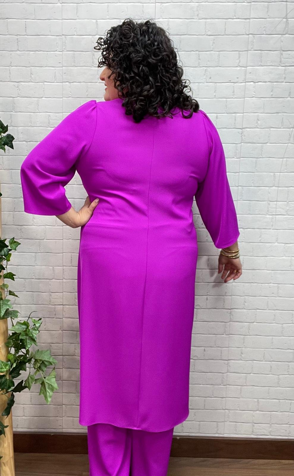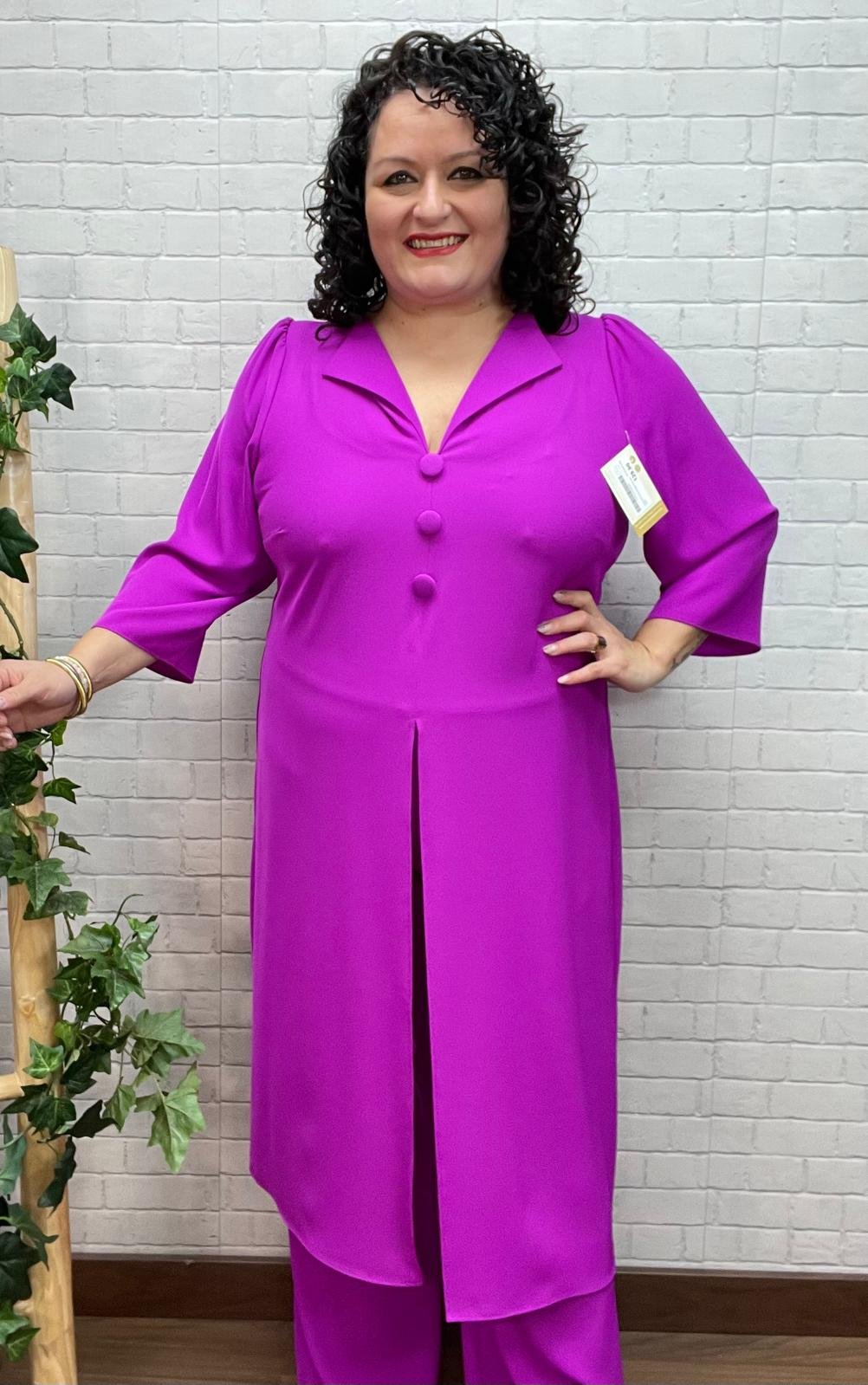 Este conjunto elegante de dos piezas en color buganvilla es una apuesta segura para brillar en cualquier evento especial. Un diseño sofisticado y atemporal, pensado para favorecer diferentes tipos de cuerpo, tanto en moda estándar como curvy, sin renunciar a la comodidad.