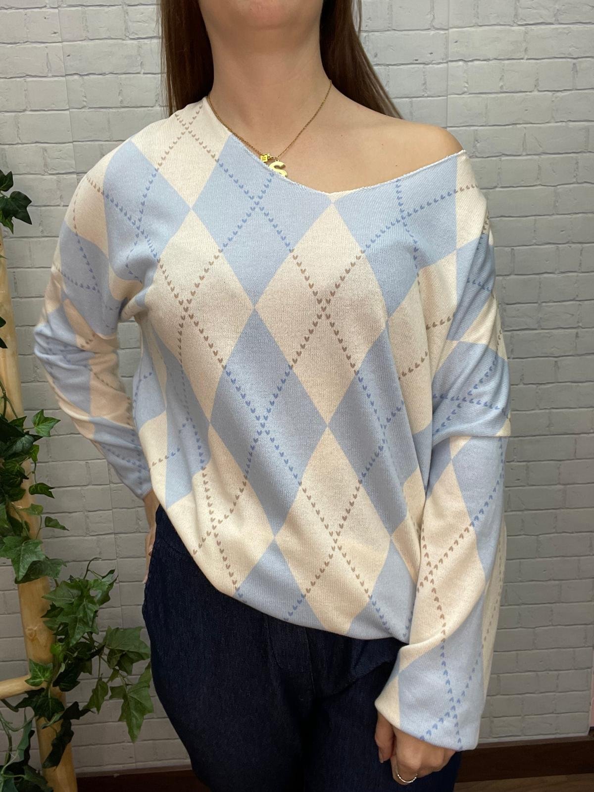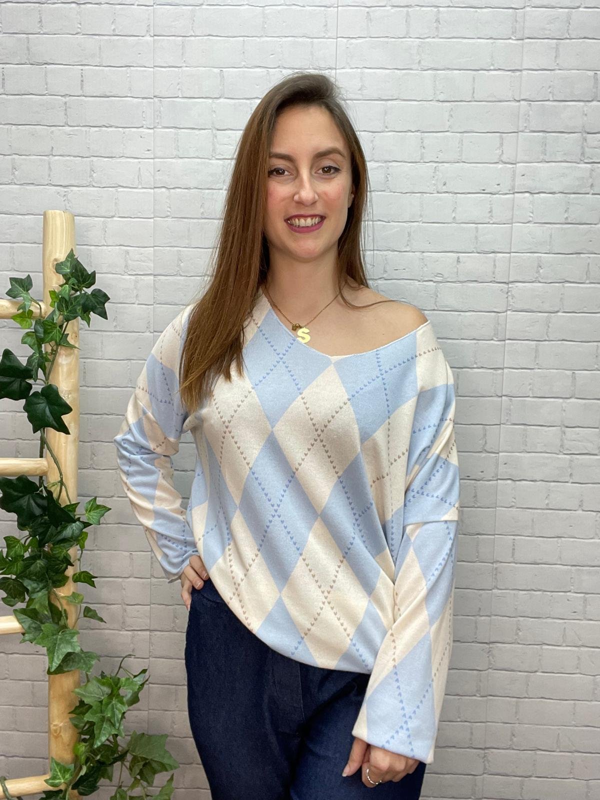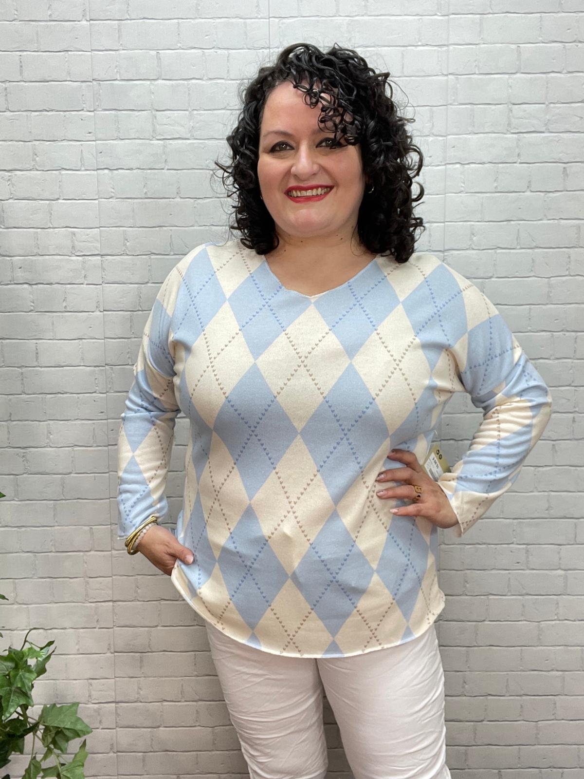 Este jersey de rombos en tonos azul cielo y beige es ese básico especial que eleva cualquier look sin esfuerzo. Su diseño tipo argyle, atemporal y elegante, aporta un toque sofisticado a un modelo pensado para el confort diario y para favorecer todo tipo de siluetas, tanto en moda estándar como curvy.