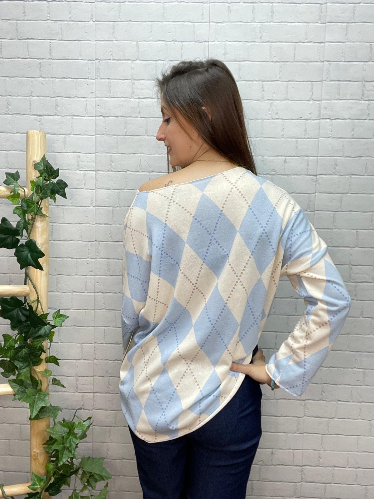 •Jersey de punto suave con estampado de rombos en azul y beige. Cómodo, ligero y muy favorecedor, perfecto para looks diarios con estilo.