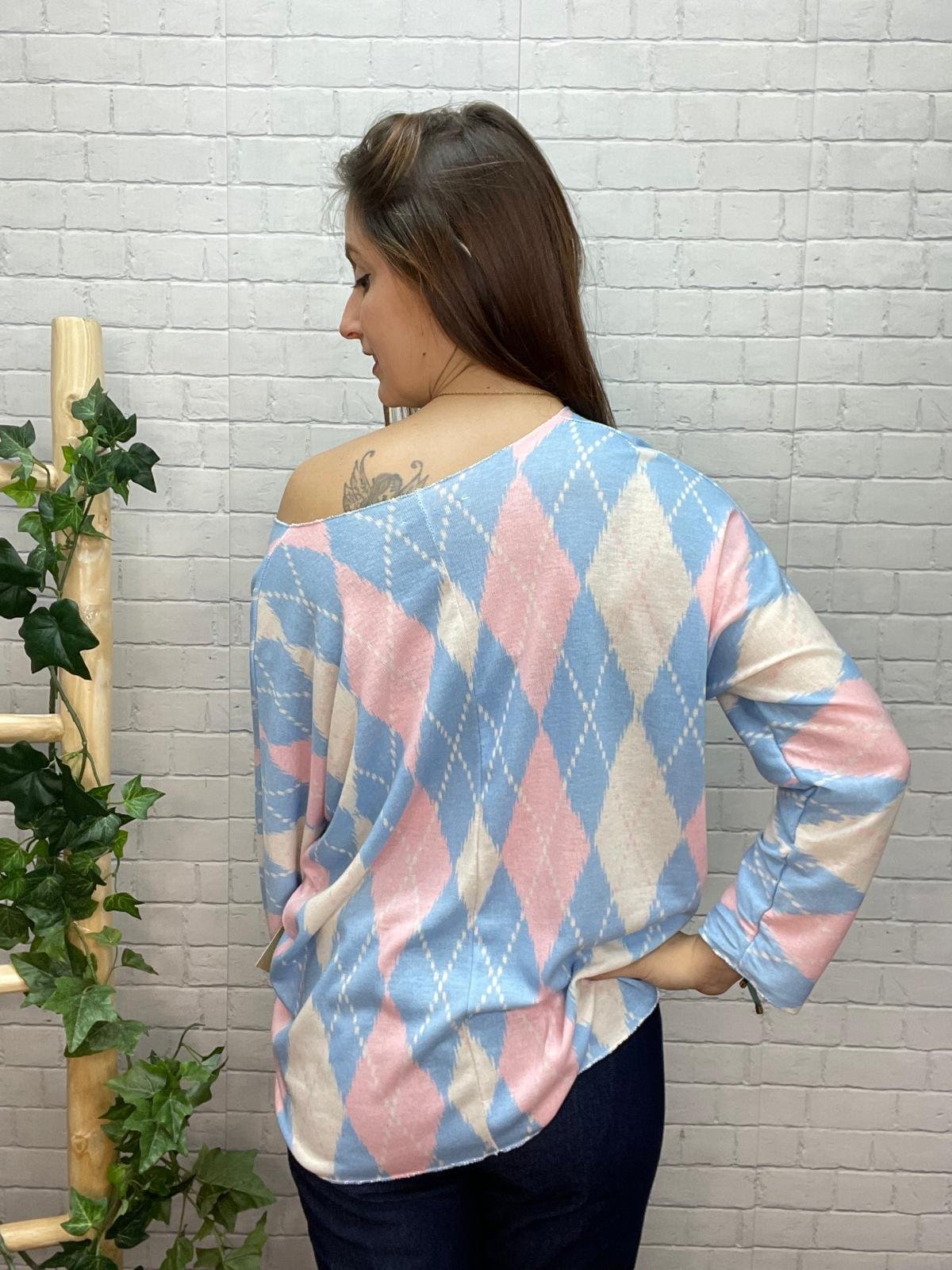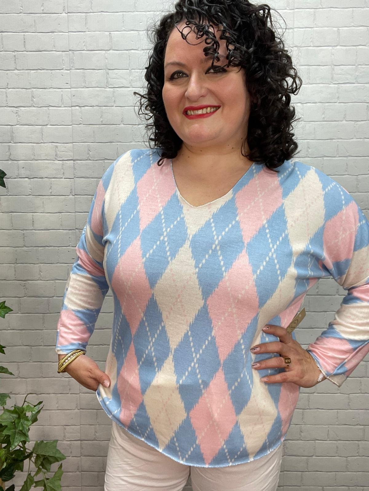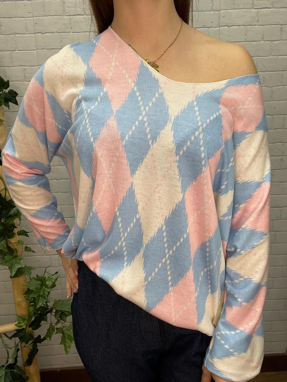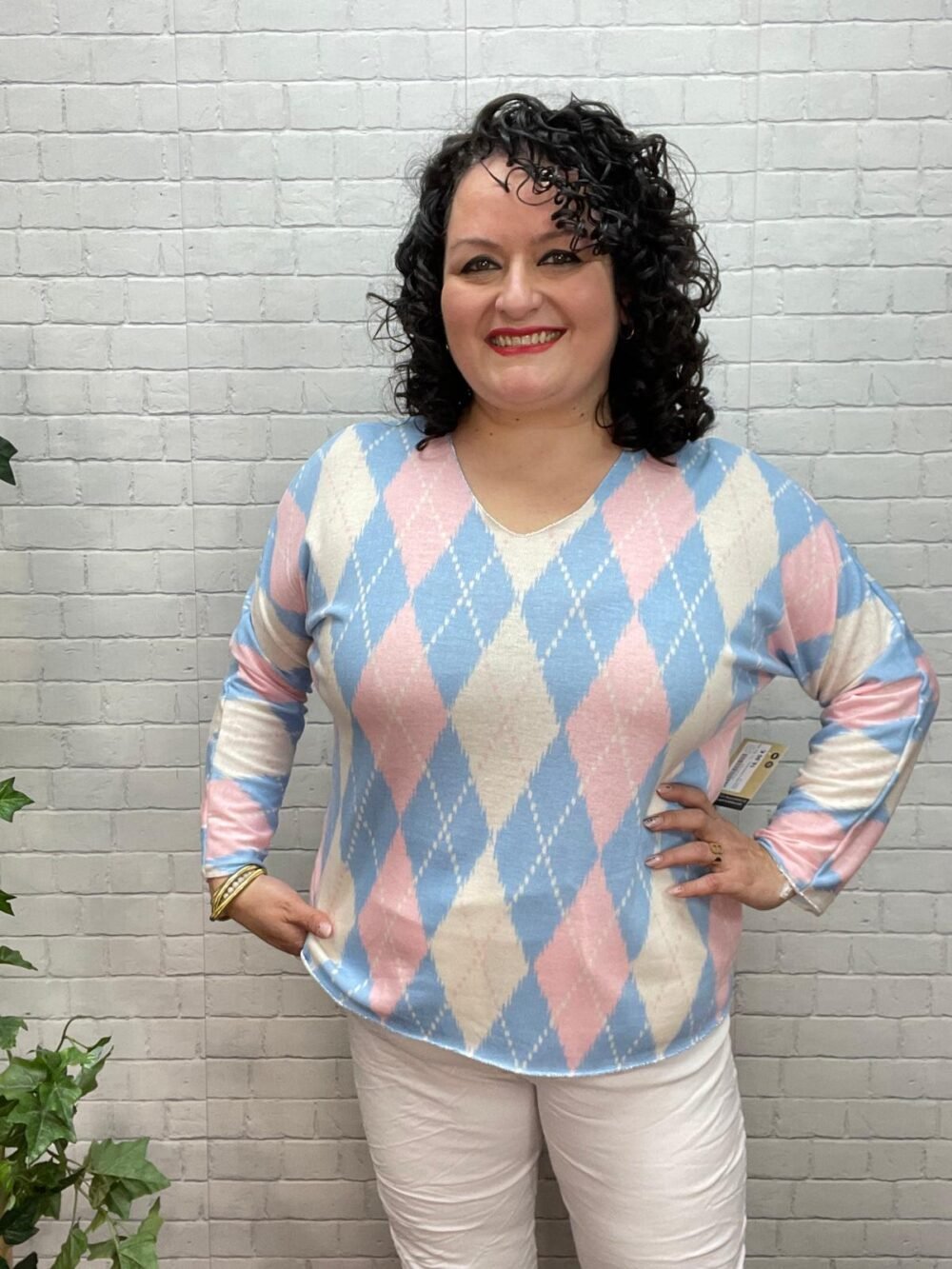 Este jersey estampado de rombos para mujer es una prenda especial que combina comodidad, diseño y un aire dulce muy actual. Su estampado tipo argyle en tonos azul, rosa y crudo aporta luz al rostro y un toque moderno que eleva cualquier look diario.