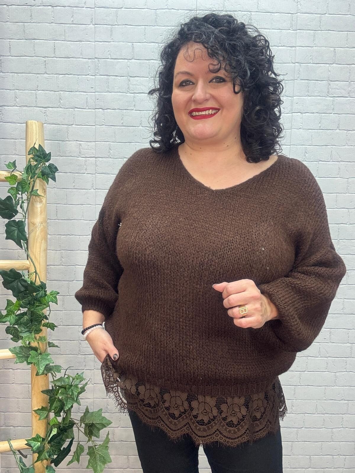 Este jersey de punto para mujer curvy combina comodidad, feminidad y diseño en una sola prenda. Su tejido de punto cálido y agradable al tacto lo convierte en una opción ideal para el día a día, aportando confort sin renunciar al estilo.