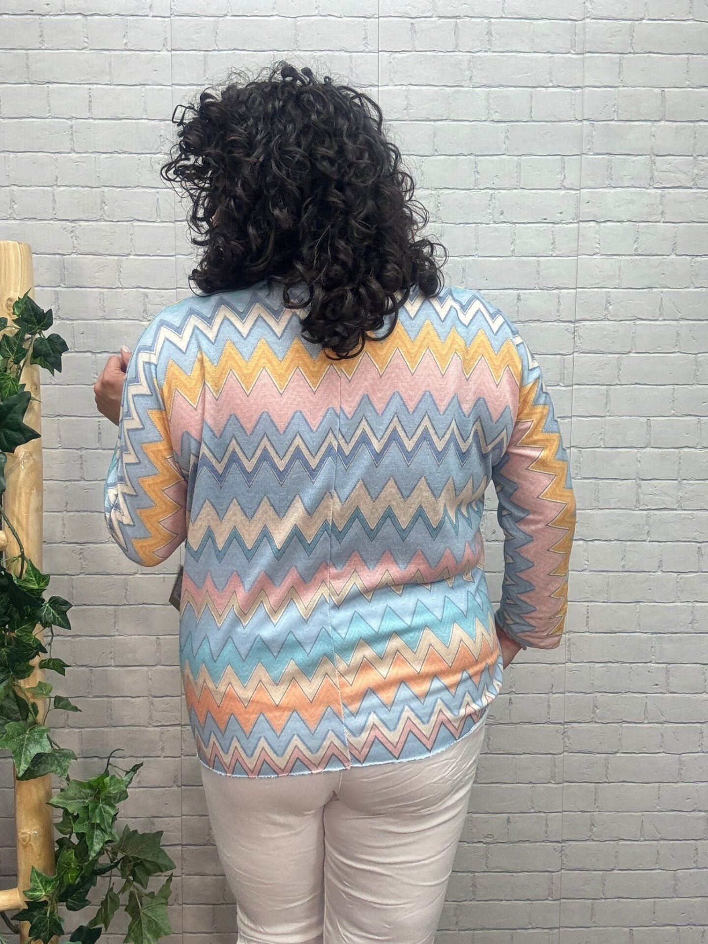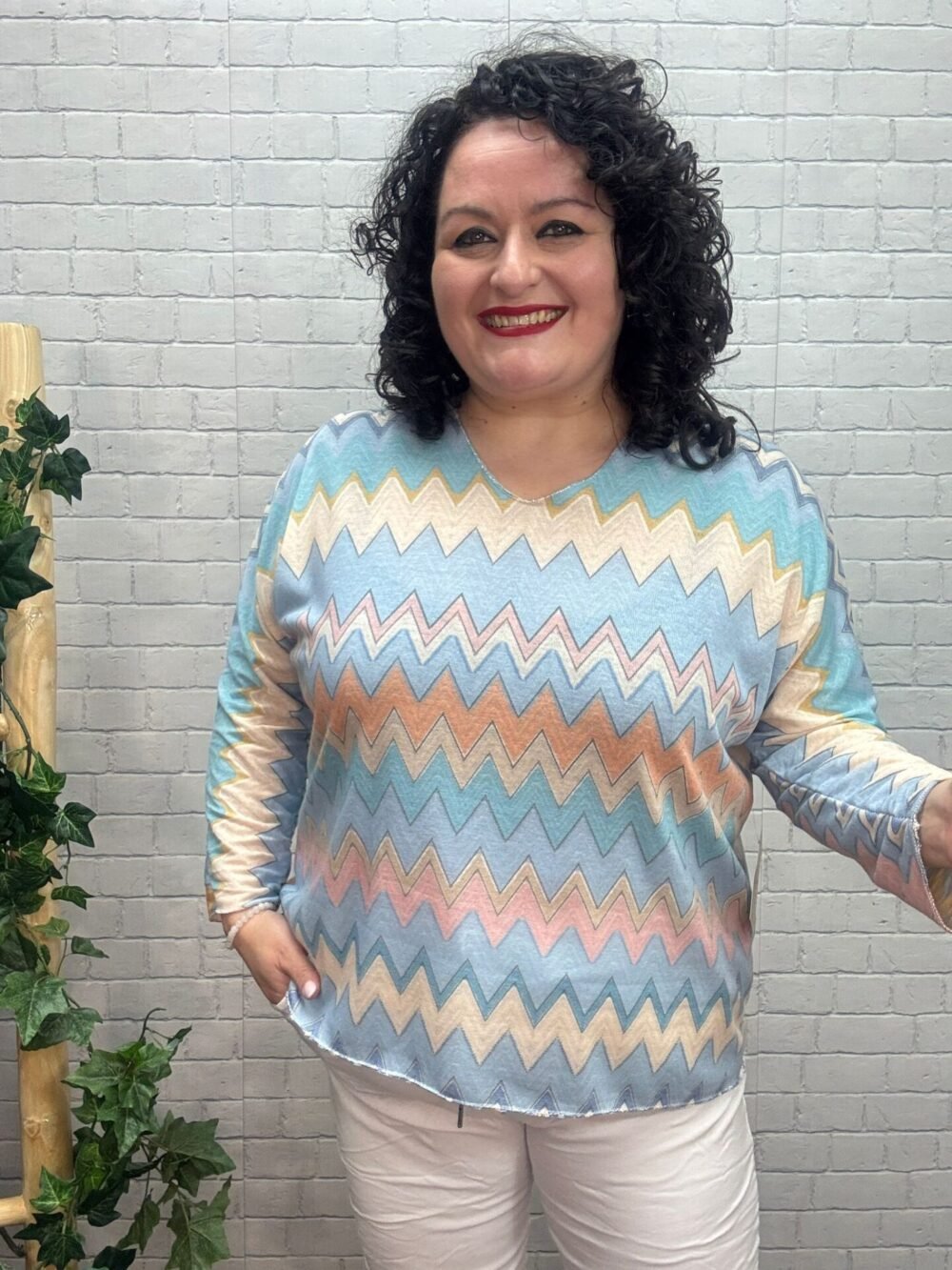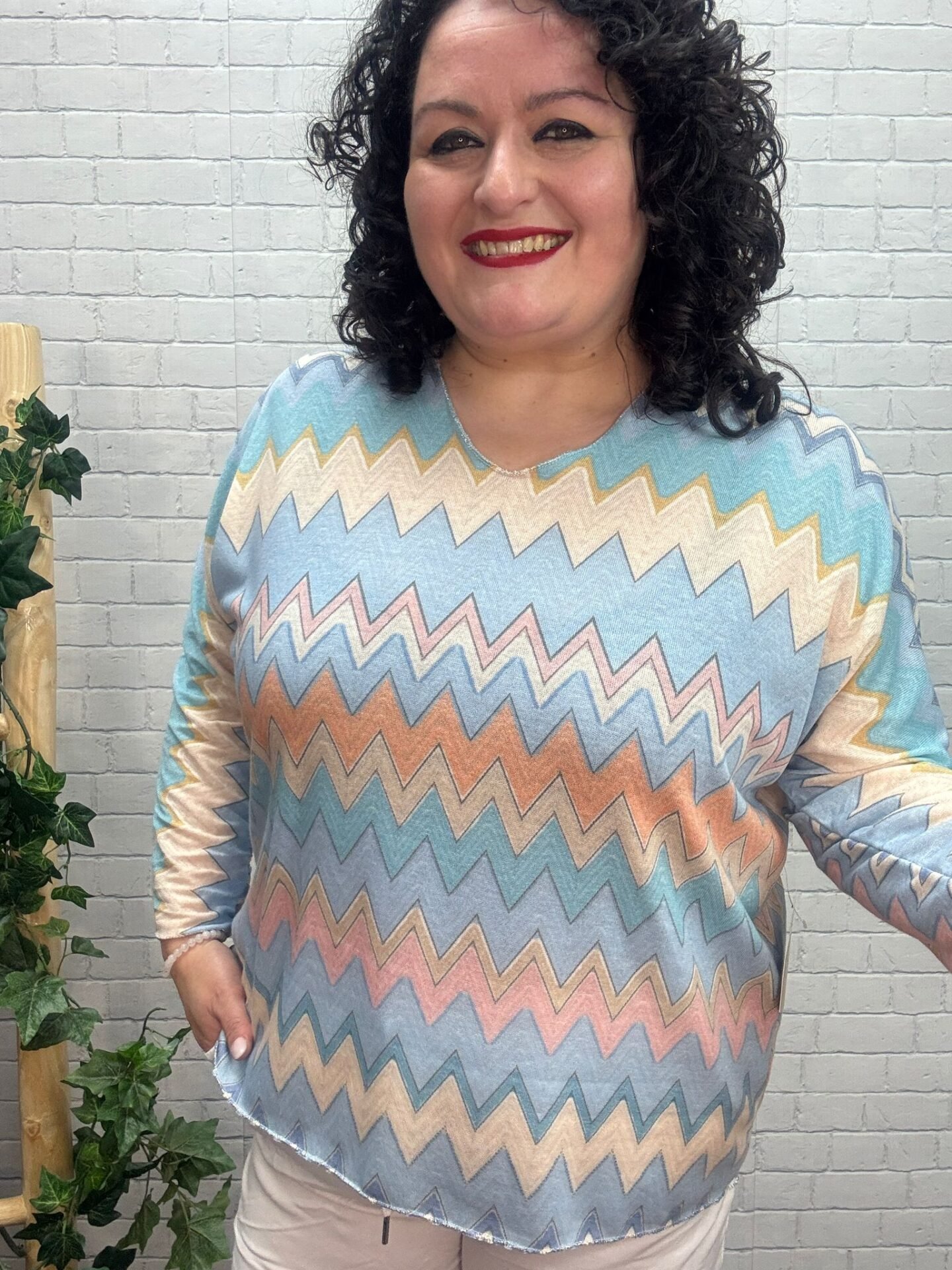 Atrévete a destacar con este jersey estampado zigzag para mujer curvy, una prenda original que combina suavidad, diseño y máxima comodidad. Su mezcla de tonos azul cielo, beige, coral y toques pastel crea un efecto visual dinámico que estiliza y aporta frescura al look.