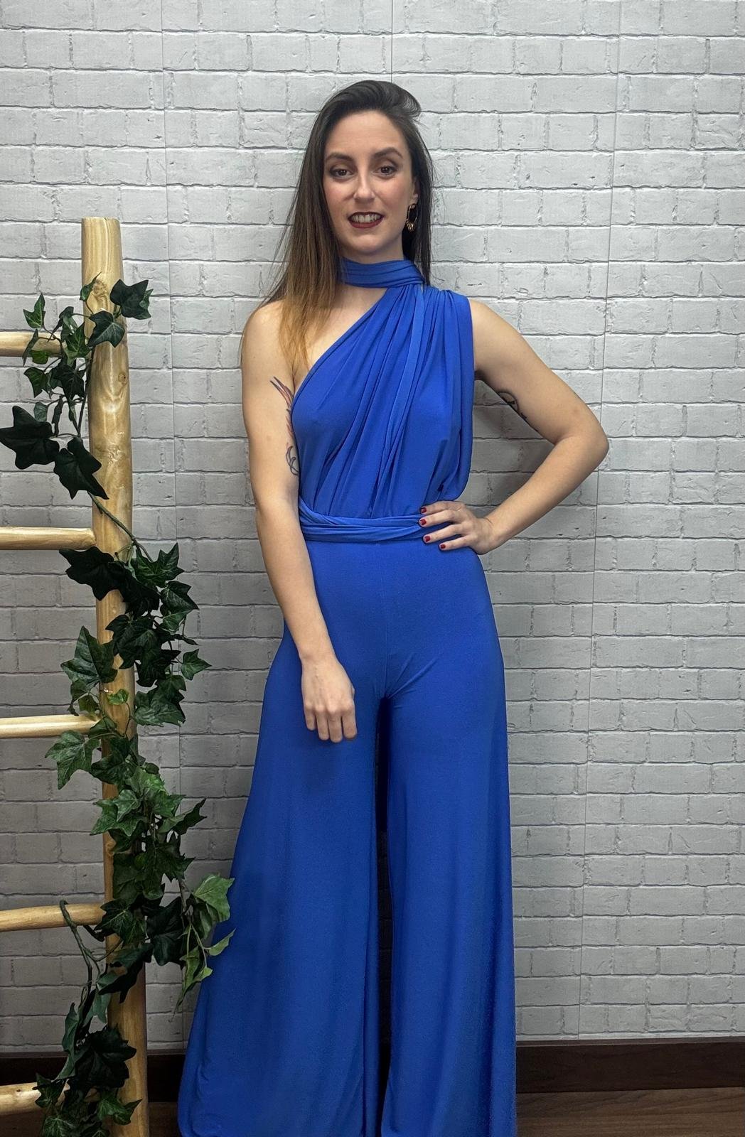 Atrévete a destacar con este mono multiposición largo de mujer en color azul klein, una prenda que combina sofisticación y modernidad en un diseño único. Su escote asimétrico con detalle tipo foulard envuelve el cuello con elegancia, creando un efecto visual estilizado que realza hombros y escote de forma sutil y sofisticada.