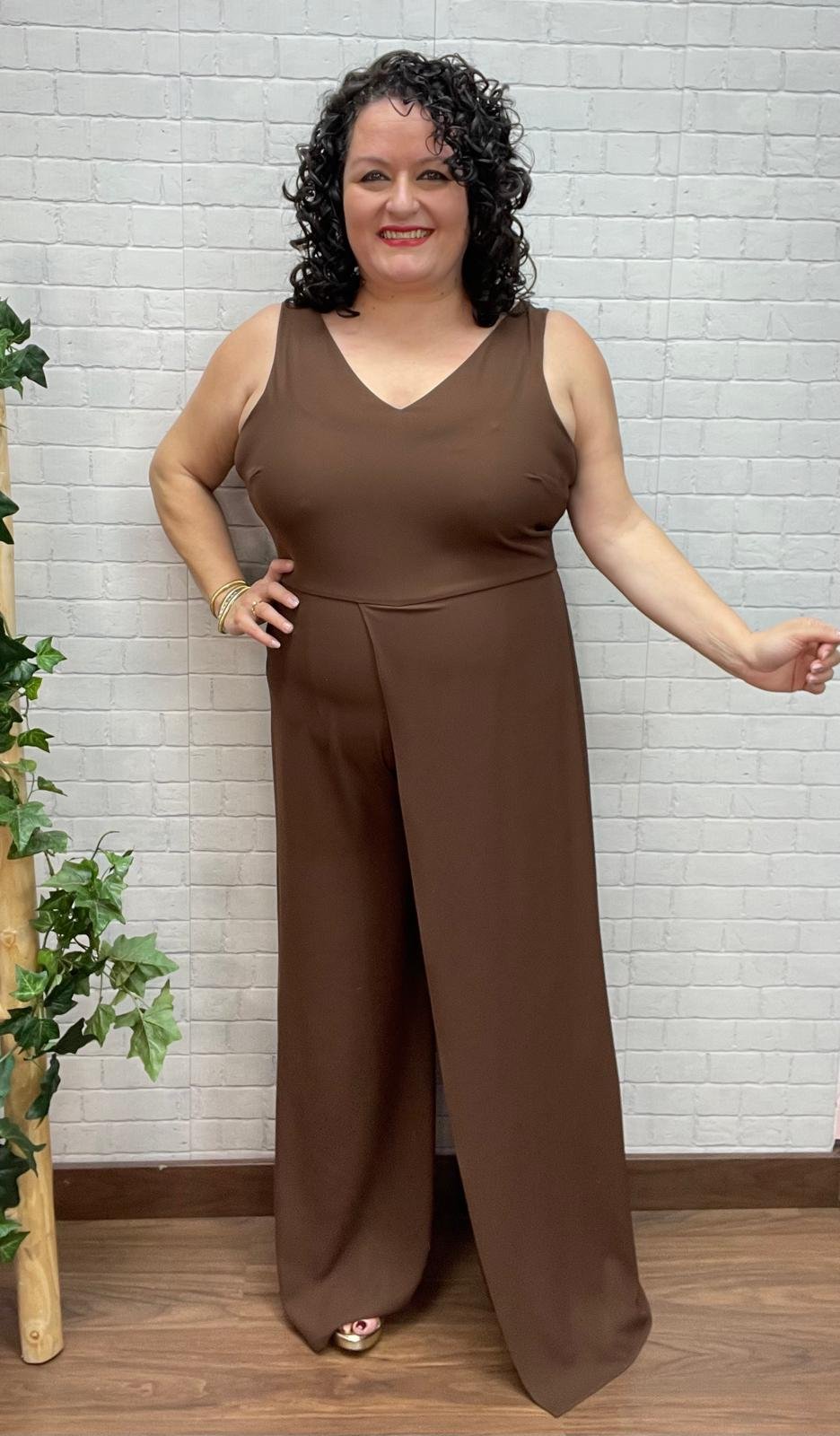 El mono, en color marrón chocolate, está confeccionado en tejido tipo crep, con una caída fluida y elegante. Presenta escote en pico, que estiliza la parte superior del cuerpo, y pantalón de corte recto y ancho, que alarga visualmente la pierna y aporta movimiento. Su diseño cómodo permite llevarlo durante horas sin renunciar al confort, convirtiéndolo en una prenda base perfecta y muy versátil.