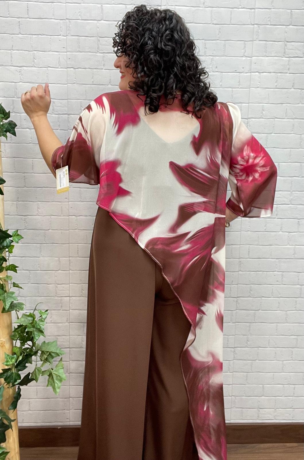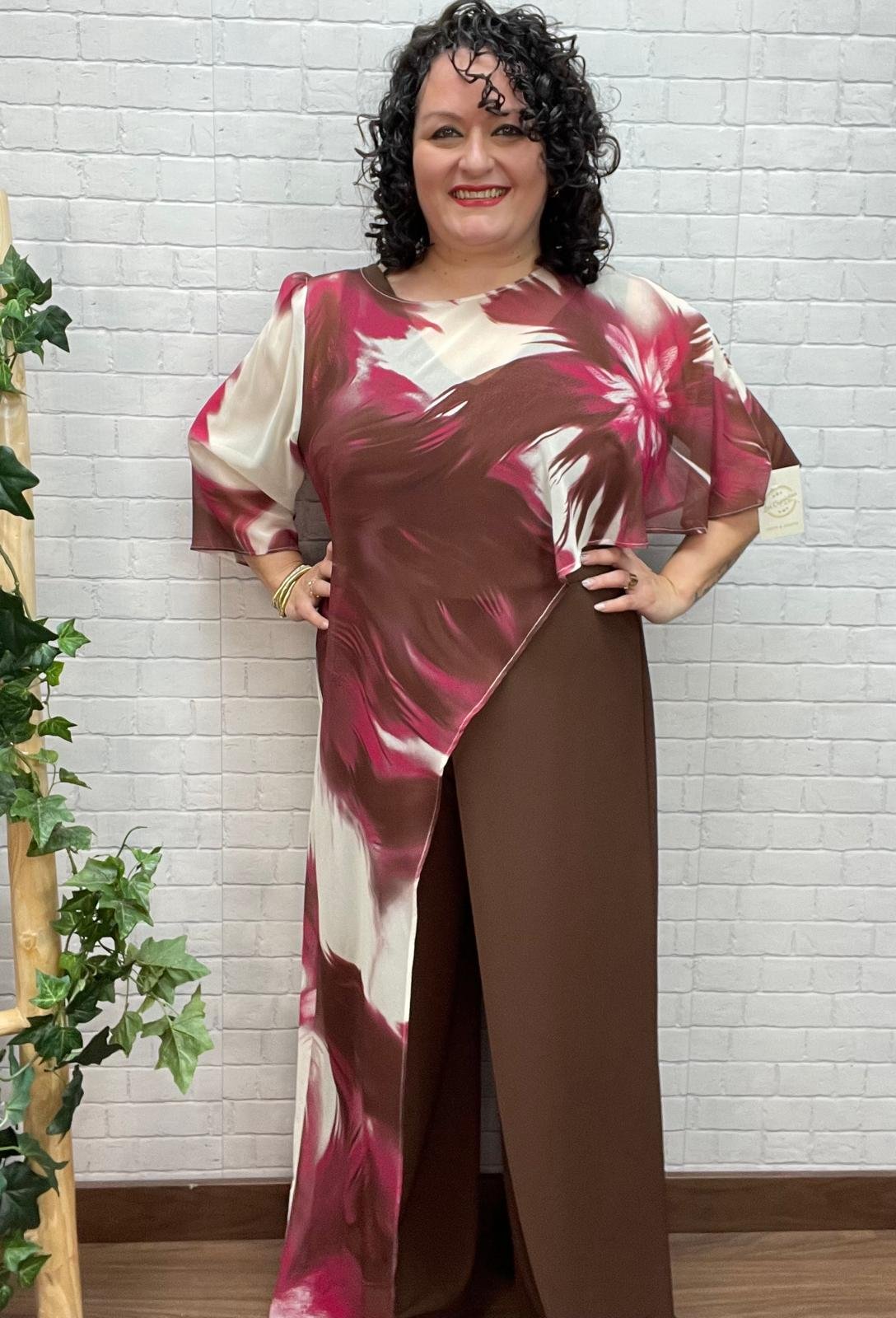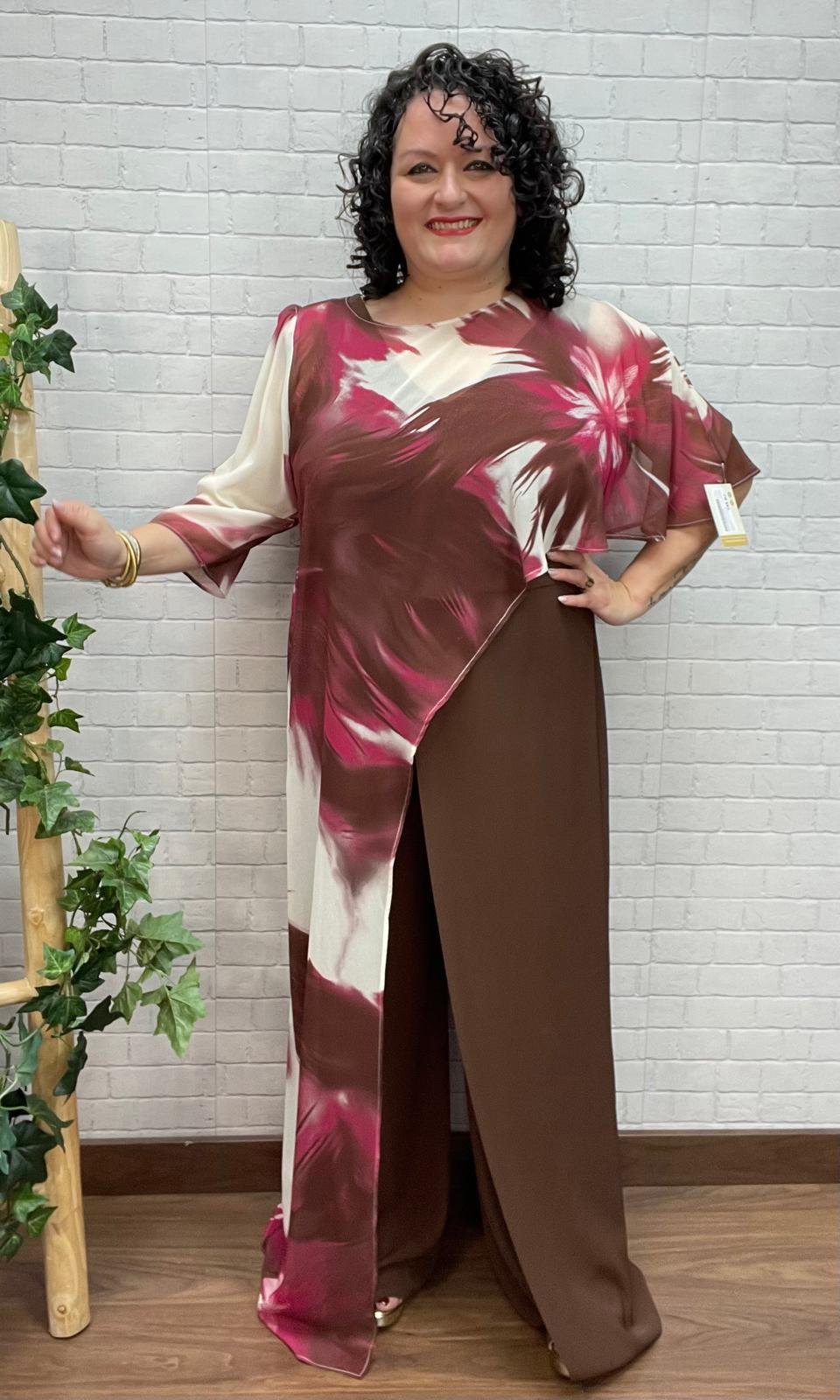 La casaca es la pieza protagonista del conjunto. Confeccionada en un tejido ligero y vaporoso, luce un estampado artístico en tonos burdeos, crema y marrón que aporta profundidad y sofisticación. Su diseño asimétrico, con una capa superpuesta y caída fluida en uno de los laterales, rompe la simetría, disimula la zona del abdomen y crea un efecto visual muy estilizador. Las mangas amplias añaden elegancia y movimiento al look.