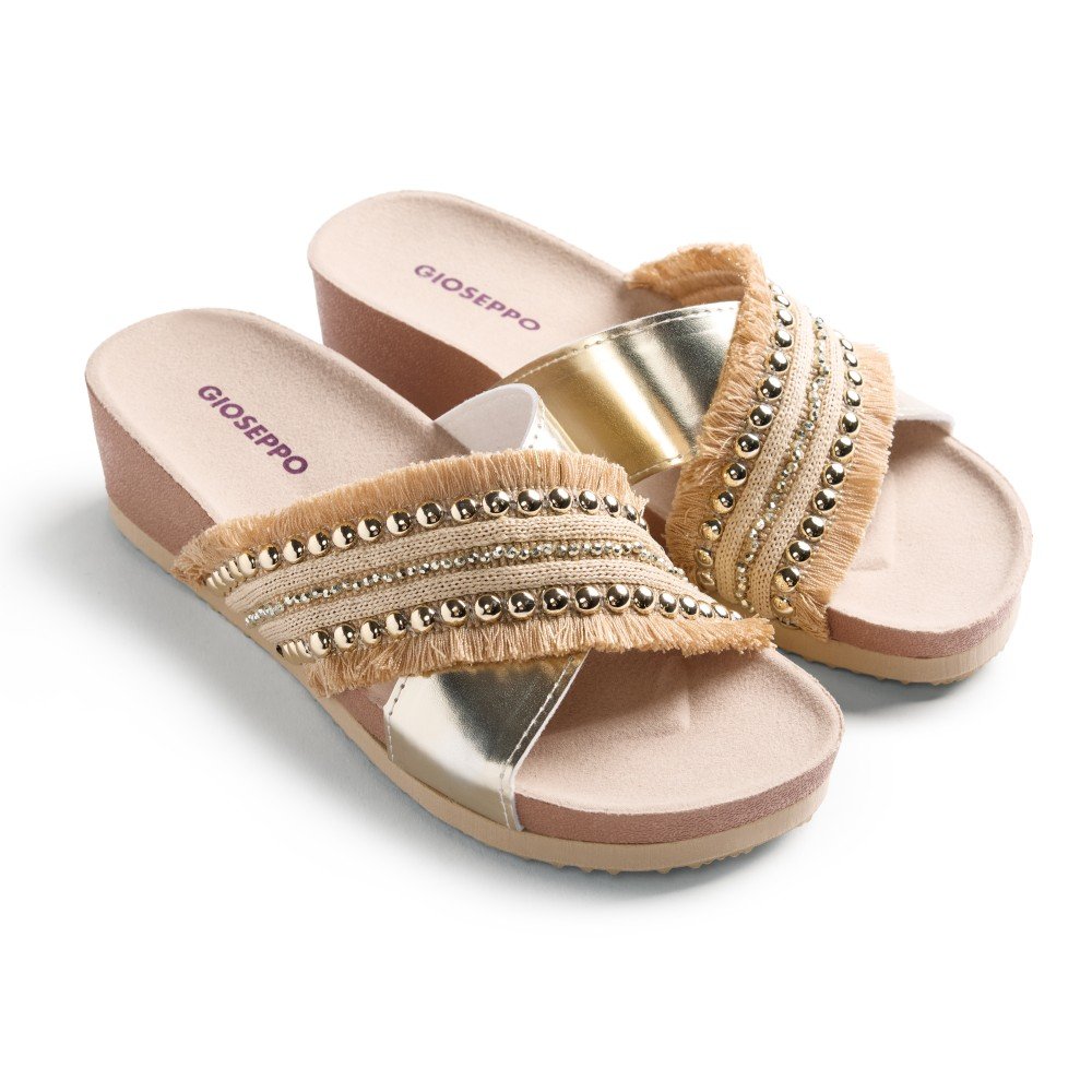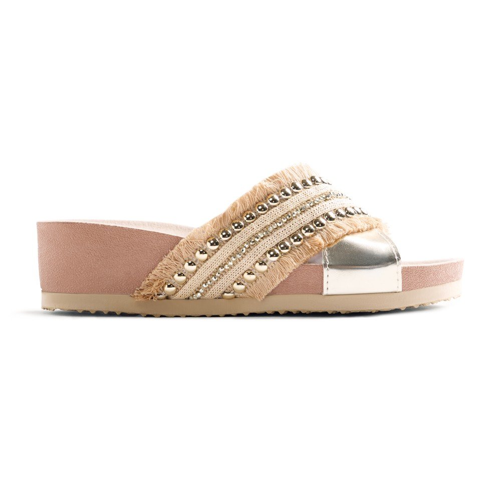 Sandalias de cuña con detalle de tachas, flecos y detalles metalizados. Cuentan con planta tipo bio, absorbente del sudor y con diseño ergonómico para repartir el peso de manera equilibrada. Altura cuña: 5 cm.
