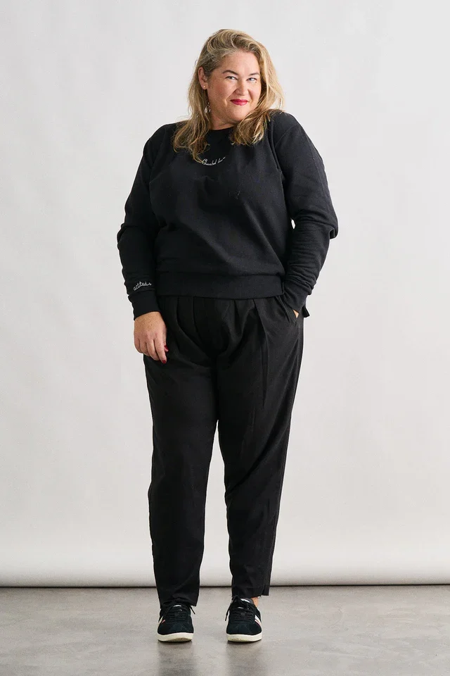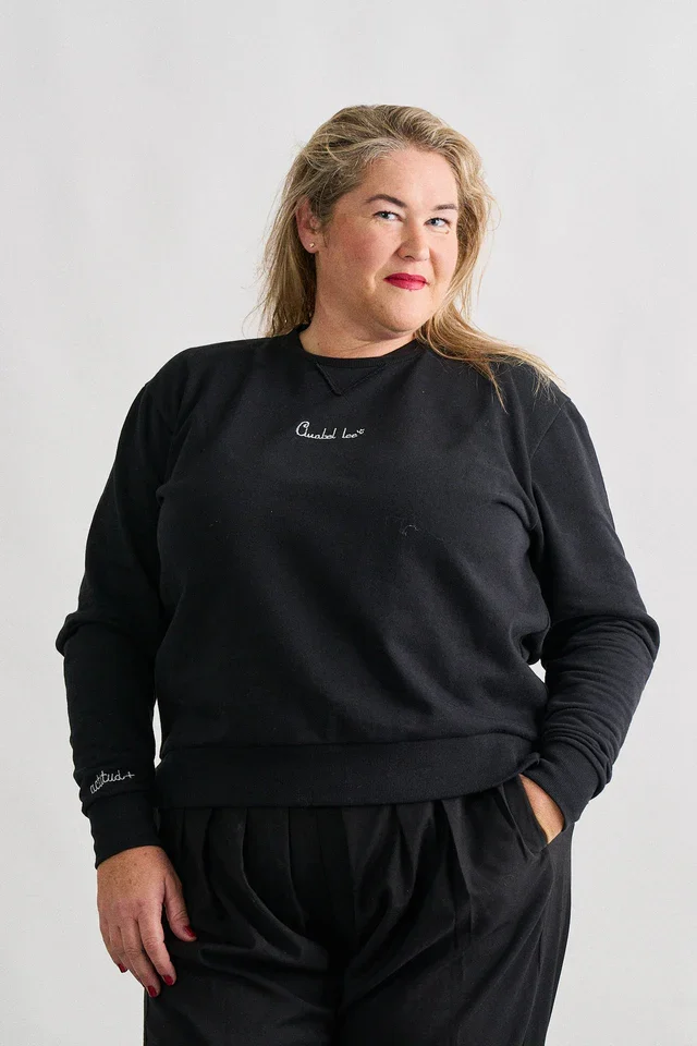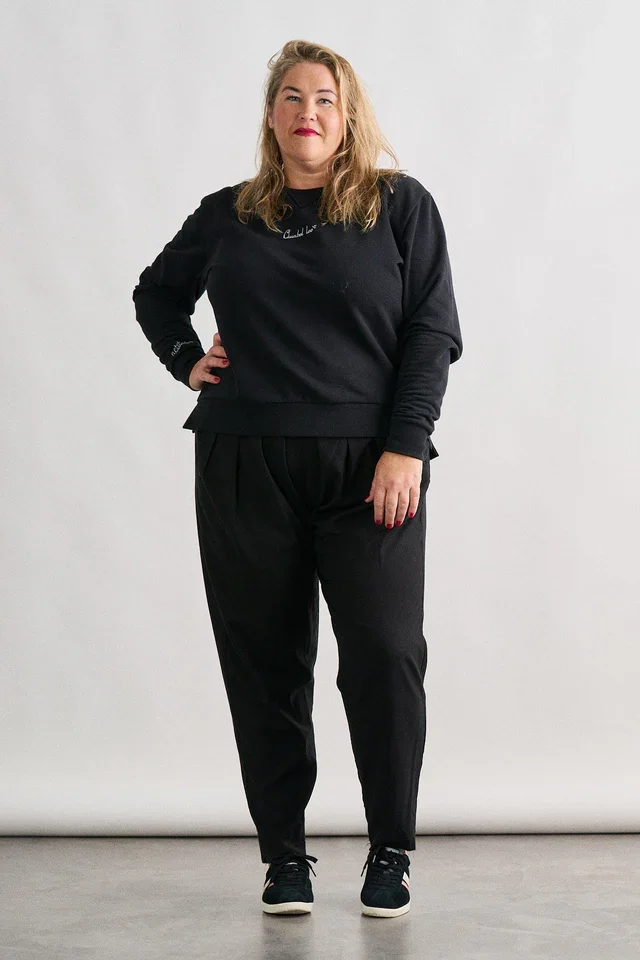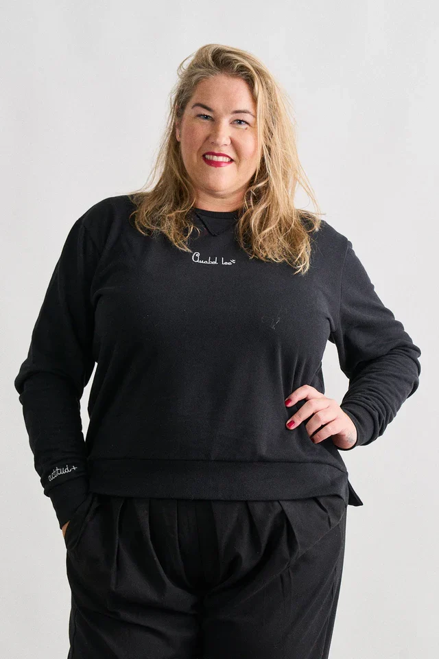 Disponible en negro y gris, dos colores atemporales y fáciles de combinar, esta sudadera se convierte en un fondo de armario imprescindible. El pequeño detalle bordado en el pecho aporta un toque delicado y elegante, ideal para mujeres que apuestan por la moda curvy actual, sin excesos pero con personalidad.
