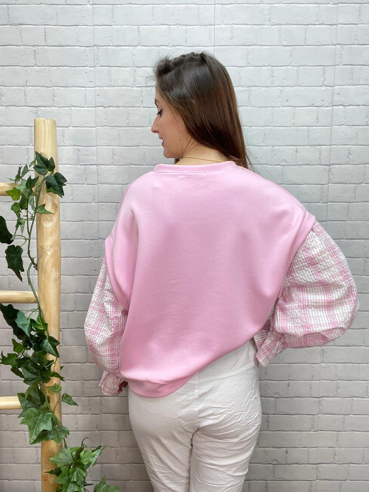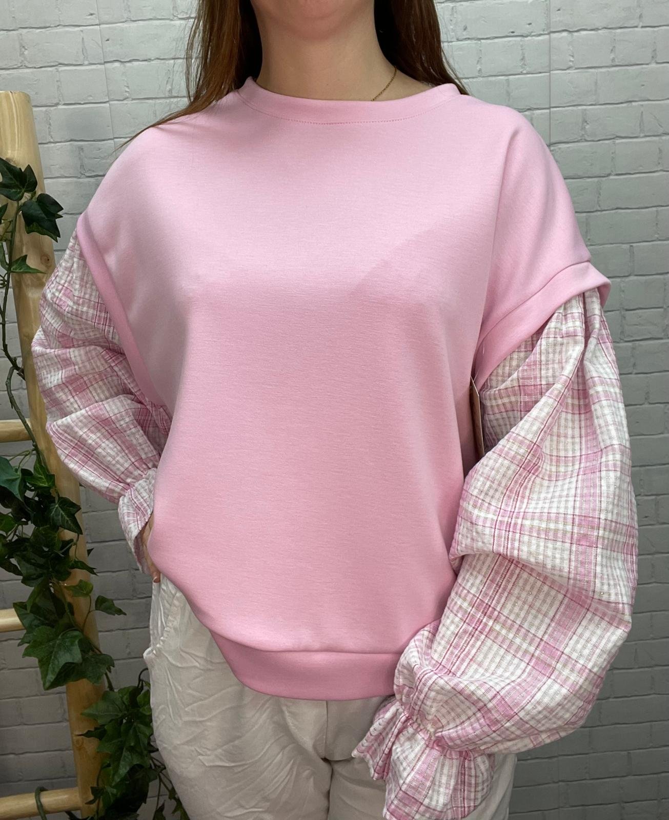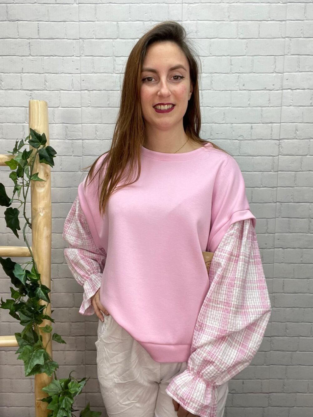 Dale un giro especial a tus looks diarios con esta sudadera rosa para mujer con mangas vichy, una prenda que combina la comodidad del estilo casual con el encanto romántico de los cuadros. Su diseño original mezcla cuerpo liso en tono rosa pastel con mangas amplias en estampado vichy, creando un contraste dulce, femenino y muy en tendencia.