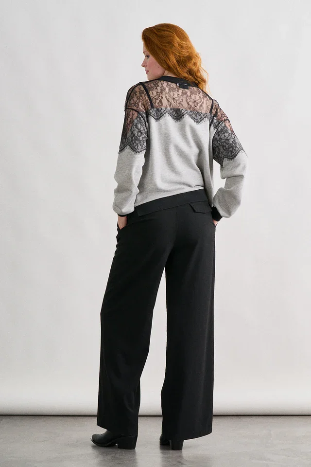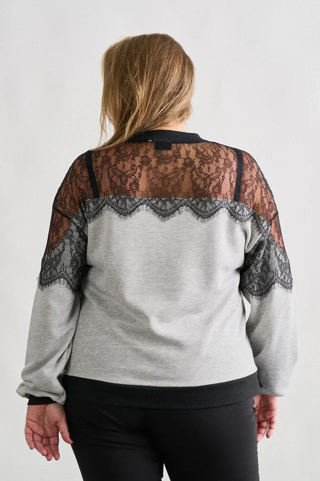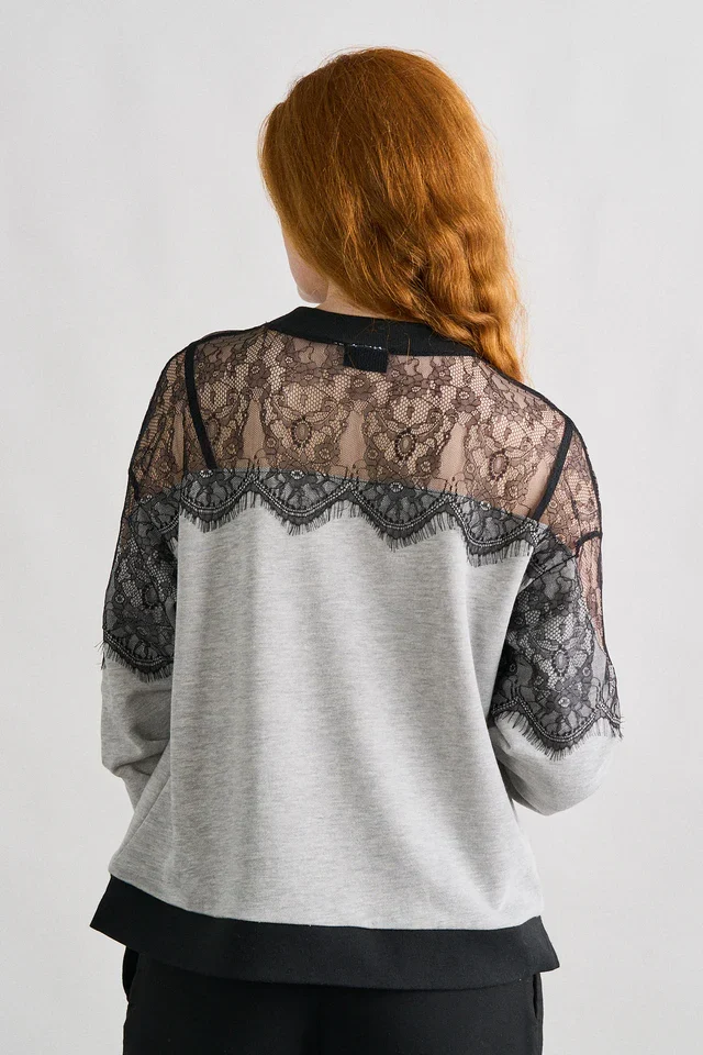 Esta sudadera gris con encaje es la prueba de que la comodidad y el estilo pueden ir de la mano. Su diseño combina un tejido suave y agradable al tacto con delicados detalles de encaje negro semitransparente en la parte superior, hombros y espalda, aportando un aire elegante, femenino y muy actual.