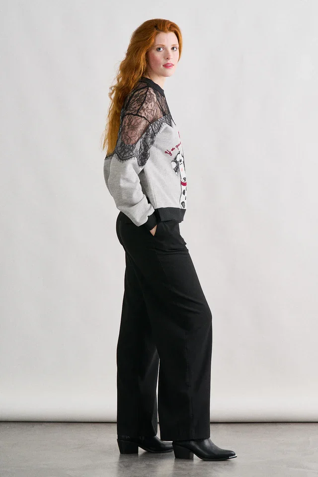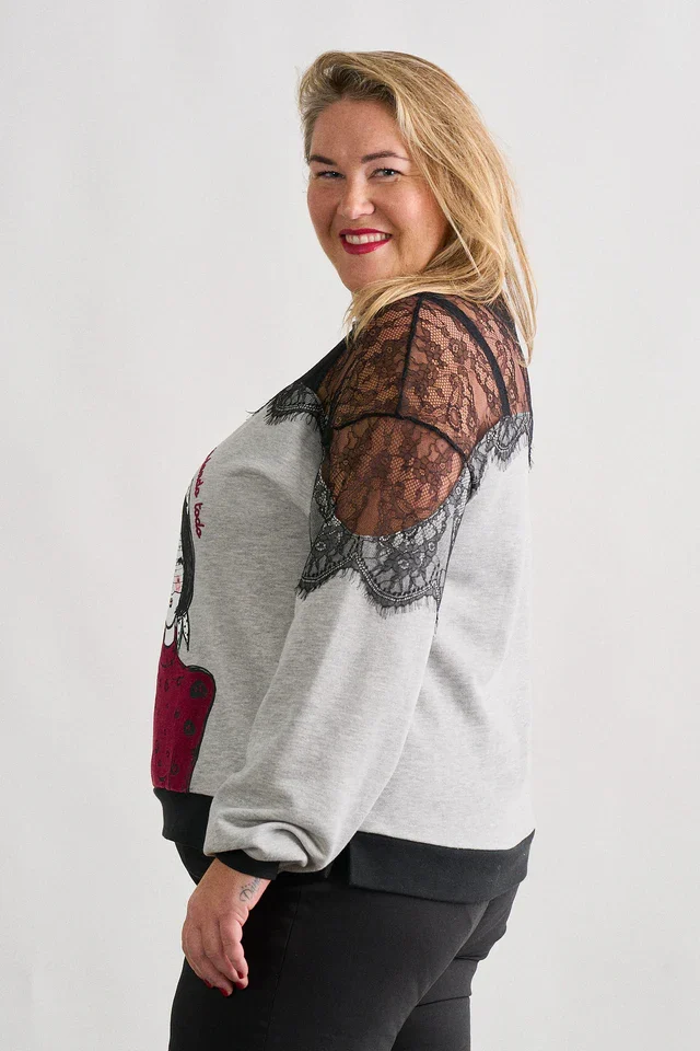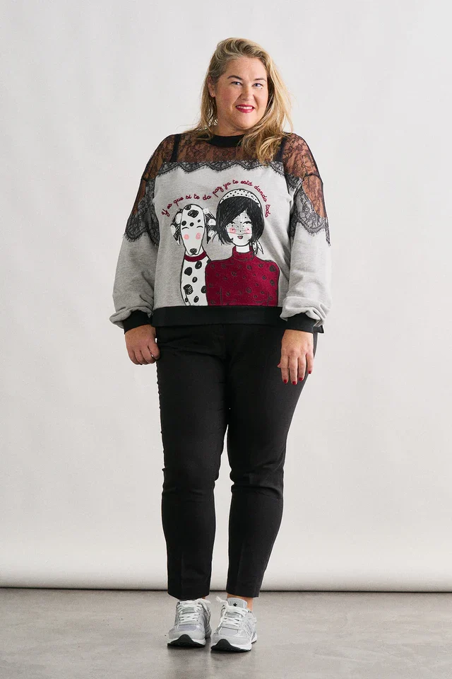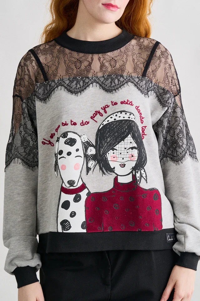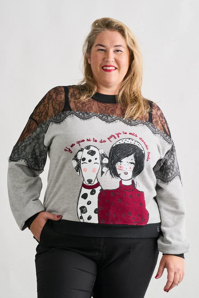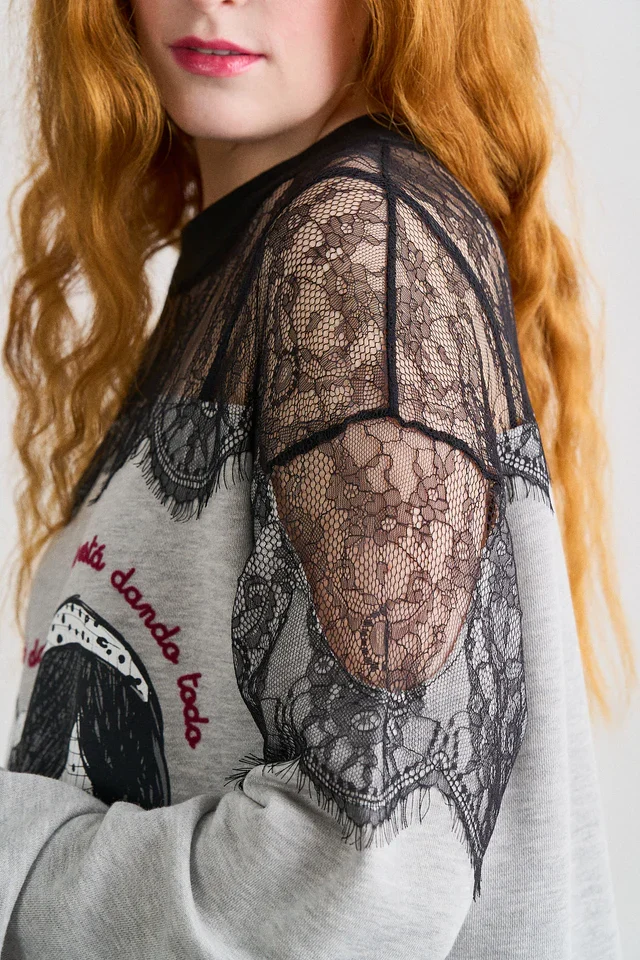 El print artístico frontal añade personalidad y carácter, convirtiéndola en una prenda especial, diferente y con alma. El contraste entre el gris jaspeado, el negro del encaje y los tonos del dibujo crea un efecto visual favorecedor que realza cualquier conjunto sin esfuerzo.