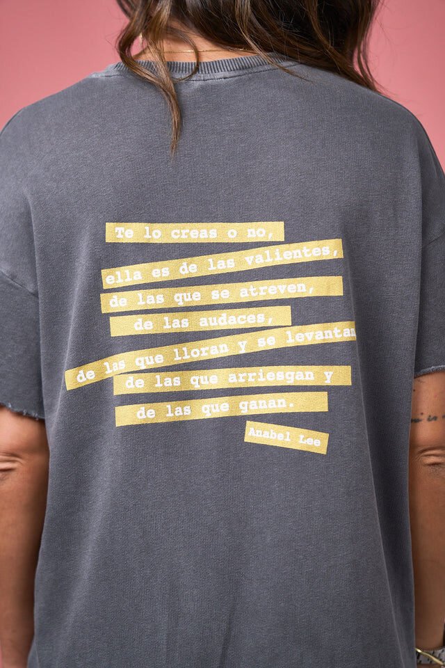 En la parte delantera, el maxi print se convierte en el centro de atención, mientras que en la espalda destaca una frase inspiradora en glitter dorado: “Te lo creas o no, ella es de las valientes, de las que se atreven, de las audaces, de las que lloran y se levantan, de las que arriesgan y de las que ganan.” Un mensaje poderoso que convierte este vestido en mucho más que una prenda, en toda una declaración de identidad.