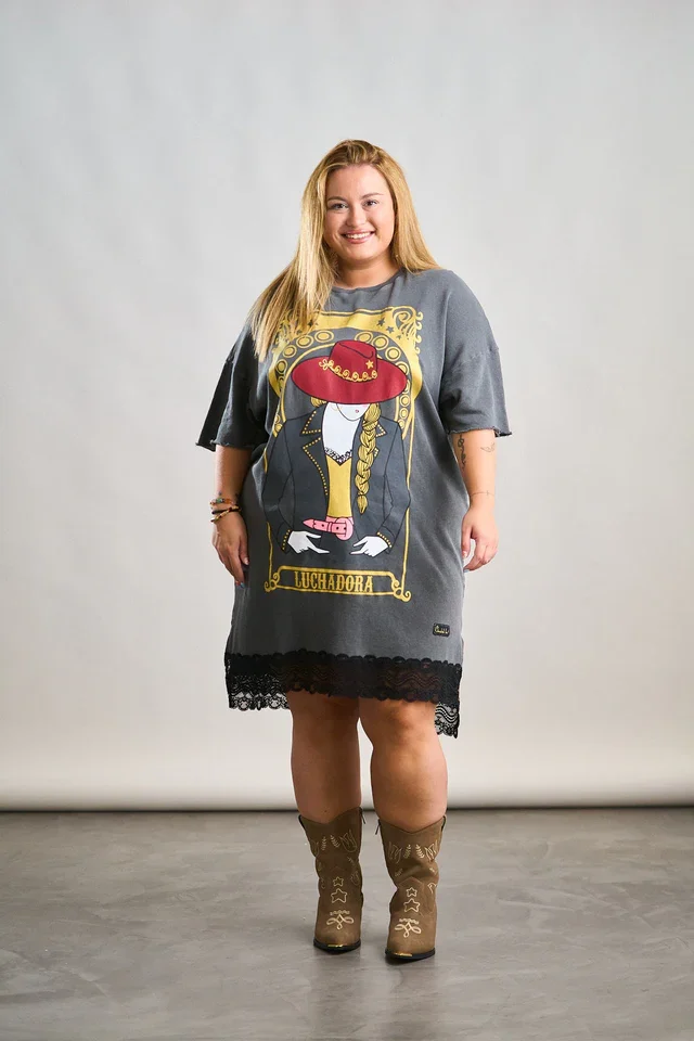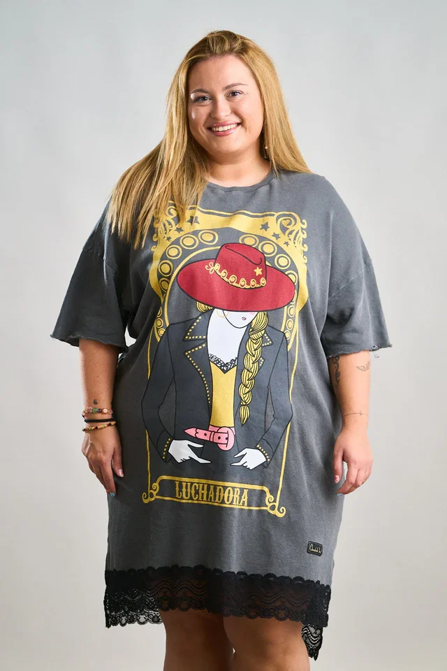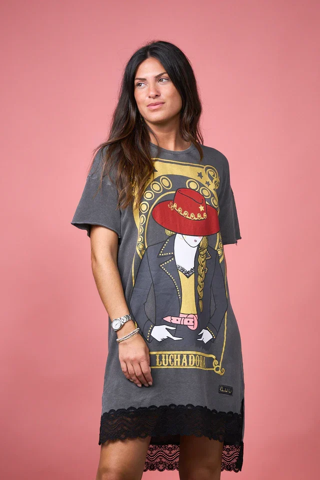 Un vestido ideal para quienes buscan un look casual con mensaje, perfecto para combinar con zapatillas o botines y expresar personalidad a través de la moda.