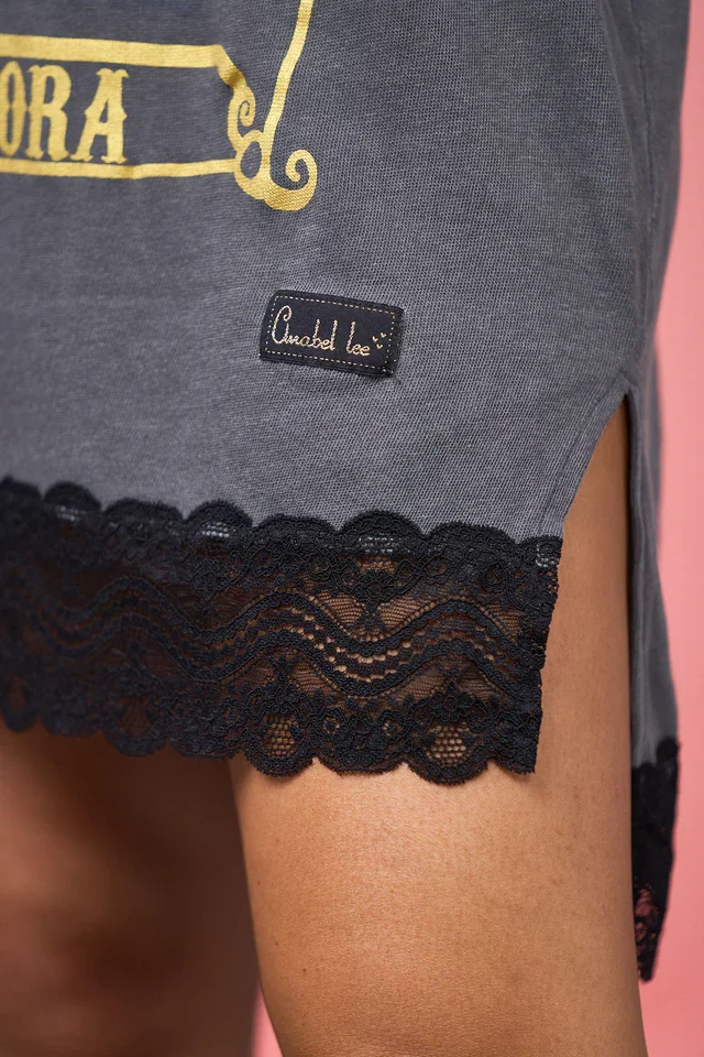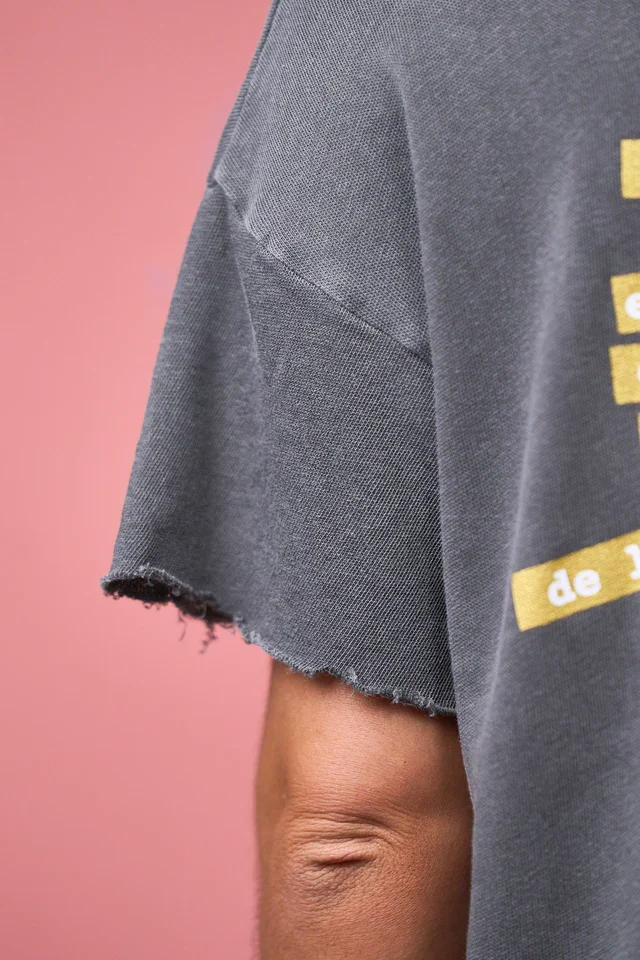 El vestido oversize con maxi print y mensaje inspirador es una prenda que combina comodidad, estilo y un toque de actitud única. Su diseño de manga corta y cuello redondo lo convierte en una opción versátil y fresca, perfecta para looks casuales con personalidad. El detalle de puntilla en el bajo con aberturas laterales y el acabado con efecto deshilachado en las mangas aportan un aire desenfadado y moderno que refuerza su estilo urbano.