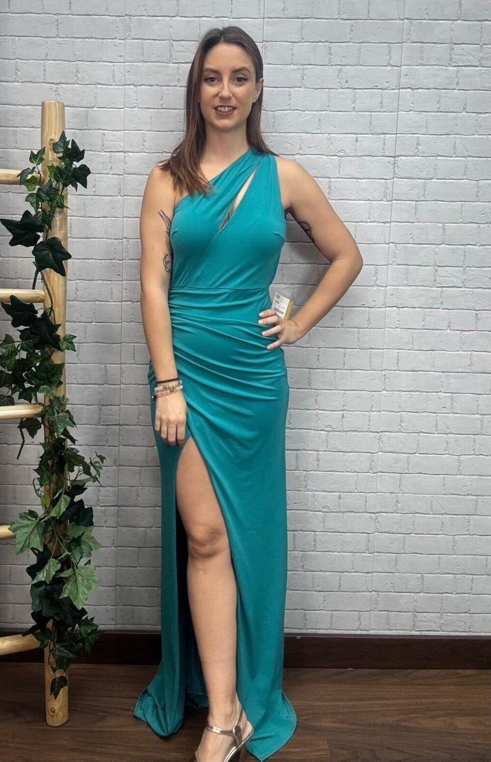 El vestido largo de escote asimétrico es una prenda elegante y sofisticada que destaca por su diseño moderno y su silueta femenina. Su escote asimétrico aporta un toque original y sensual, mientras que la espalda descubierta añade un aire de sofisticación ideal para eventos de noche, fiestas o celebraciones formales.